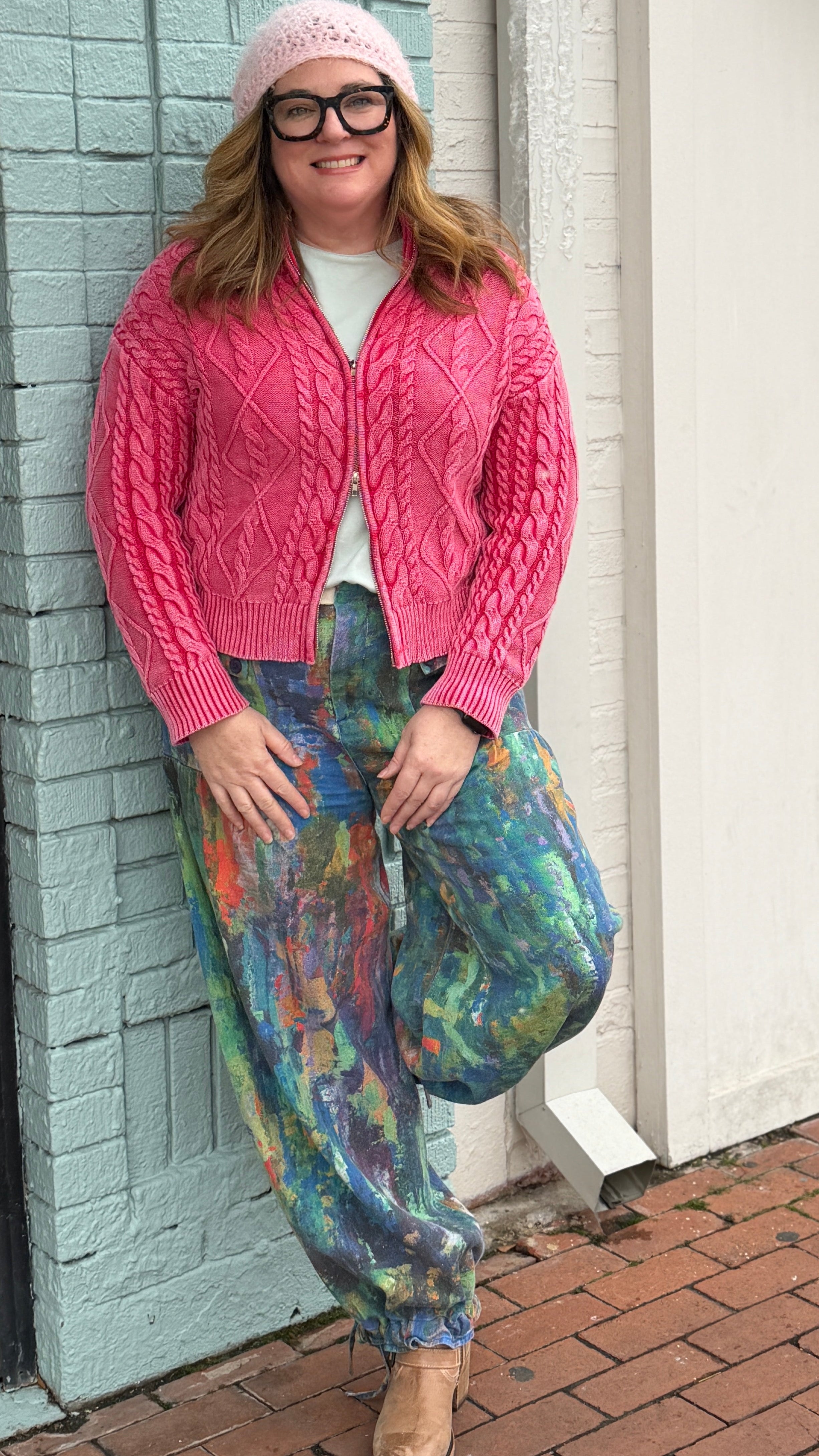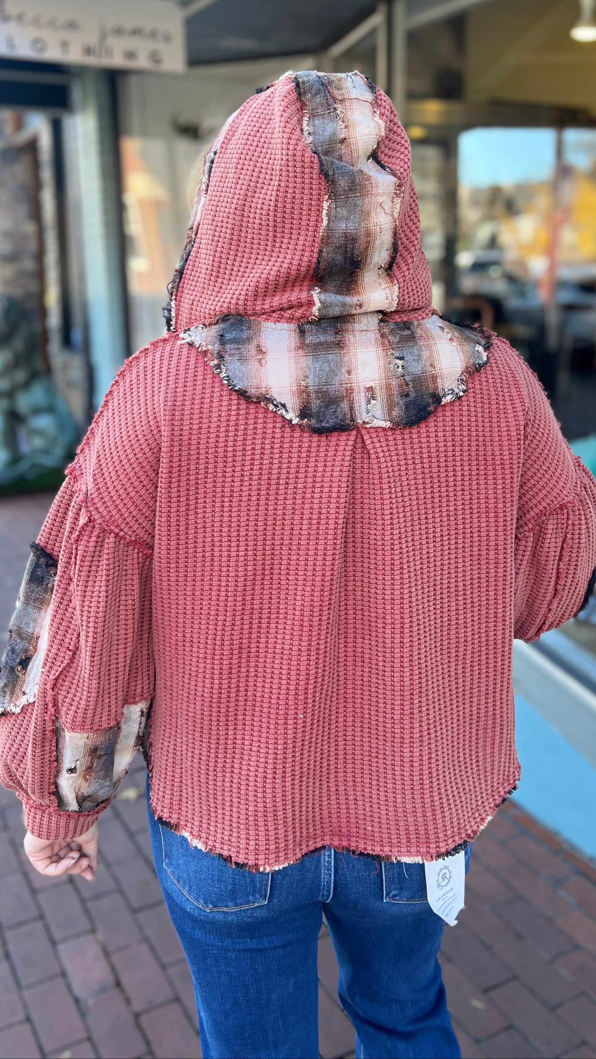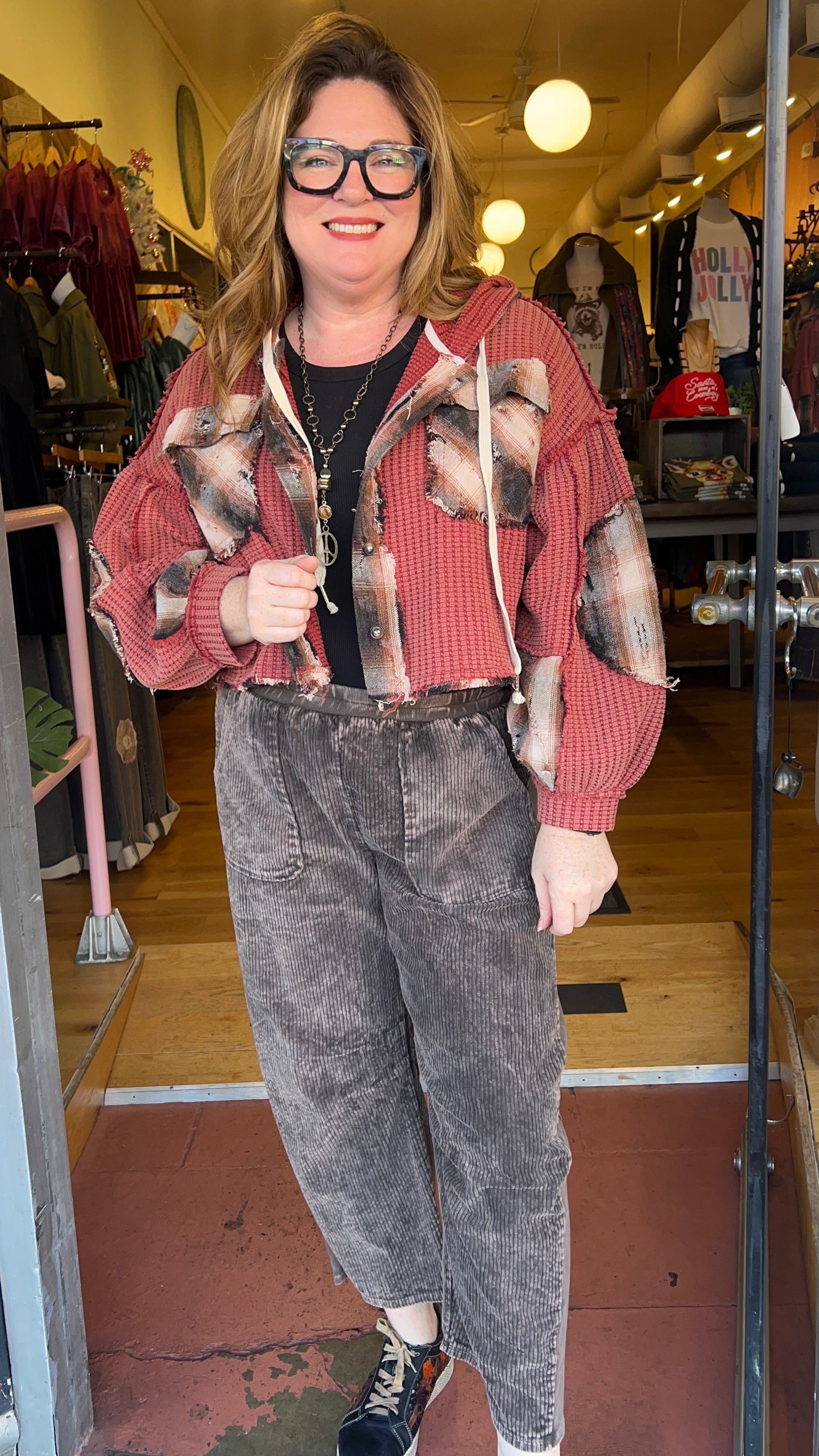 Vintage Wash Red Ballon Sleeve Thermal Knit Jacket