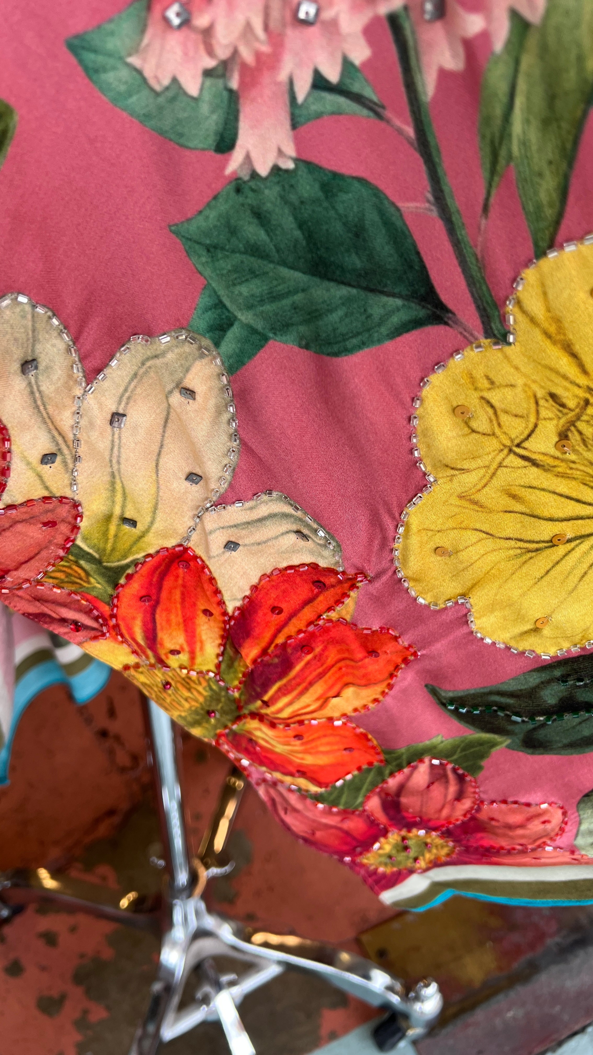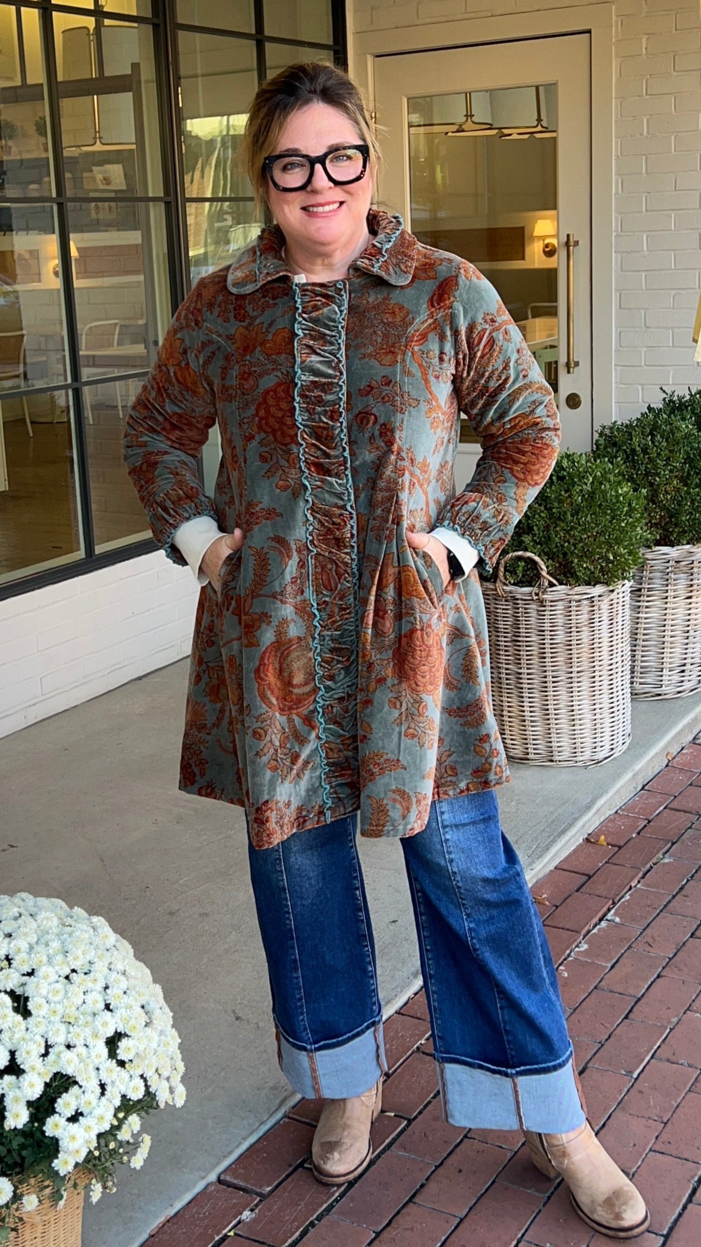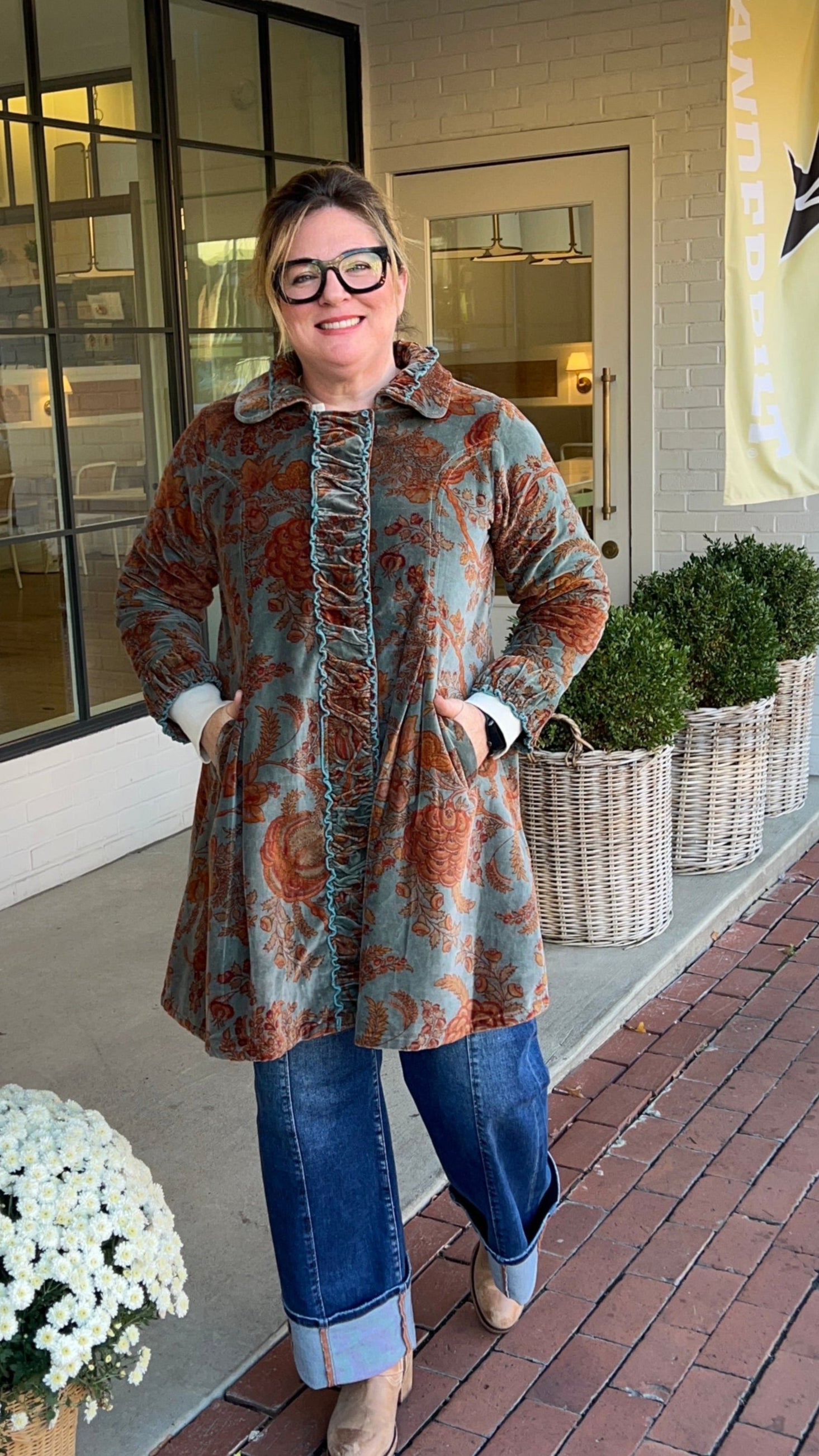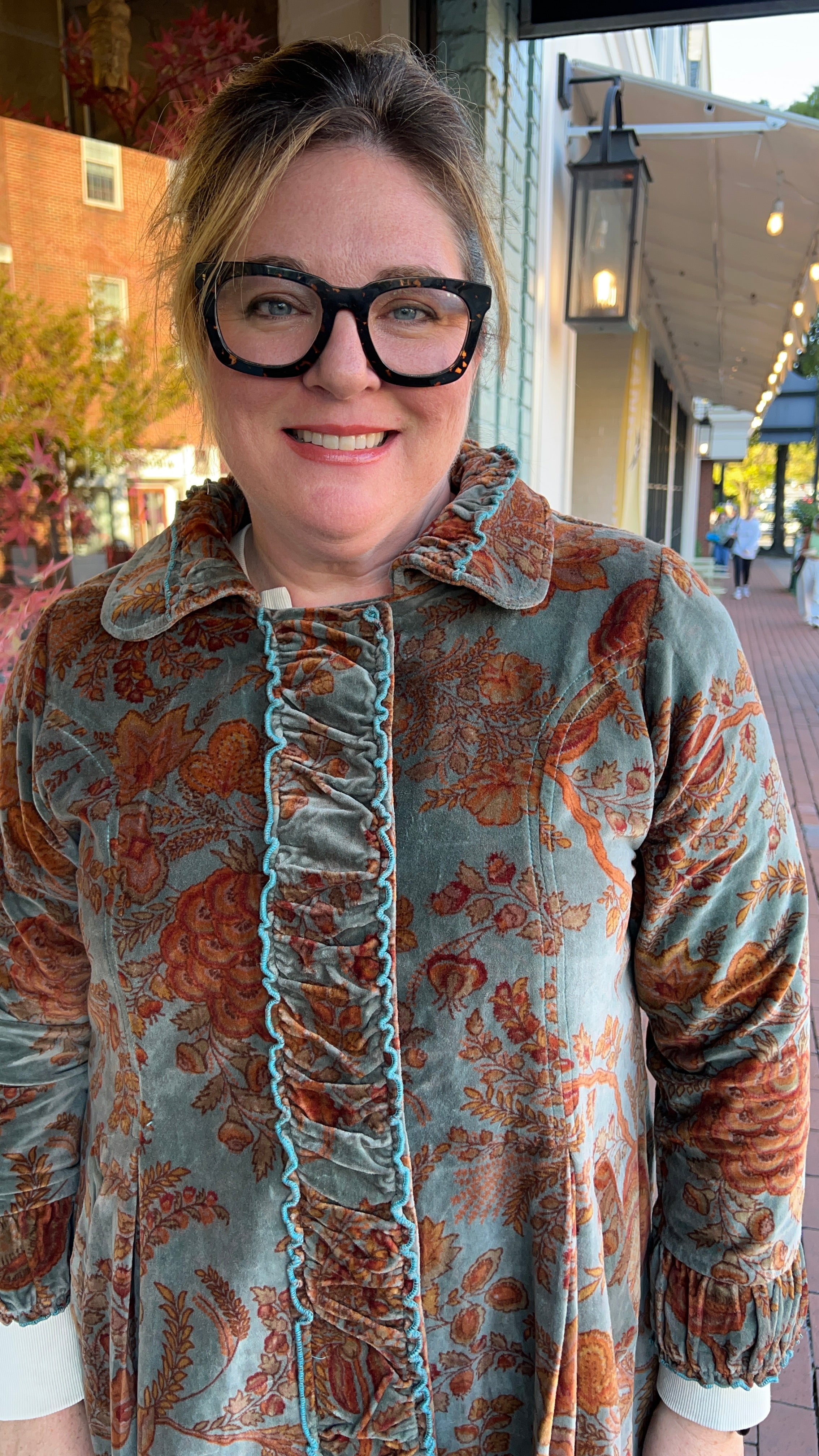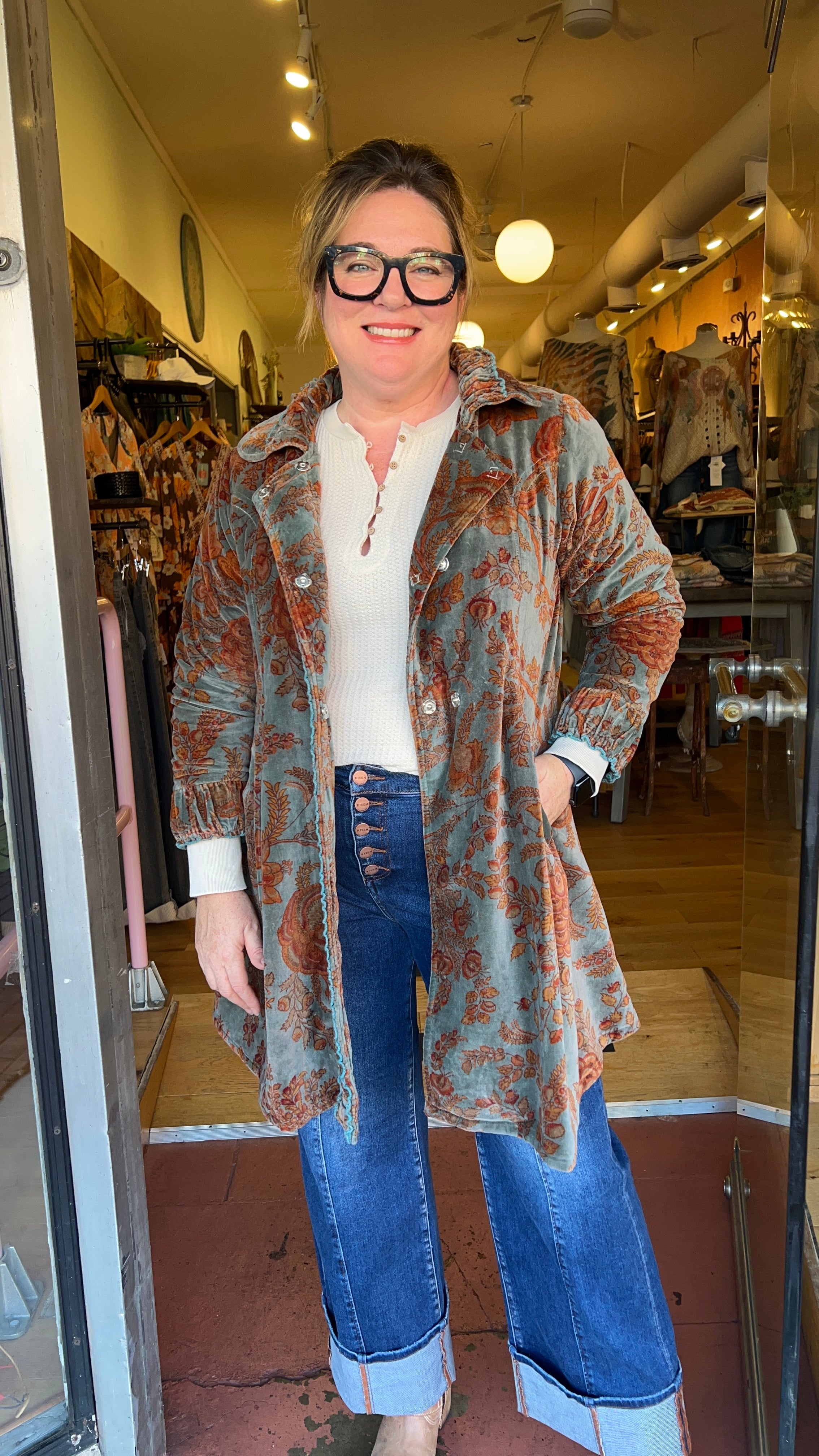 Teal and Rust Velvet Rusched Fit and Flare Coat