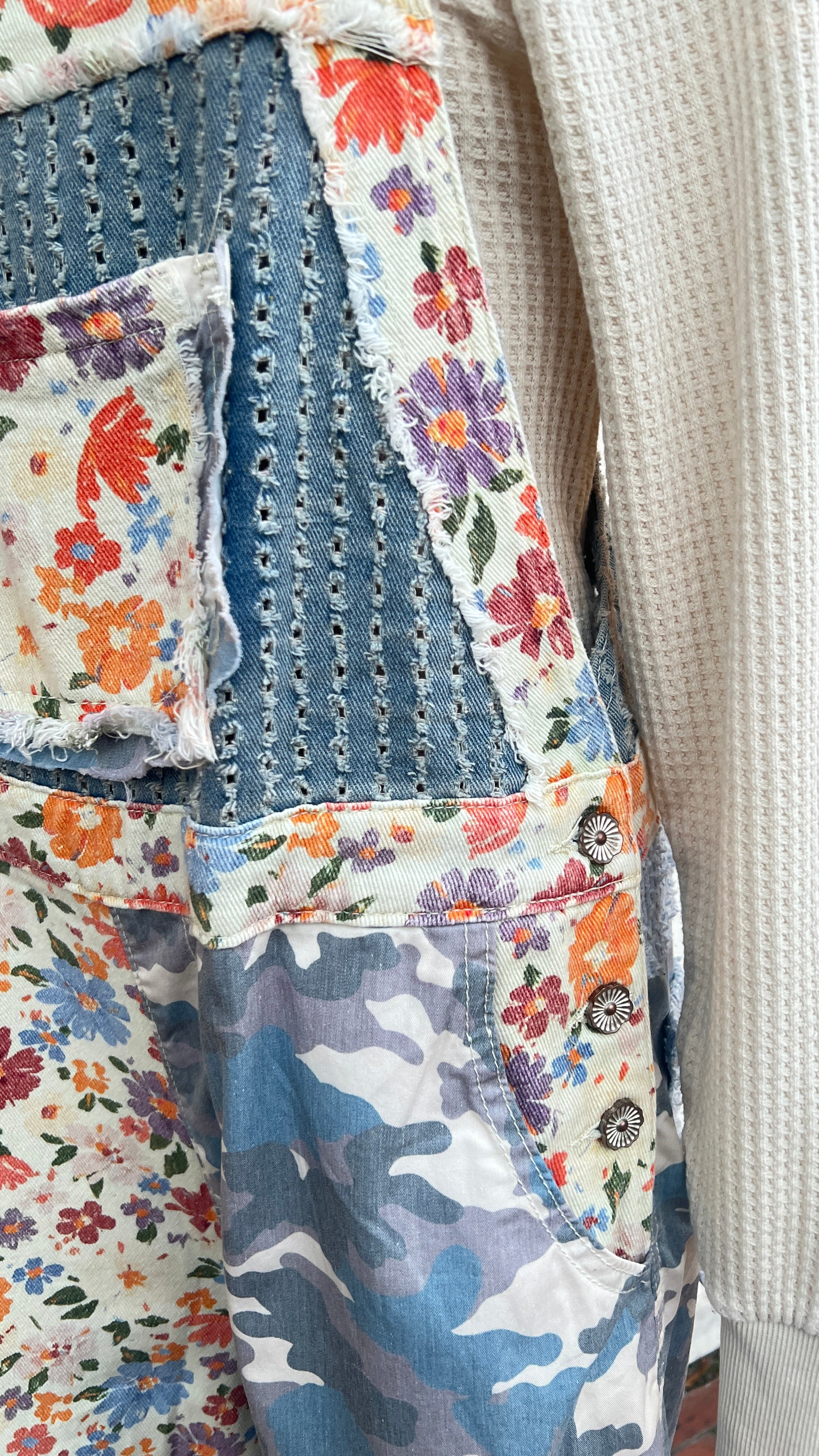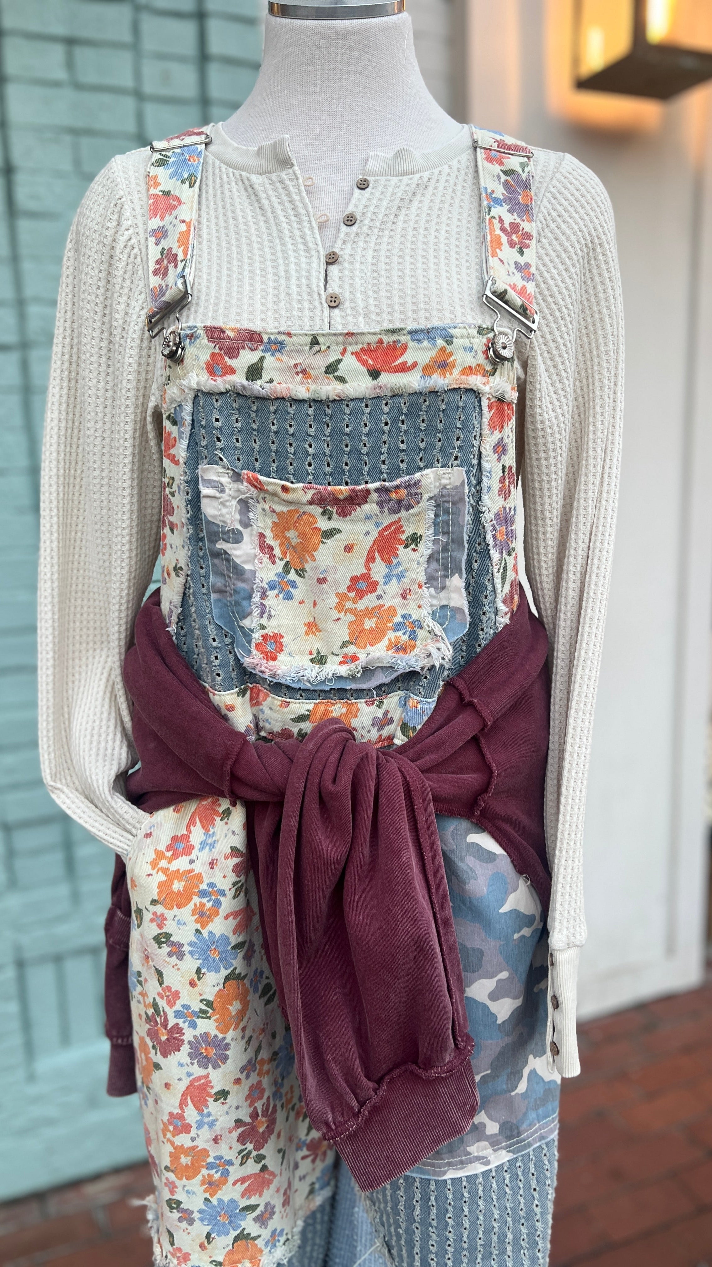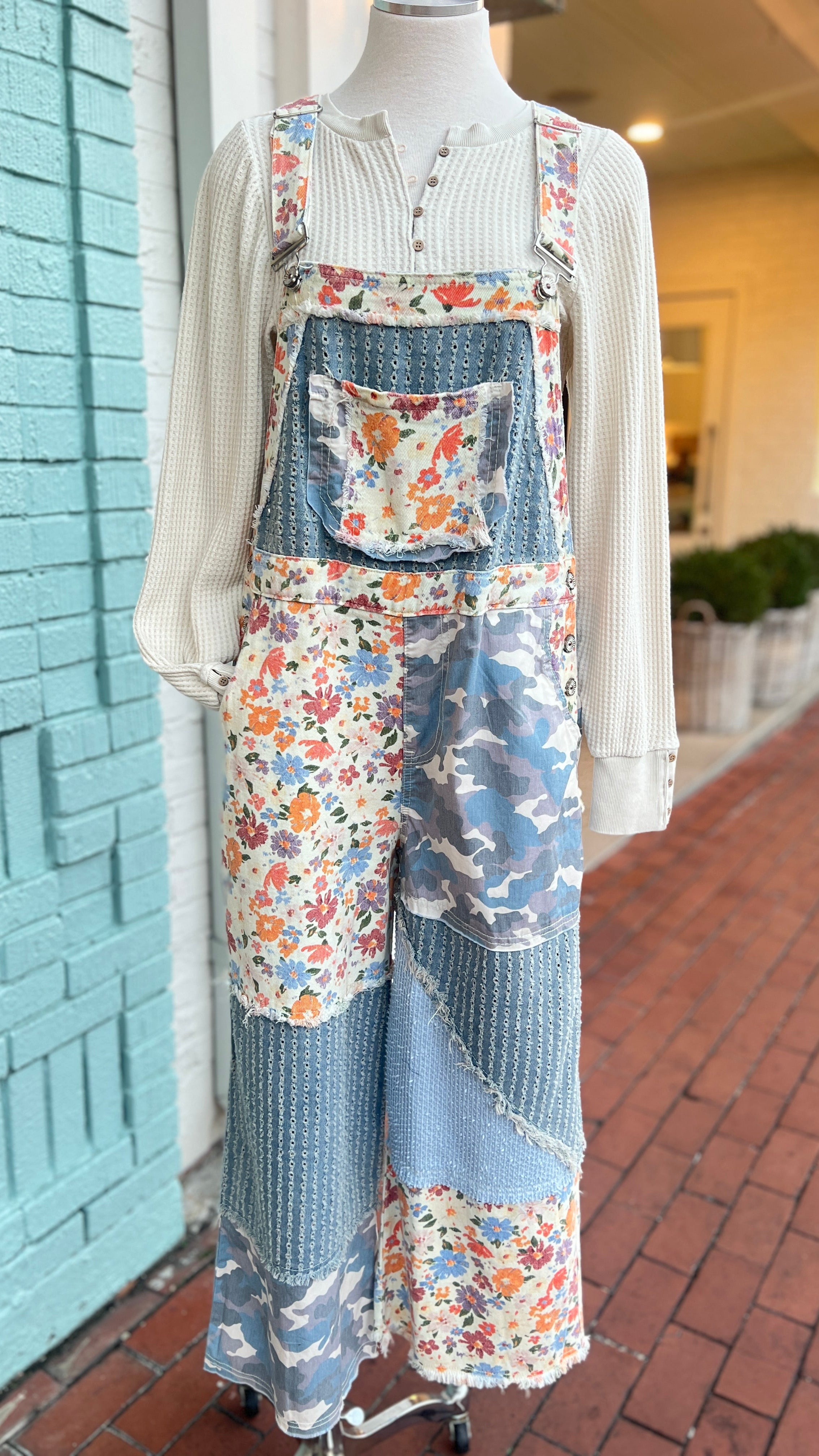 Boho Patchwork Floral & Camo Denim Overalls