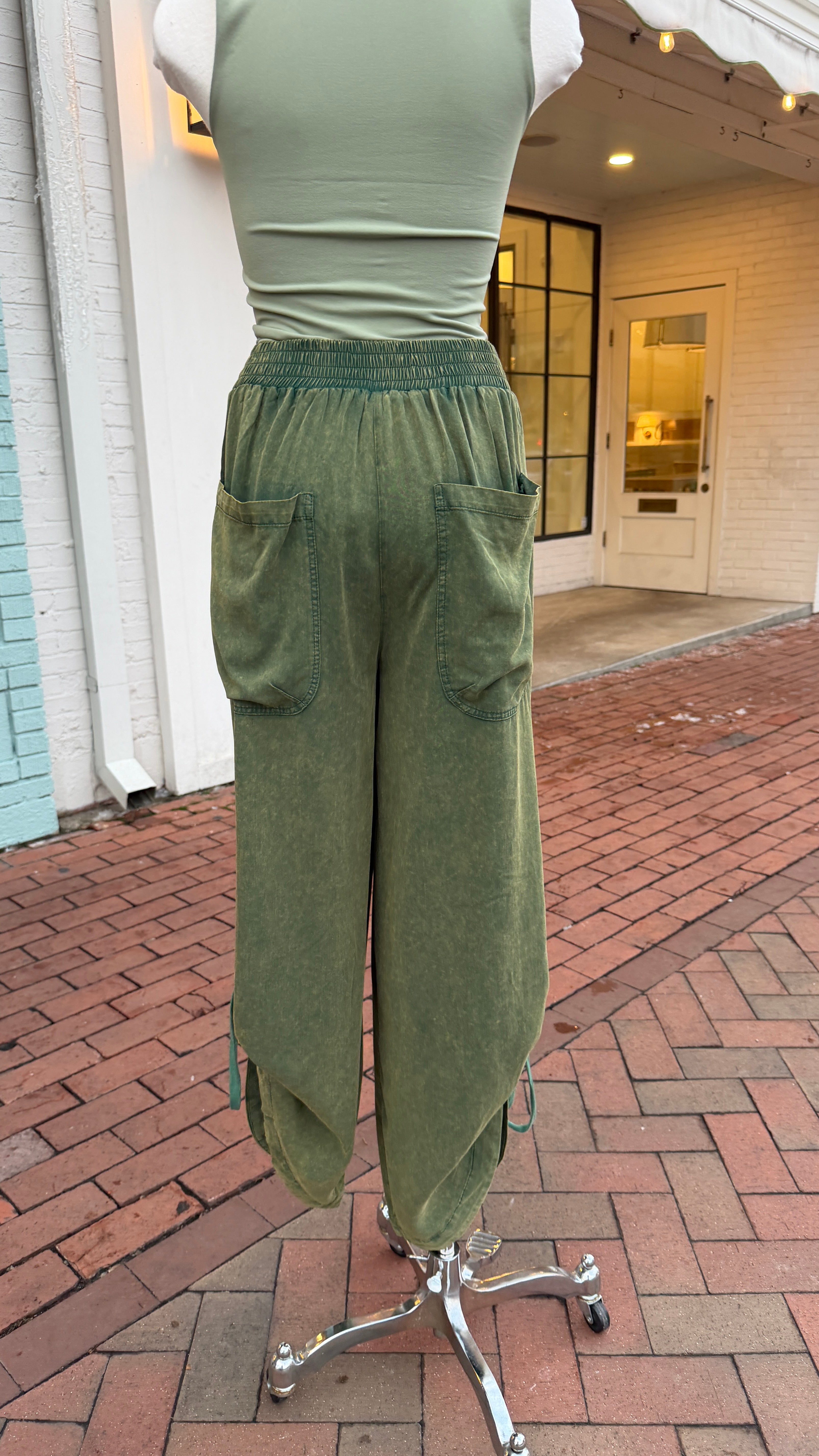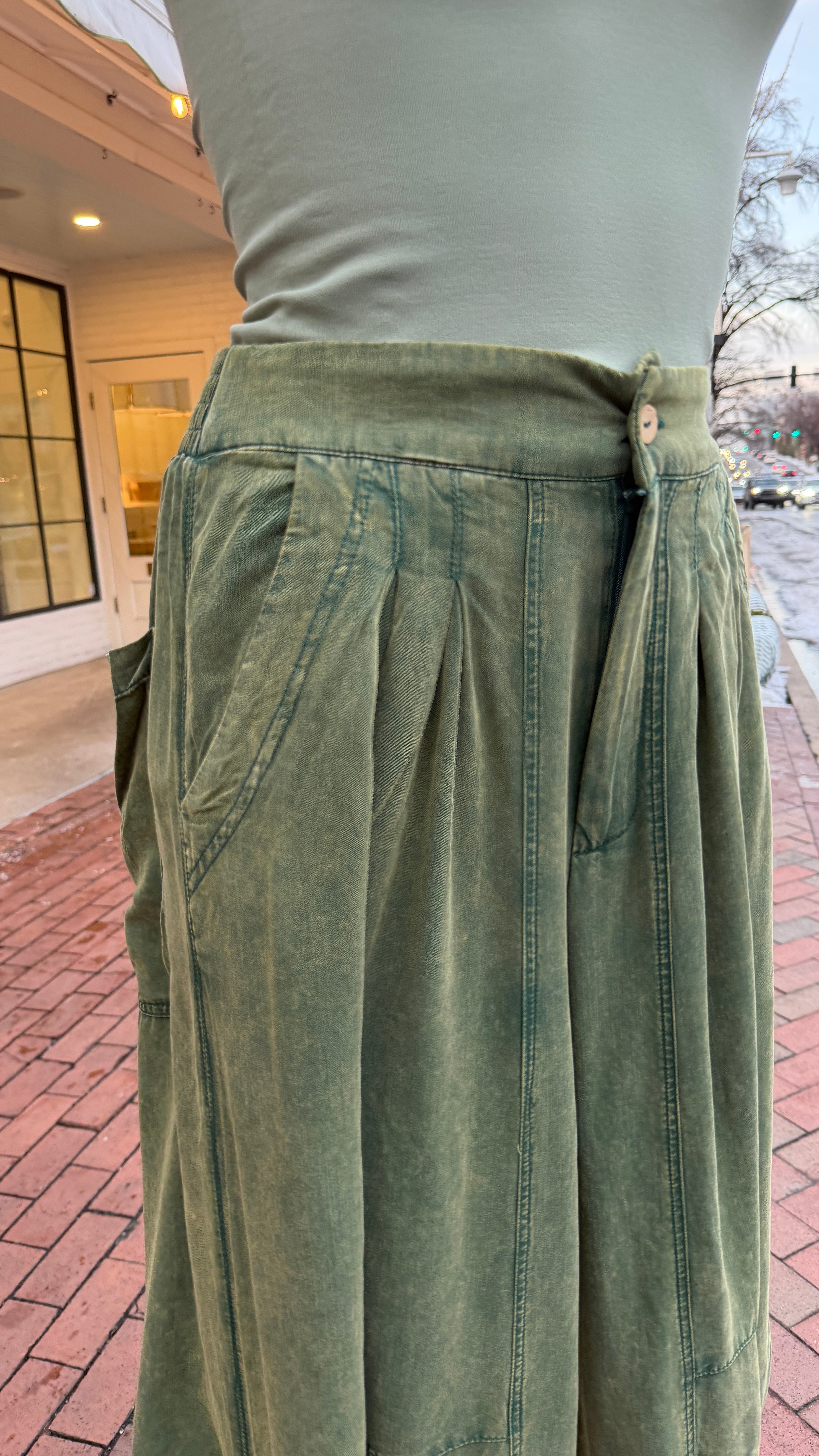 Willow Mineral Wash Ruched Wide Leg Pants – Olive Pleated Trousers