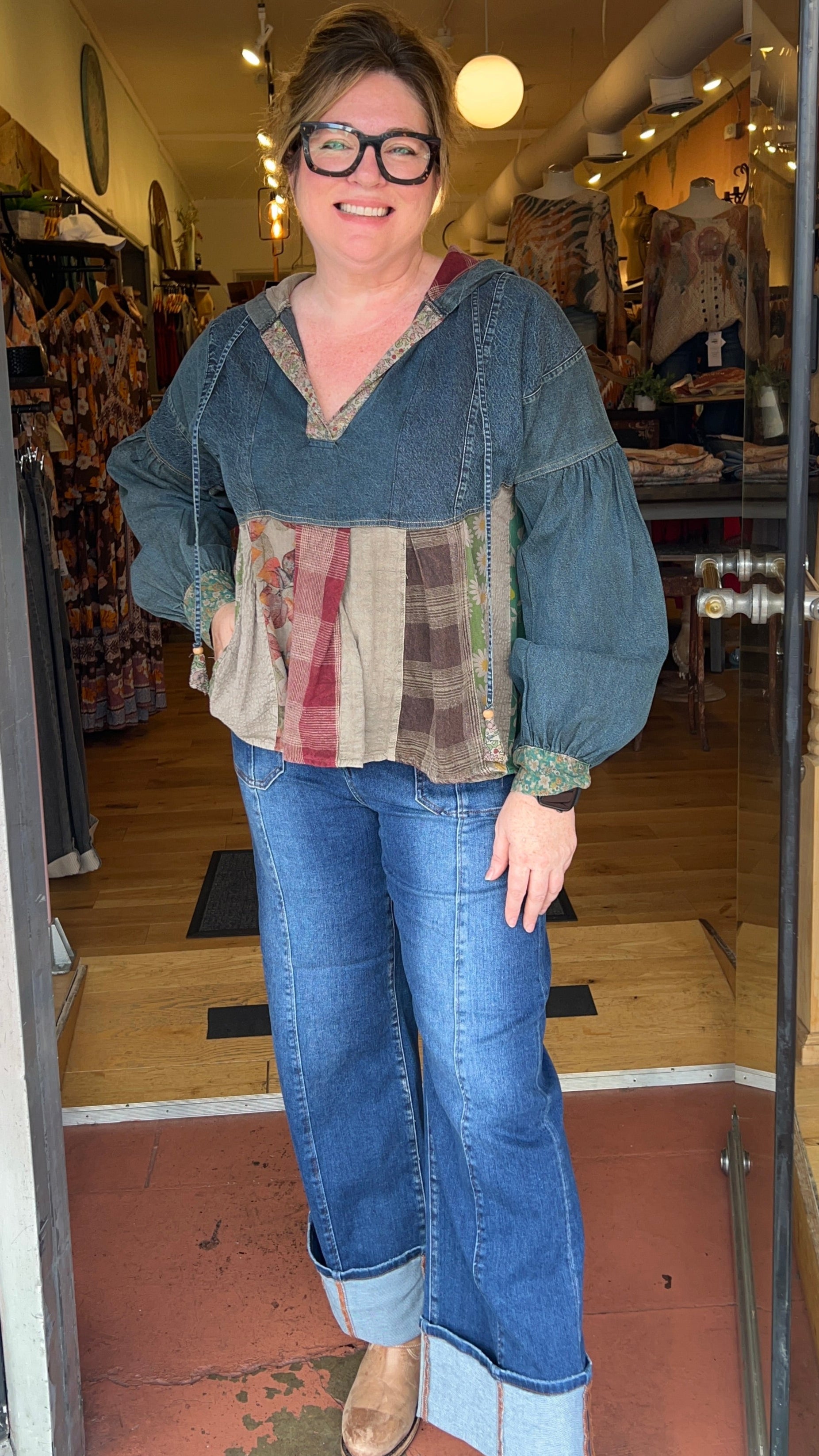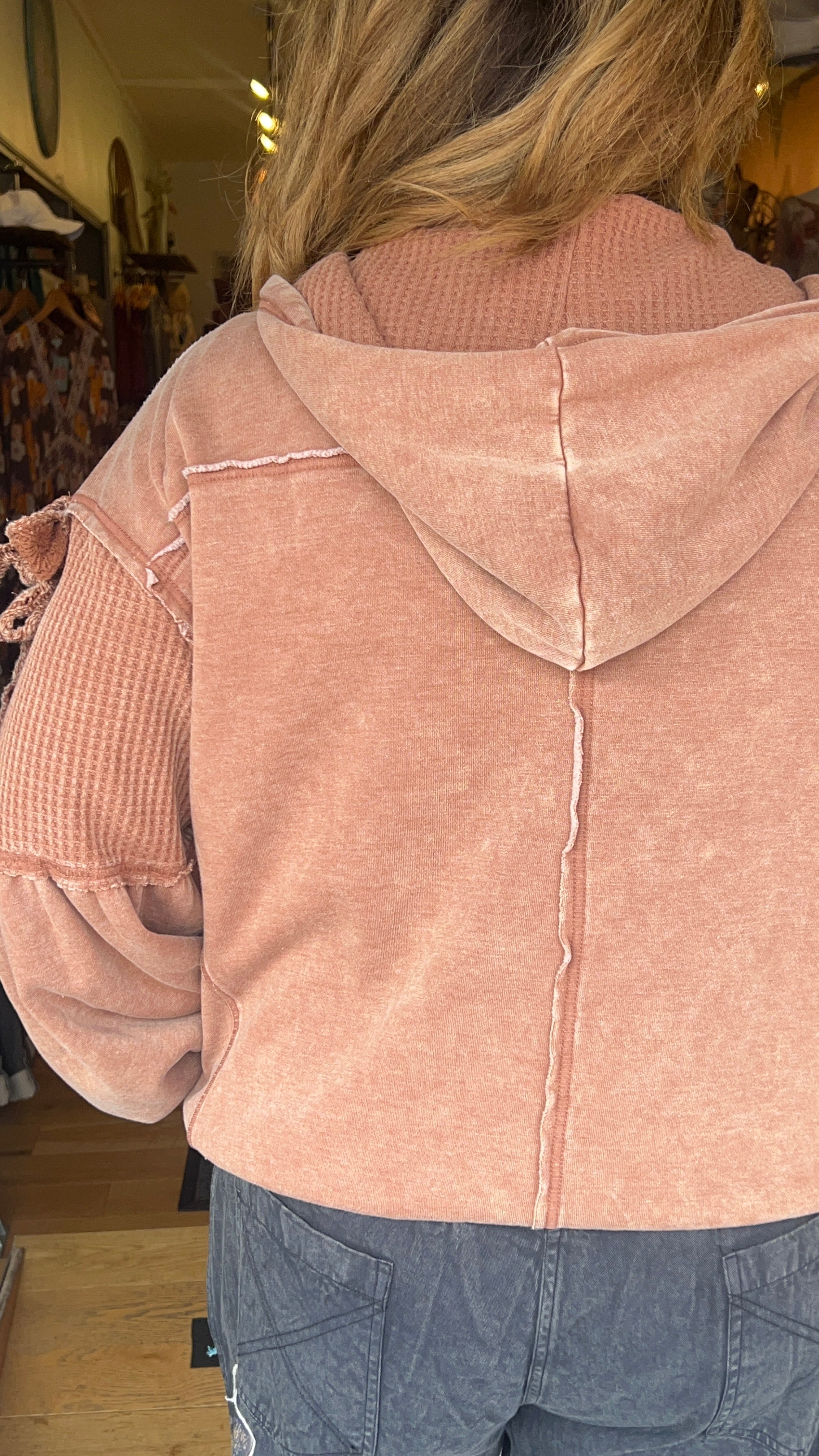 Cali Denim Ballon Sleeve Mixed Fabric Hoodie