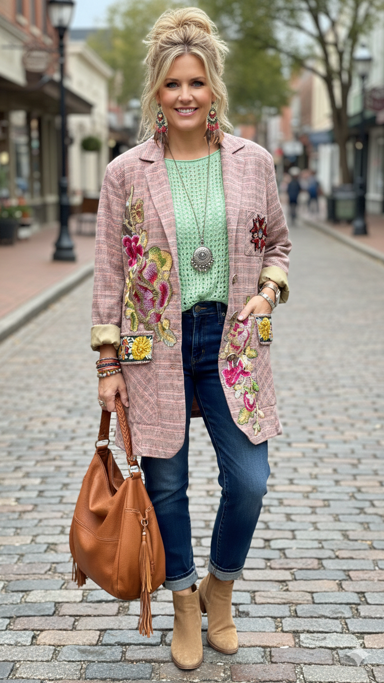 Aratta - Washed plaid button-up blazer with embroidered patches/trims & Royal patch on front, contrast velvet elbow patches, center back lining with Madame de Pompadour print