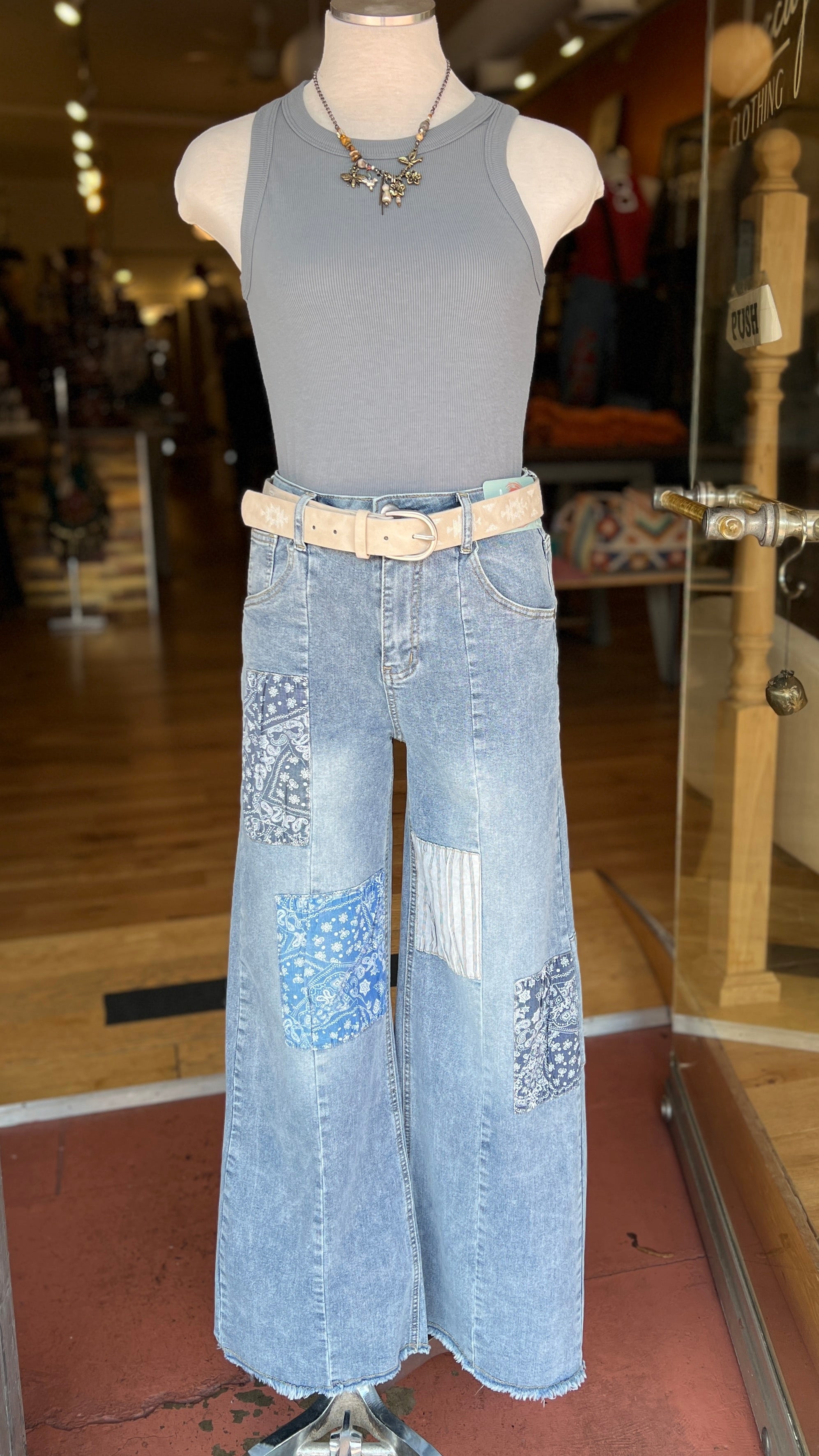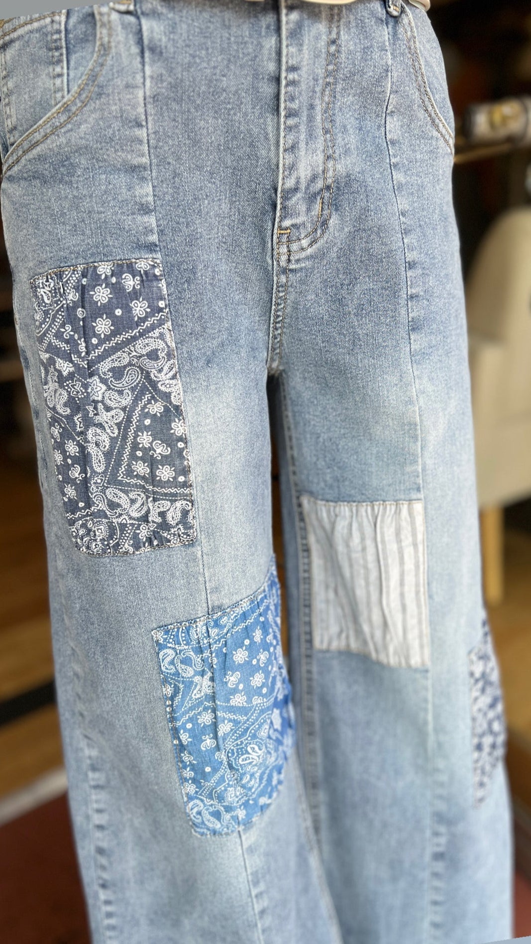 Trendy patchwork design with paisley, bandana, and stripe patches