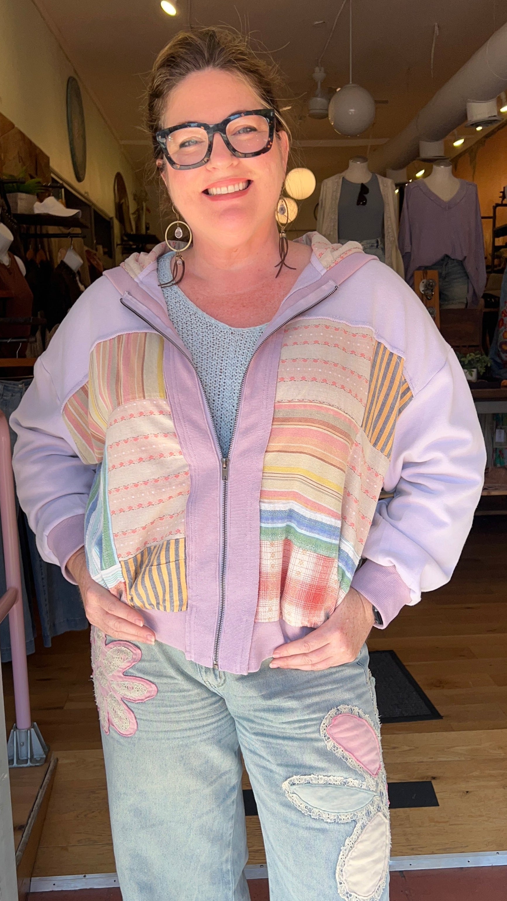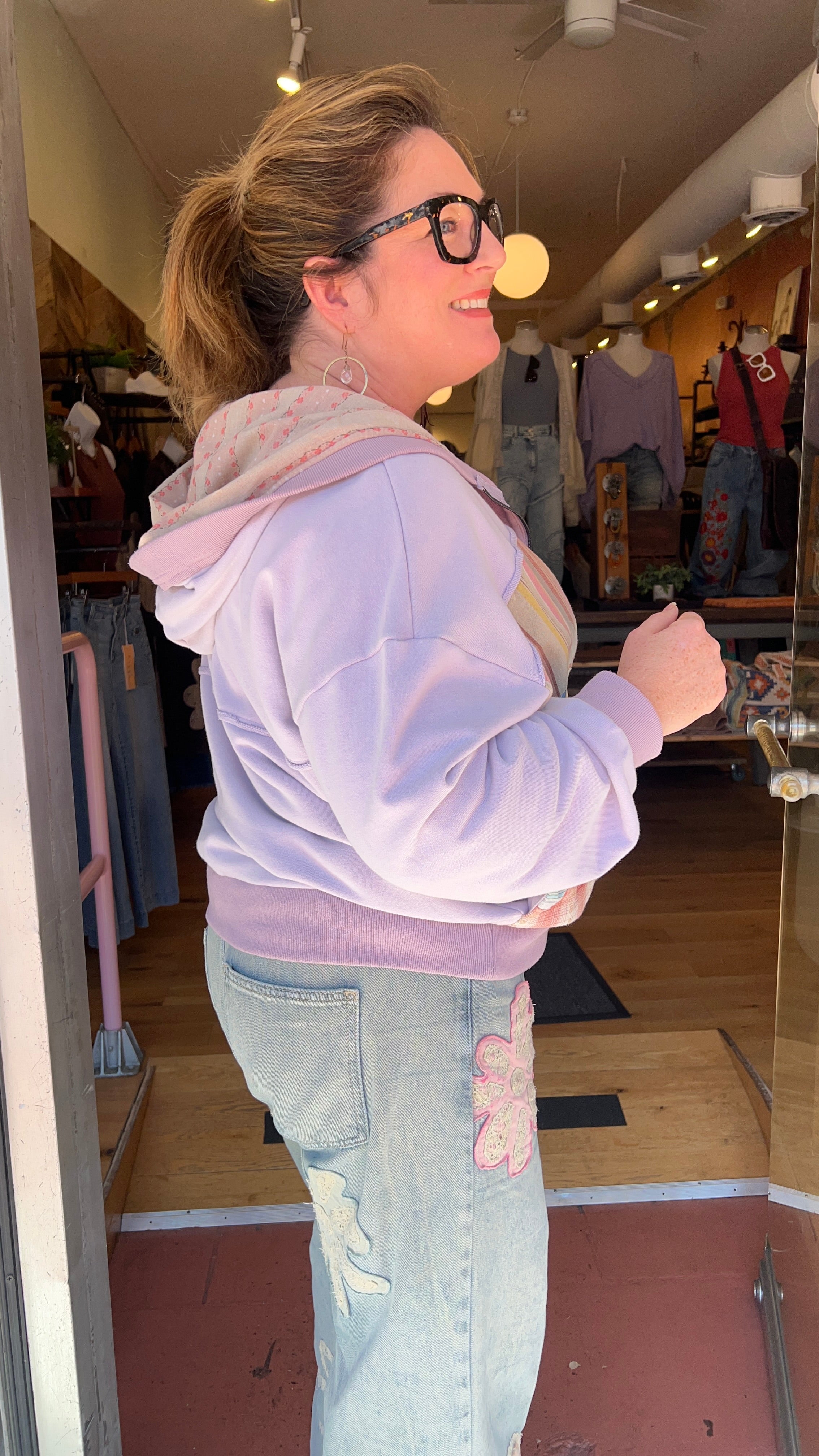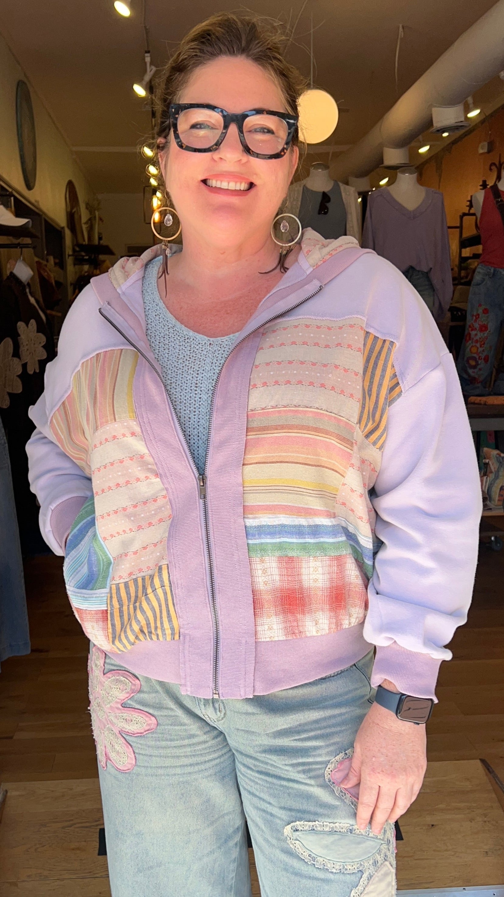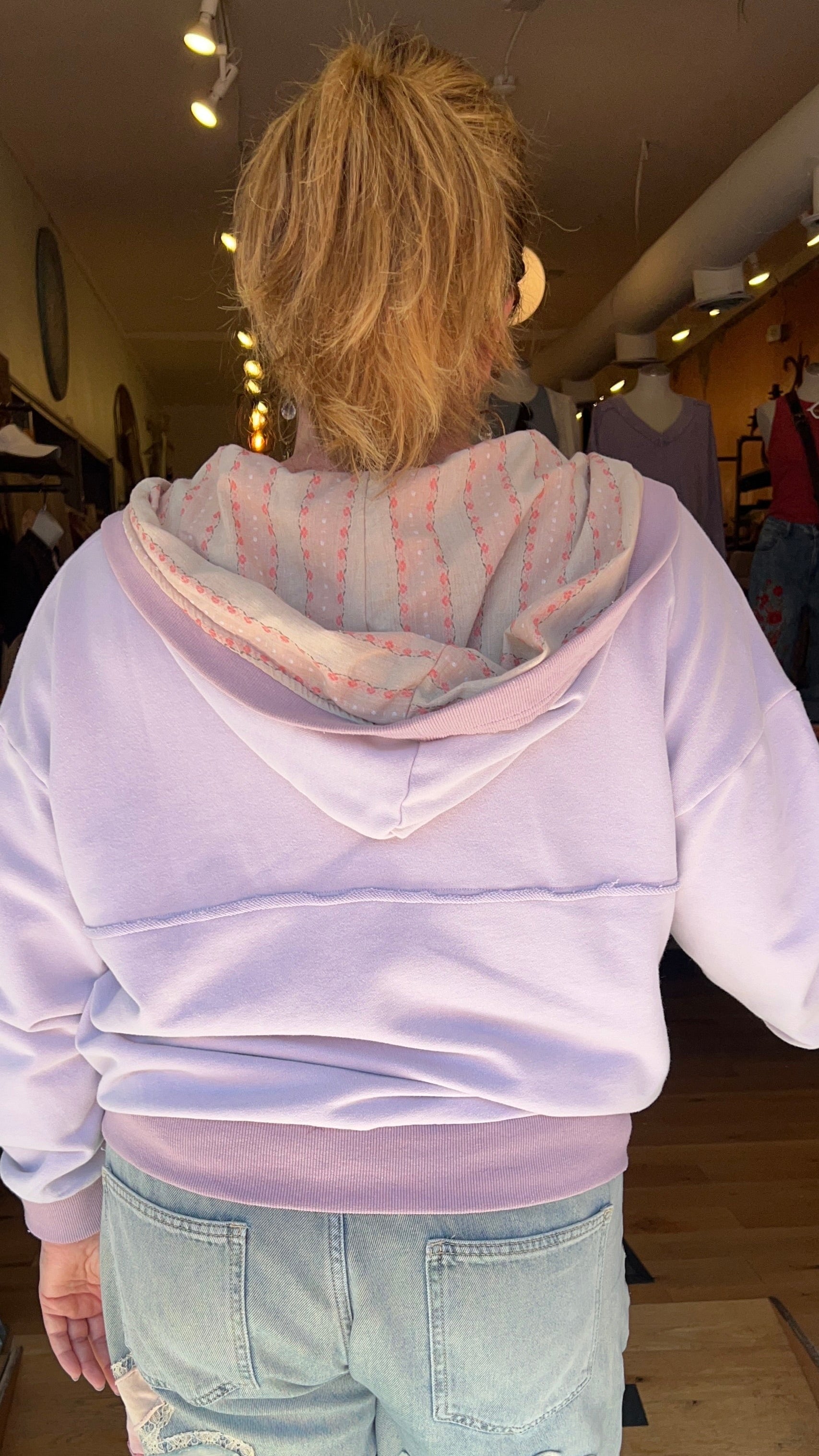 Lavender Zip Up Hoodie with Striped Contrast Fabric