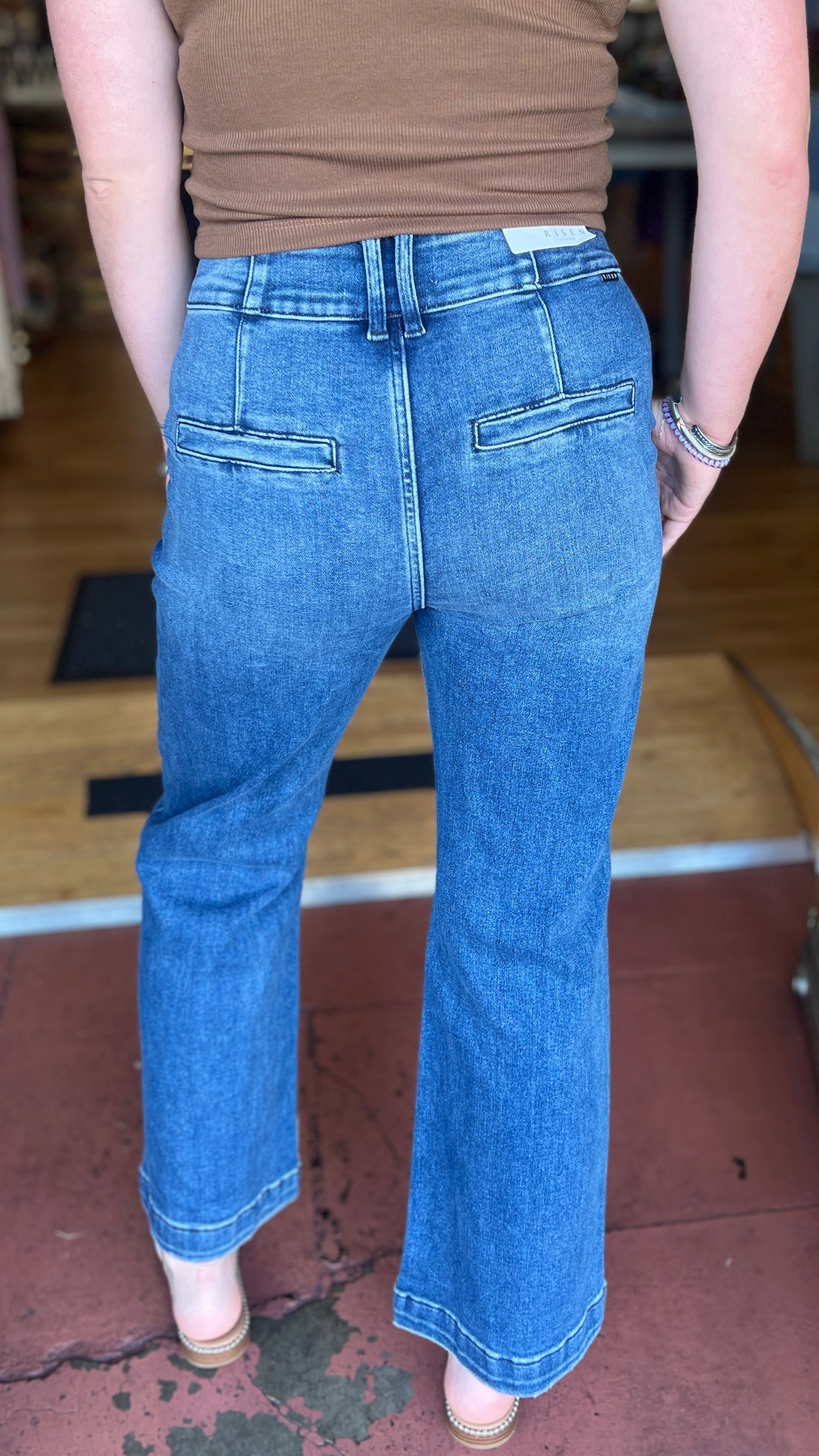 Double Button Tummy Control High Rise Cropped Boot Cut Jeans