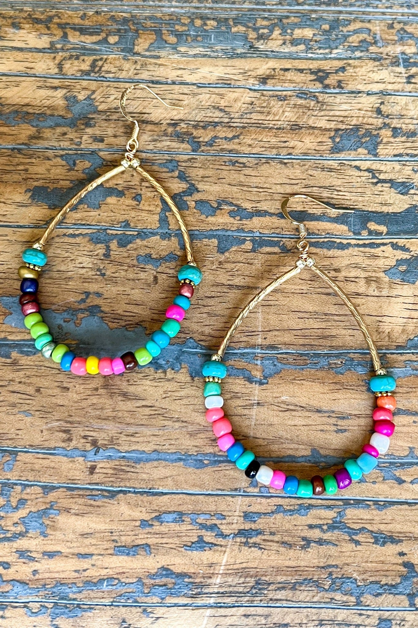 Spring Multi-Color Bead Teardrop Earrings – Lightweight Boho Beaded Hoops with Gold Detailing