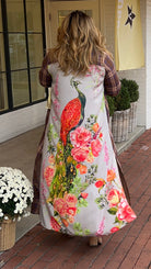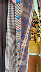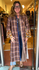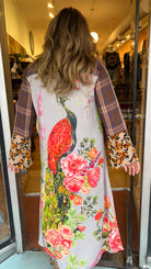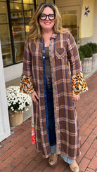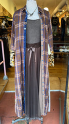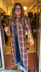 Meet your new statement piece — the Anna Duster in Chocolate Brown Plaid by Aratta. This long, flowy duster features a rich brown plaid base trimmed in royal blue velvet along the button placket, finished with Aratta’s signature detailed buttons and a touch of sparkle from crystal accents. The hand-painted peacock artwork on the back adds an unforgettable boho-luxe finish that makes this piece truly one-of-a-kind.