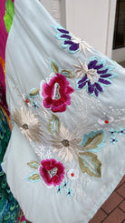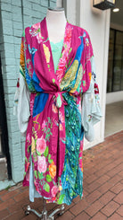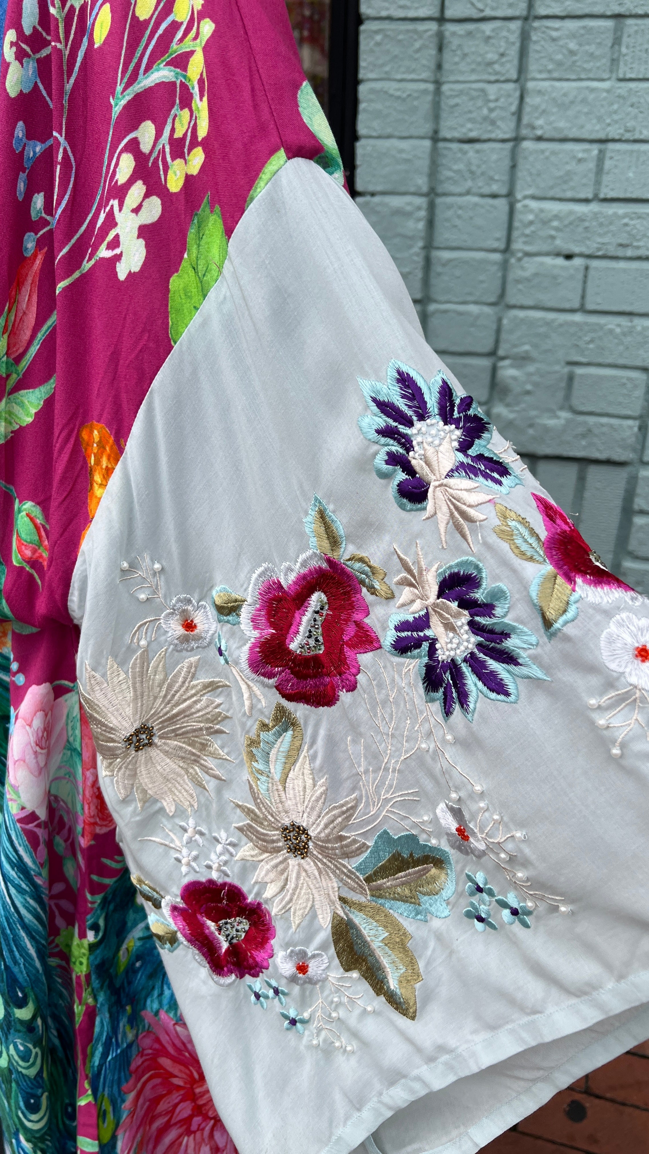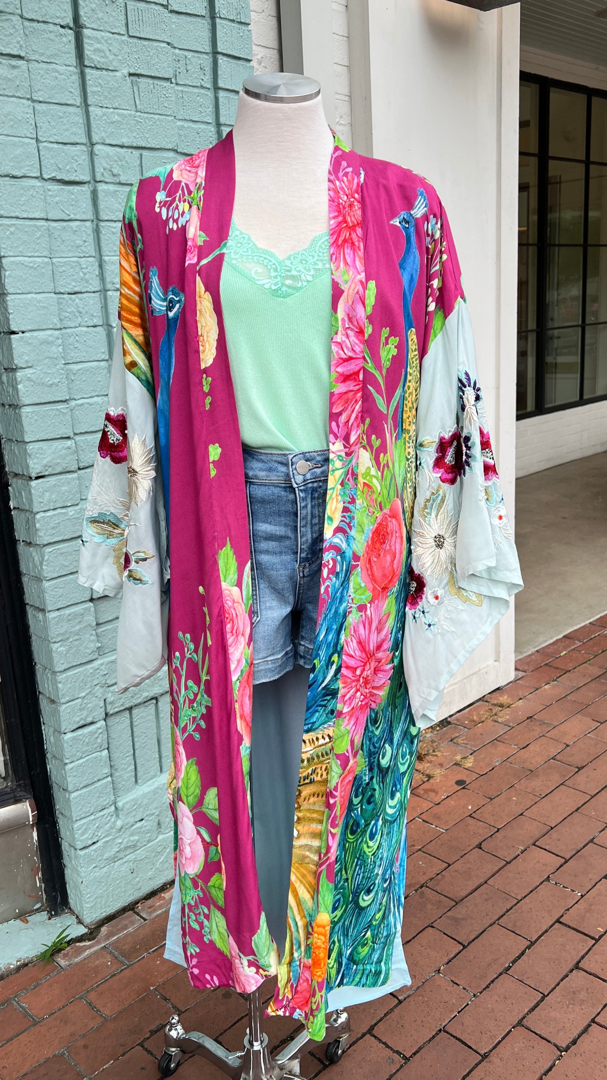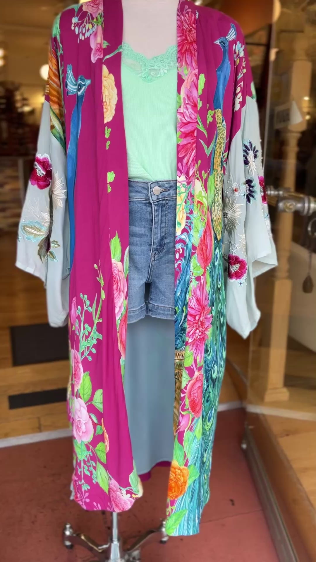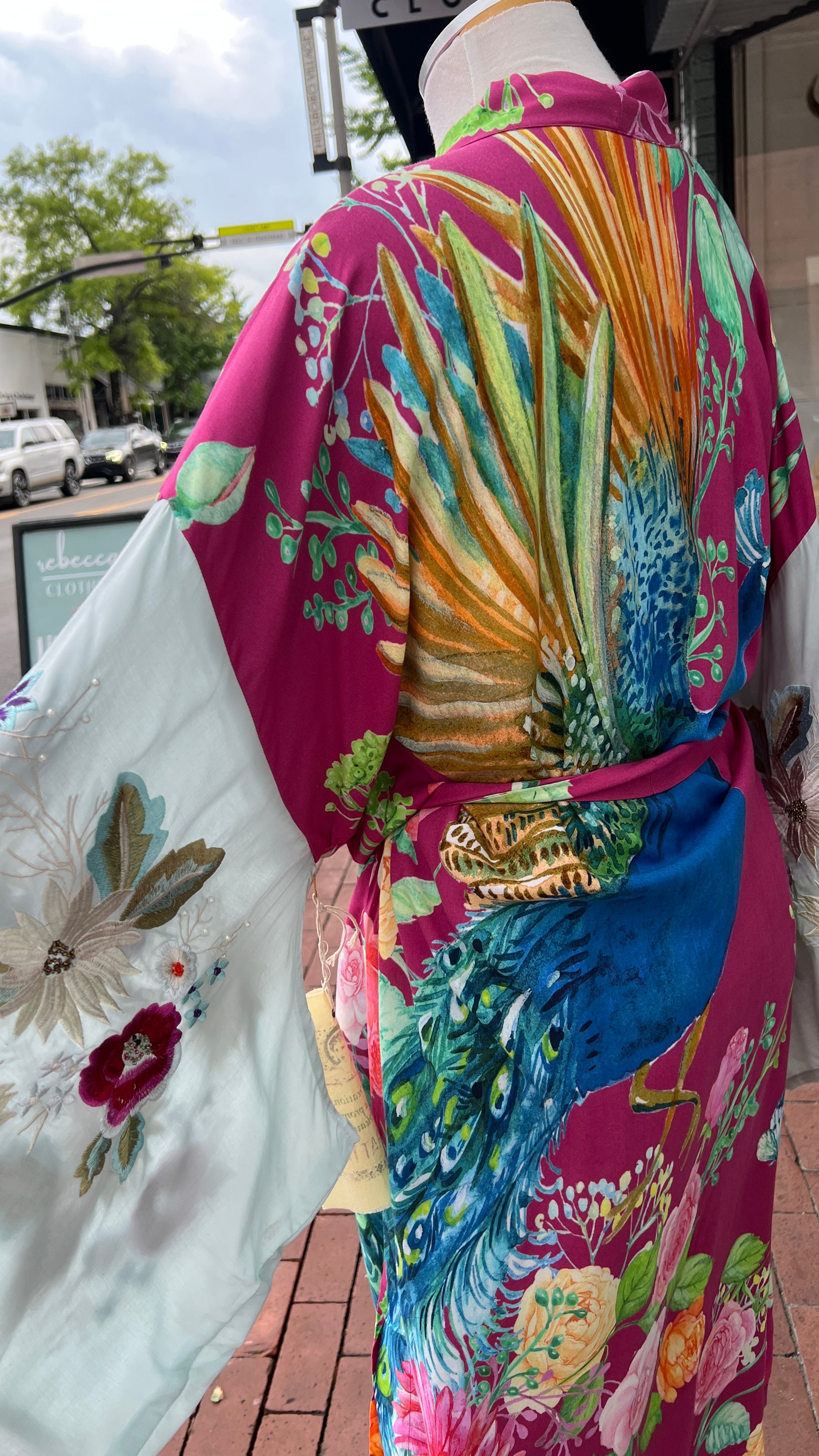 The Peacock and Floral Belted Kimono by Aratta is a stunning, heirloom-worthy piece that captures the essence of boho romance and artisanal detail. Crafted from 100% rayon, this fully lined kimono features a dreamy lavender and slate peacock floral print, paired with beautifully embroidered floral sleeves for a look that's as elegant as it is unforgettable.