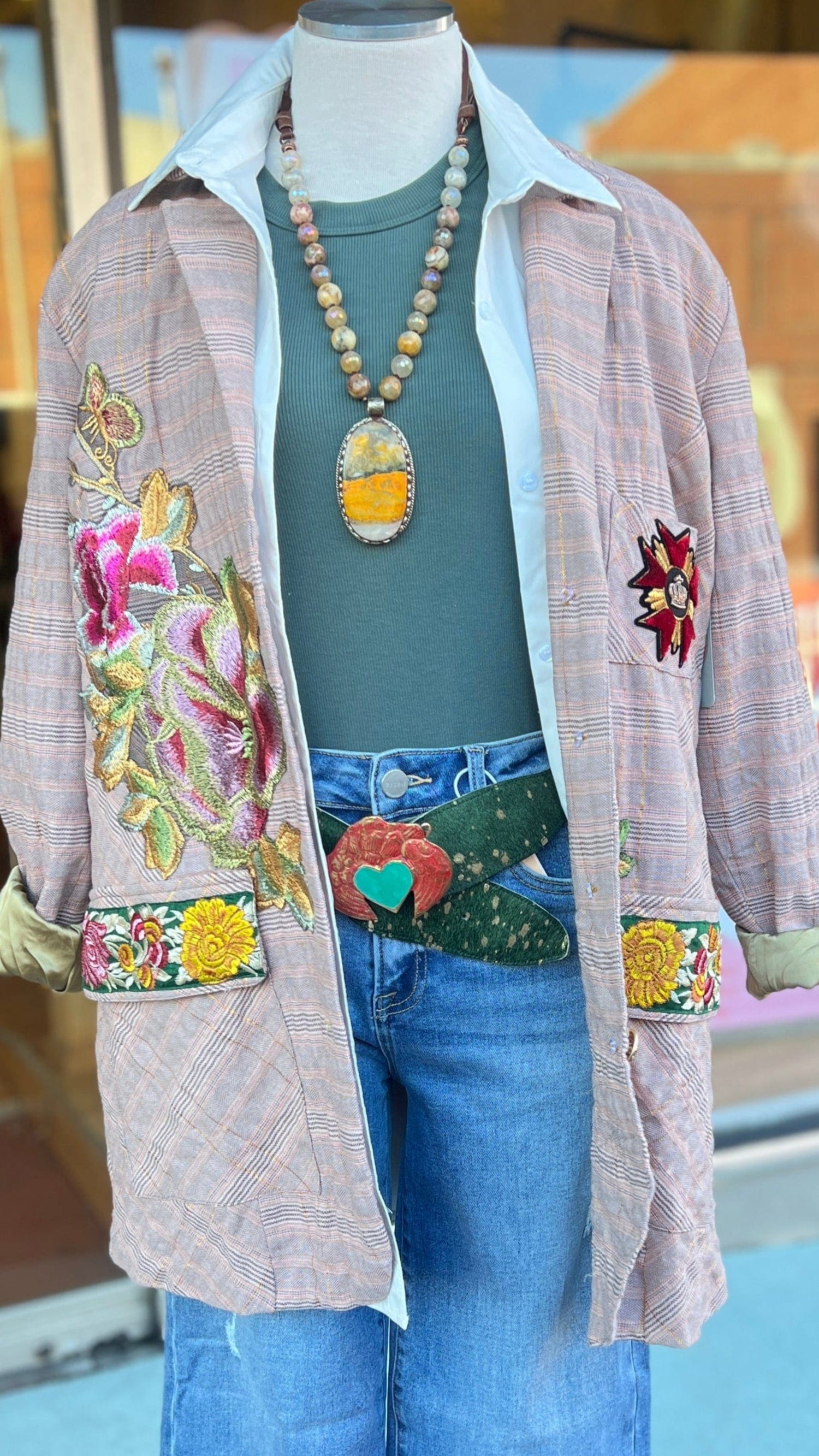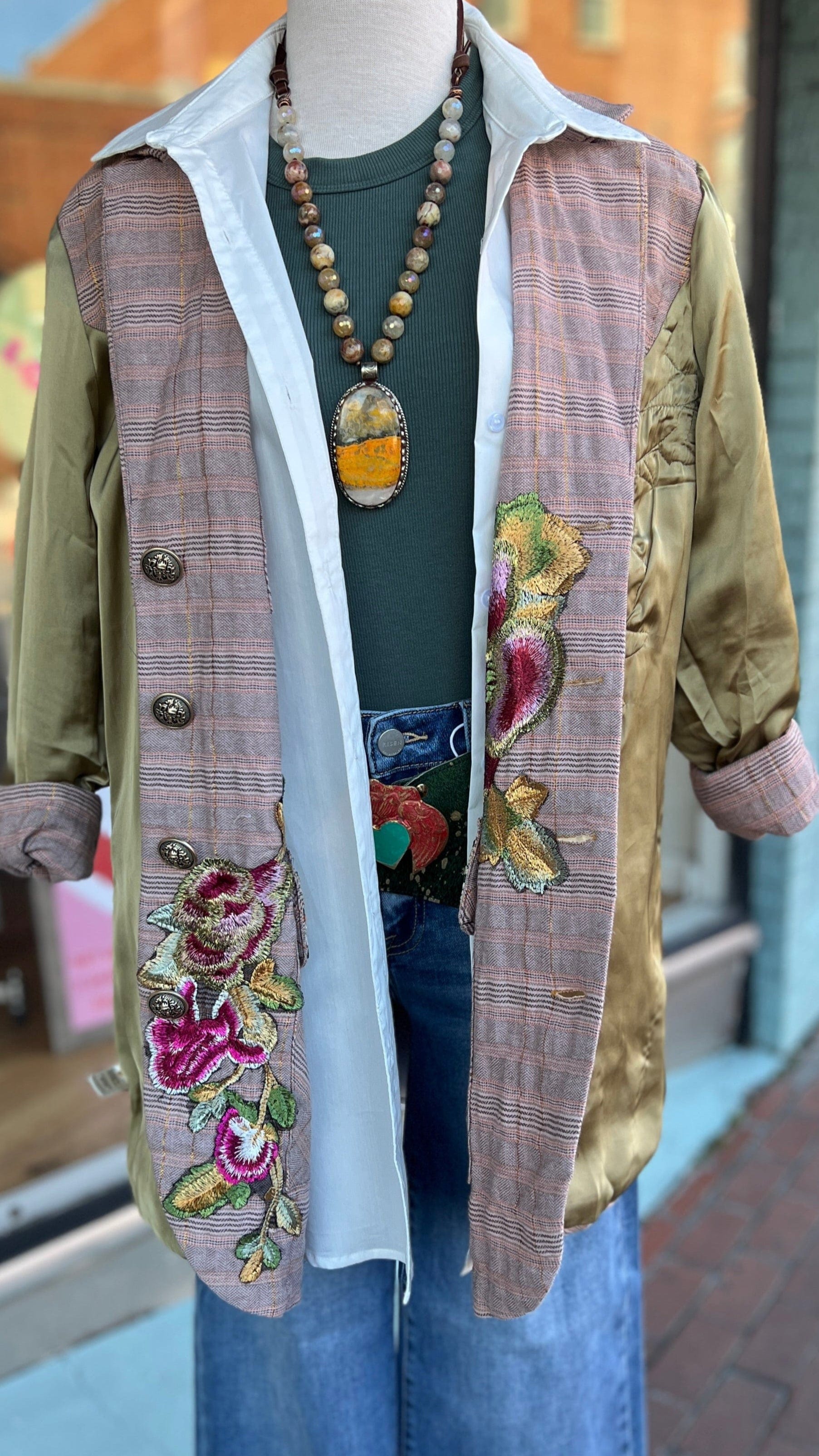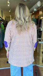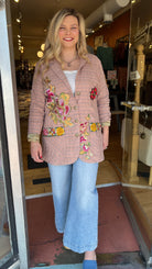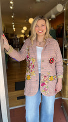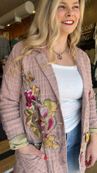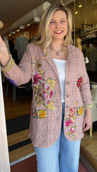 Aratta - Washed plaid button-up blazer with embroidered patches/trims & Royal patch on front, contrast velvet elbow patches, center back lining with Madame de Pompadour print