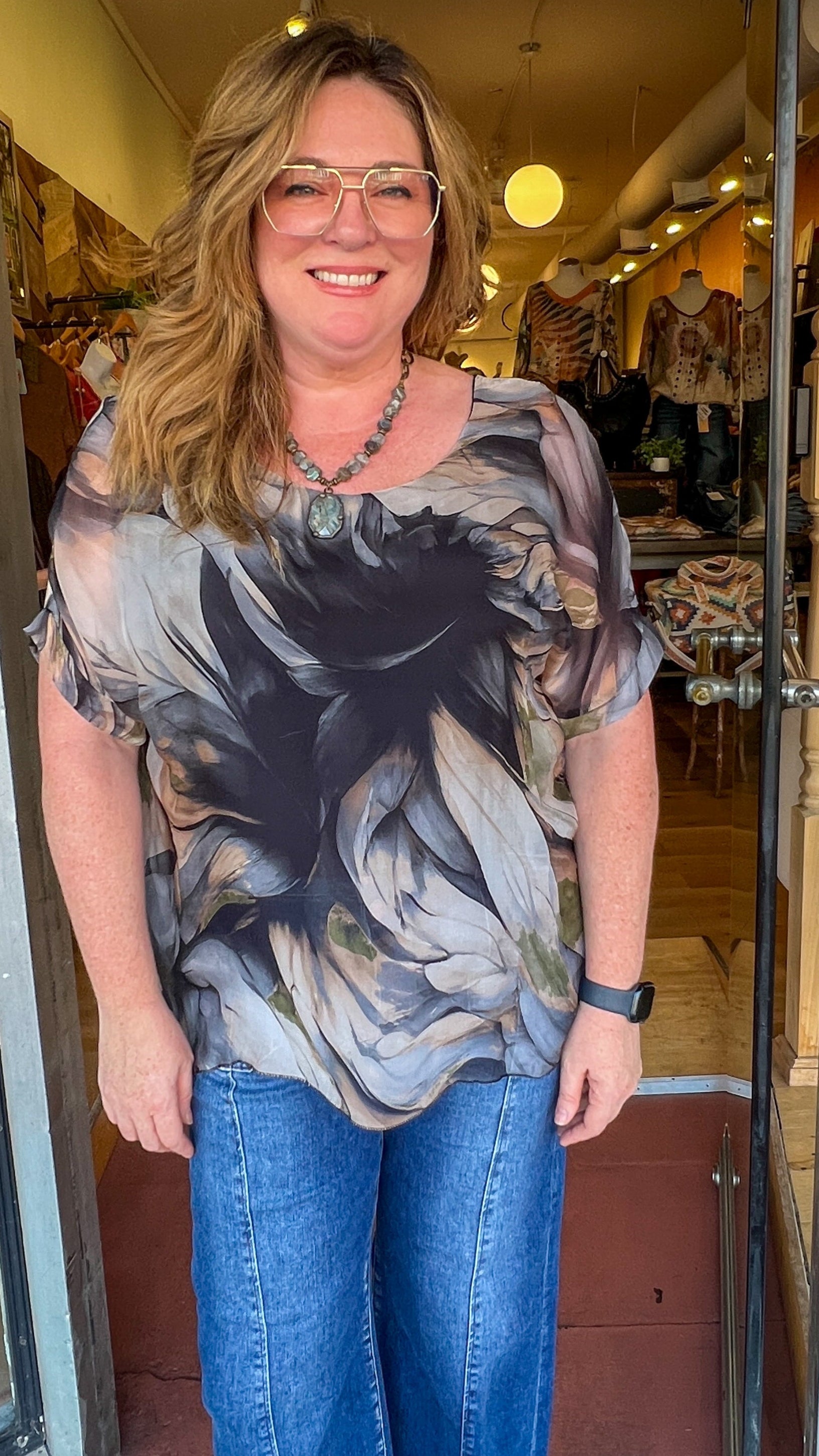 The Smoky Magnolia Silk Top takes the same luxurious Italian silk fabric from our best-selling dress and transforms it into a versatile blouse. With its flowy silhouette, cuffed short sleeves, and tie-back detail across the shoulder blades, this top is as flattering as it is unique. Designed in shades of black, blue, tan, and green, it feels like wearable art while remaining lightweight and easy to style. One size fits most (4–16), making it a perfect statement piece for everything from workdays to evening outings. Pair it with denim for casual chic or tailored pants for an elevated look.