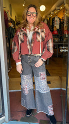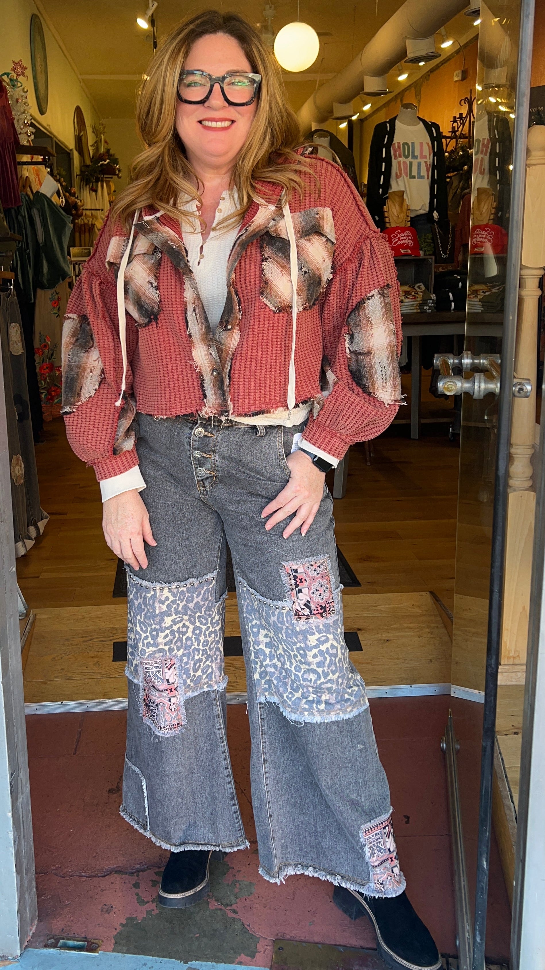 Make a bold statement in these boho-inspired jeans that blend edgy black denim with playful leopard and mixed print patches. Designed with subtle stud details and an elastic back waistband, they balance comfort with standout style. Perfect for concerts, casual weekends, or adding a unique twist to your everyday outfits.