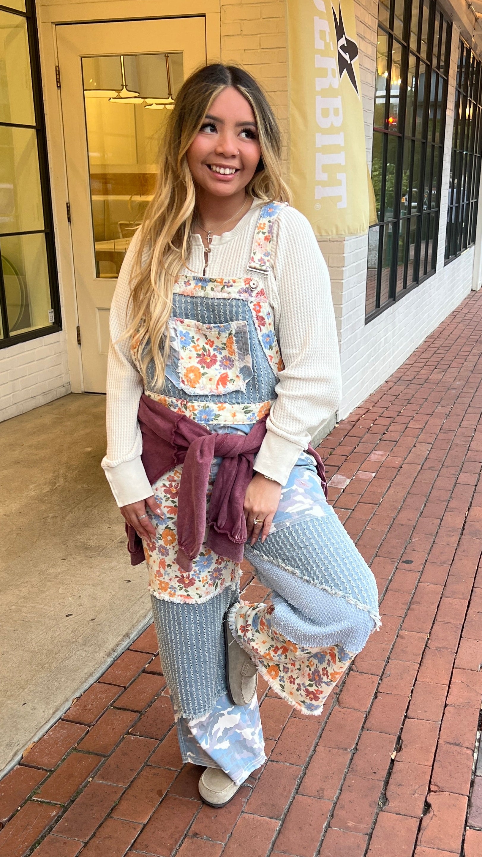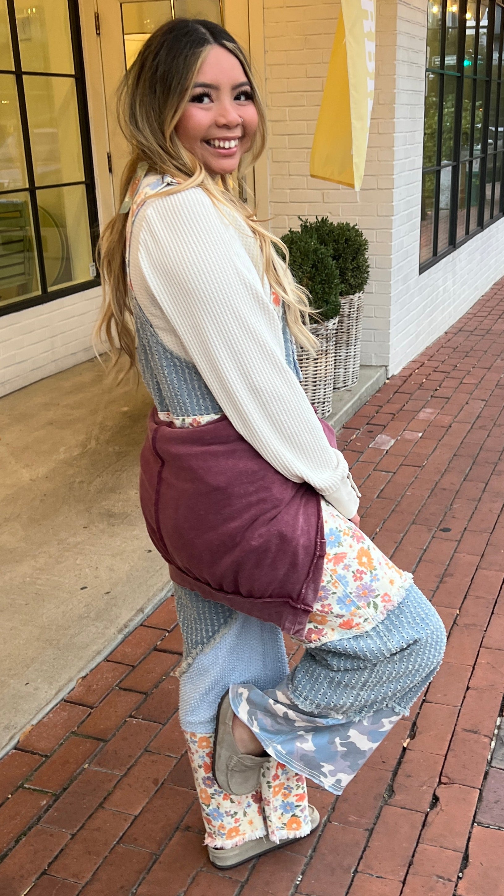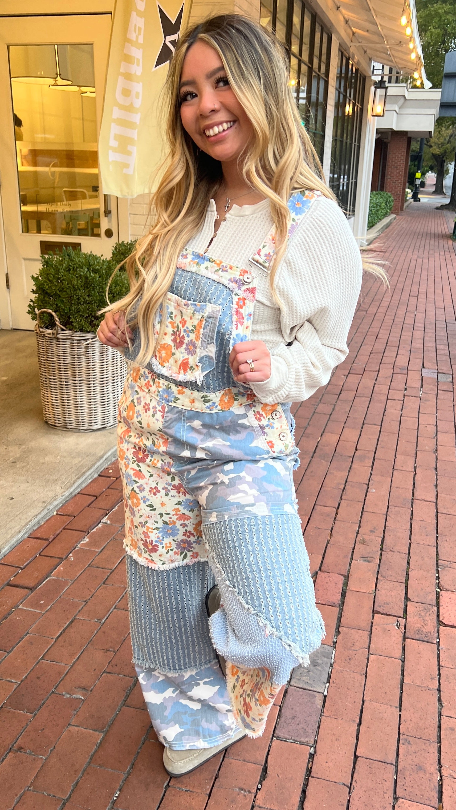 Unique patchwork design combining denim, fall florals, and blue camo patterns