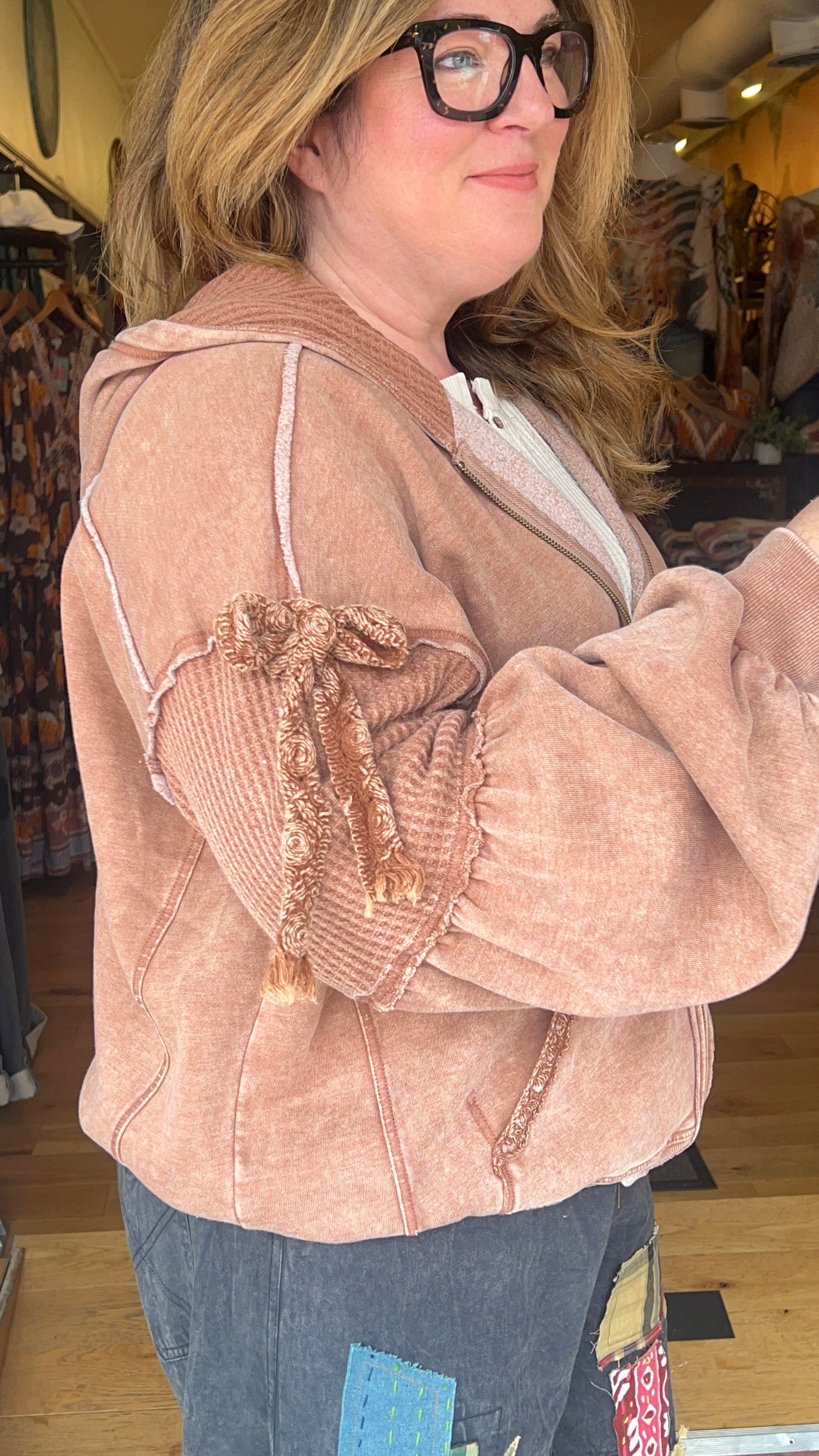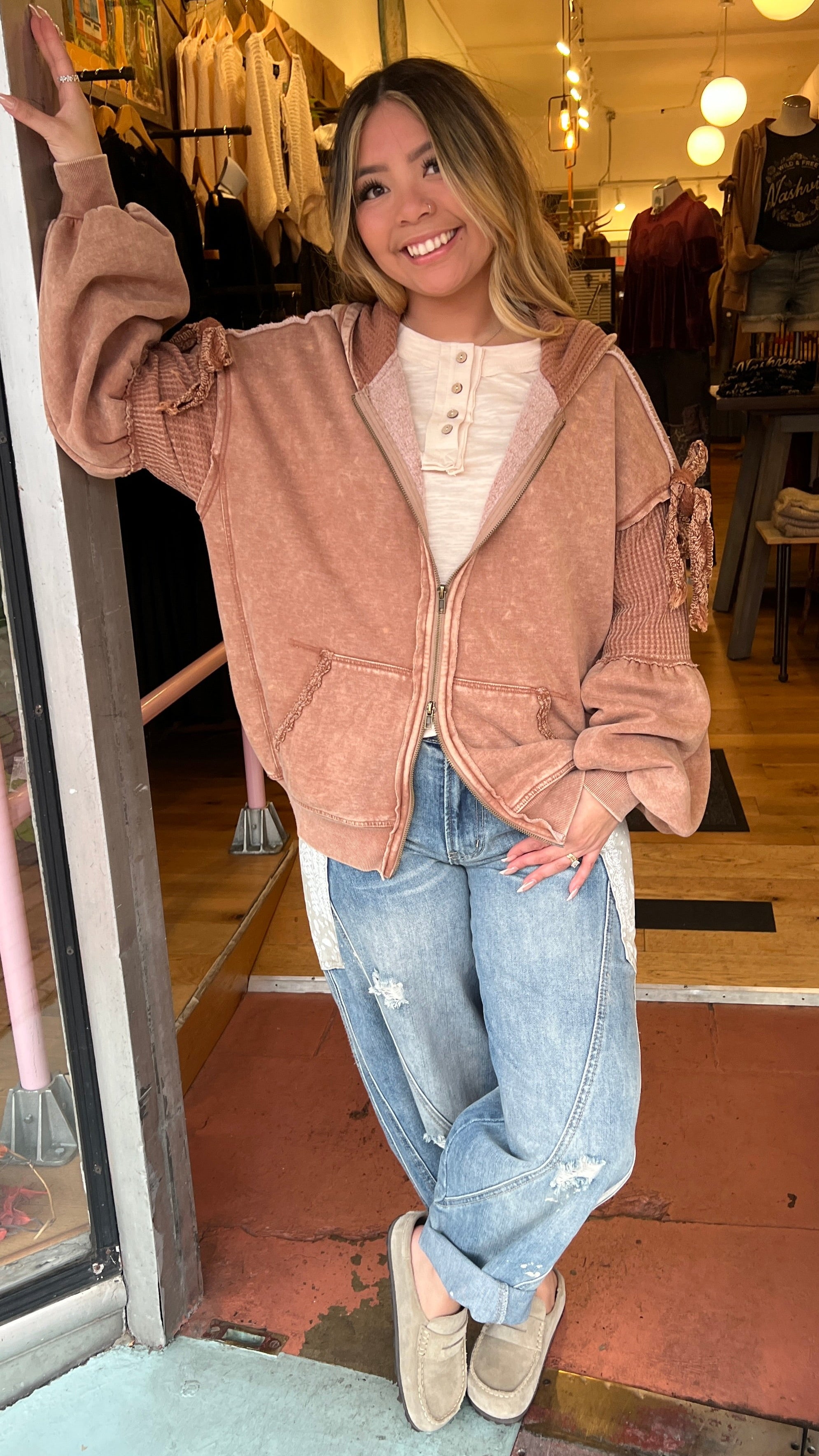 Meet your new favorite layer — the Mocha Mineral Wash Bow Girl Hoodie. This cozy terry knit zip-up jacket blends comfort and style with its soft, lived-in feel and thoughtful boho details.