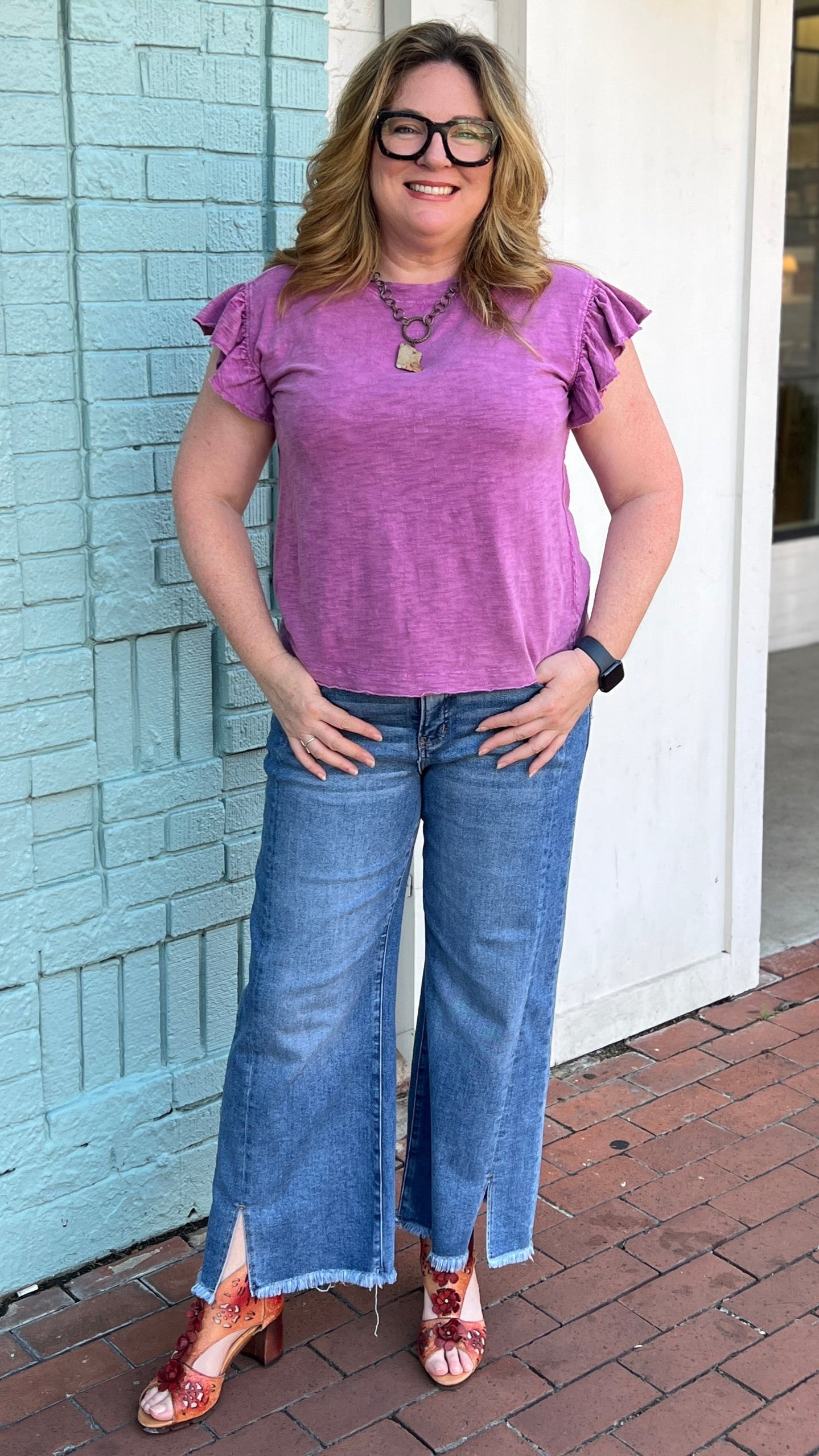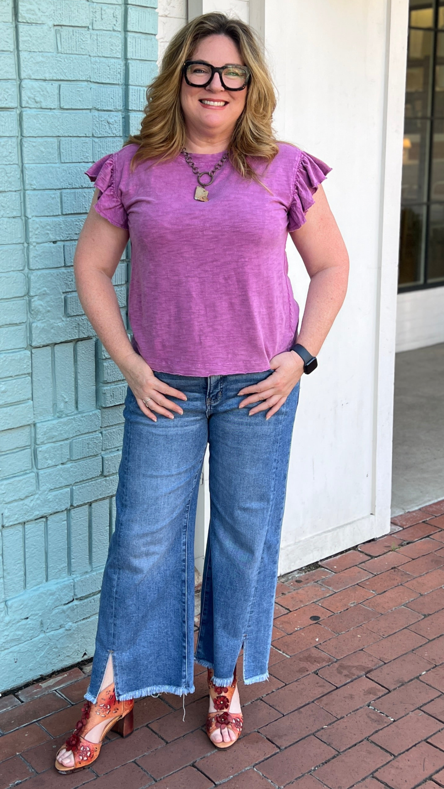 Meet your new favorite jeans: the Risen Mid Rise Front Slit Wide Leg Jeans—designed just for women who want style and comfort all in one. These jeans feature a flattering tummy control waist and a comfy stretch fabric that moves with you. The raw edge hem and front slit add a trendy, laid-back vibe that’s perfect for any casual or dressy occasion.