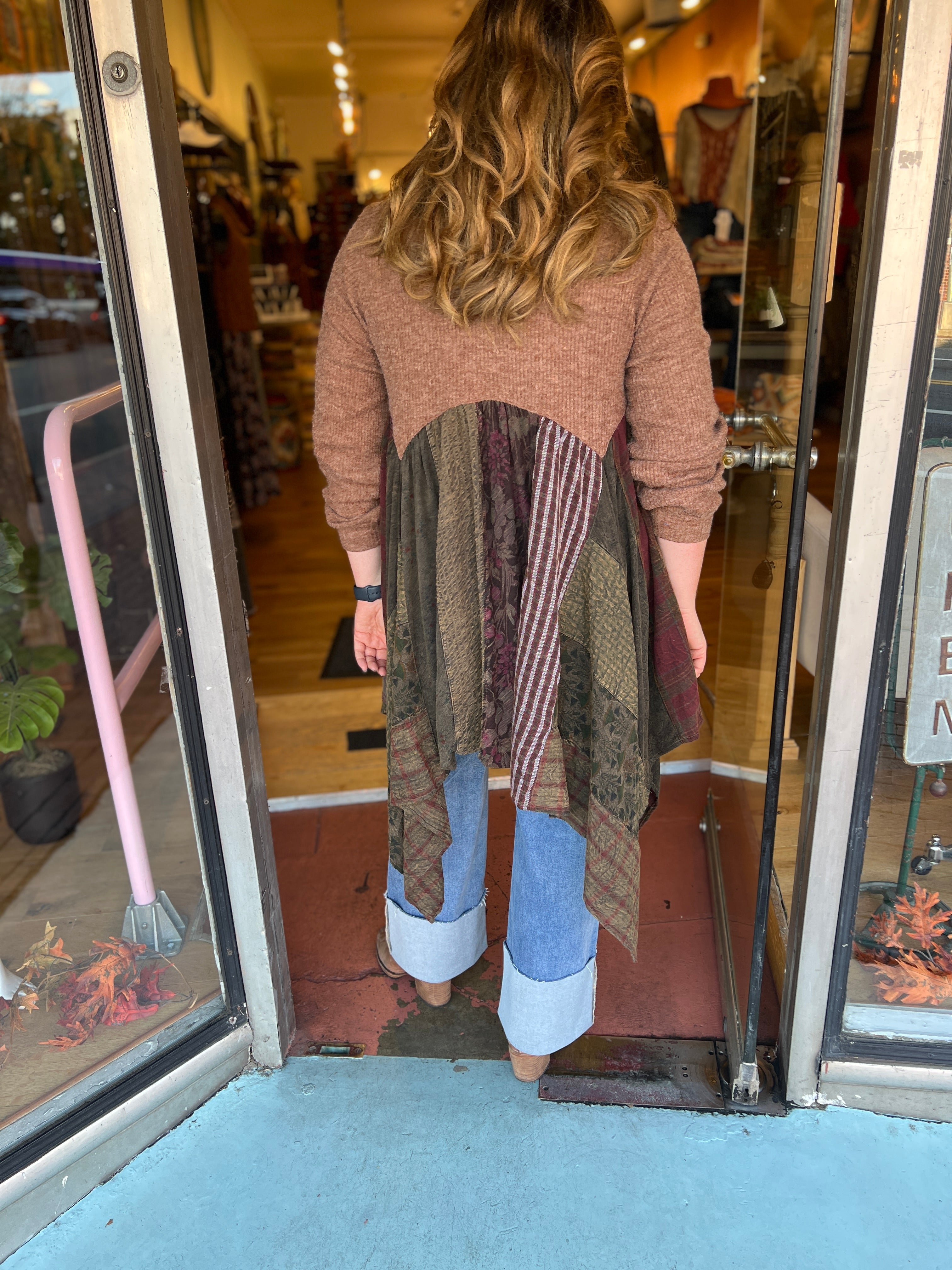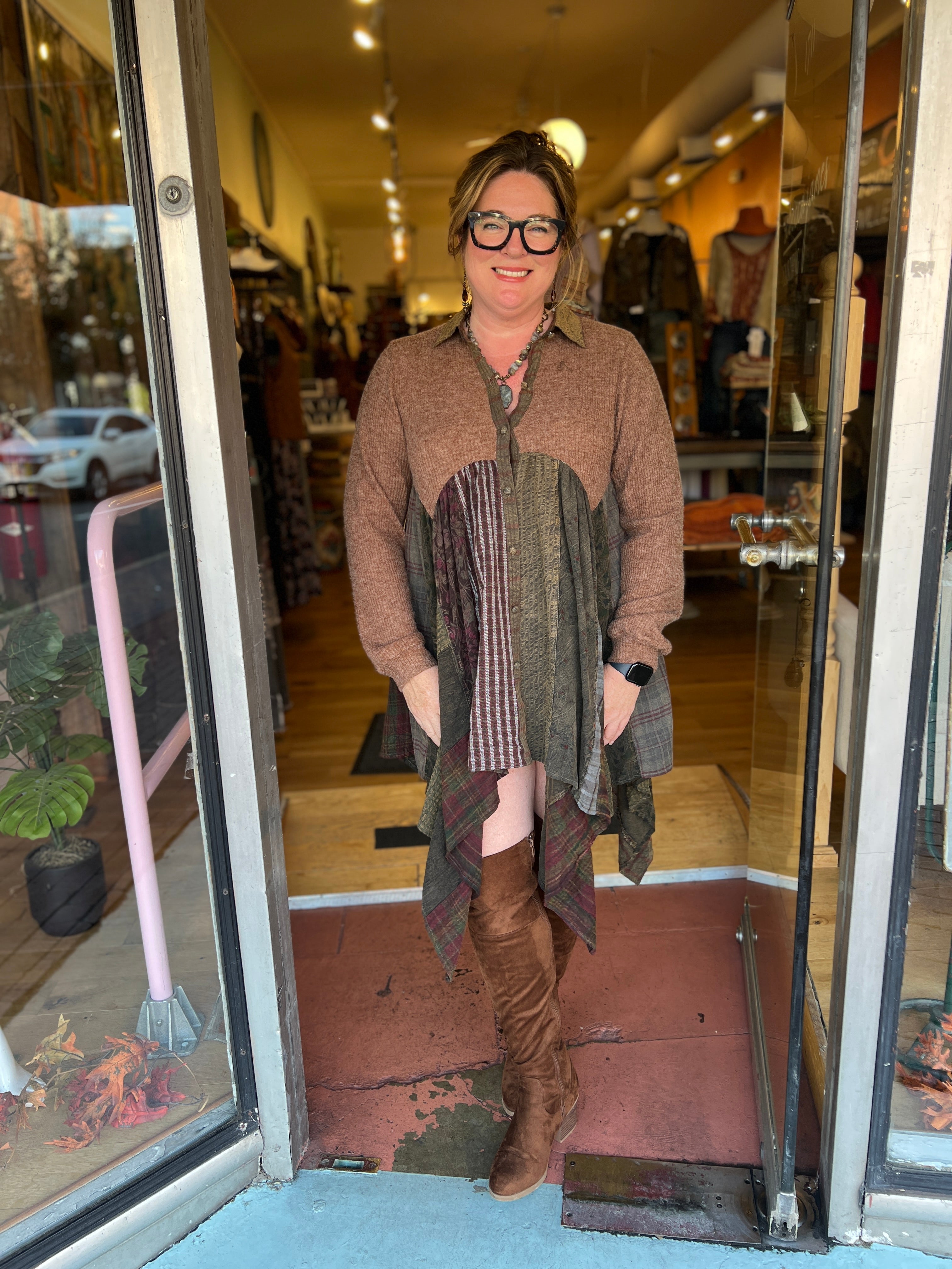 The perfect piece for your fall wardrobe. With its cozy ribbed knit top and flowy mixed-fabric bottom, this tunic can be worn as a dress with tights and boots or styled open as a jacket with jeans. The rich tones of mocha, deep green, brown, and wine make it an ideal fall layering piece for everything from casual weekends to seasonal events.