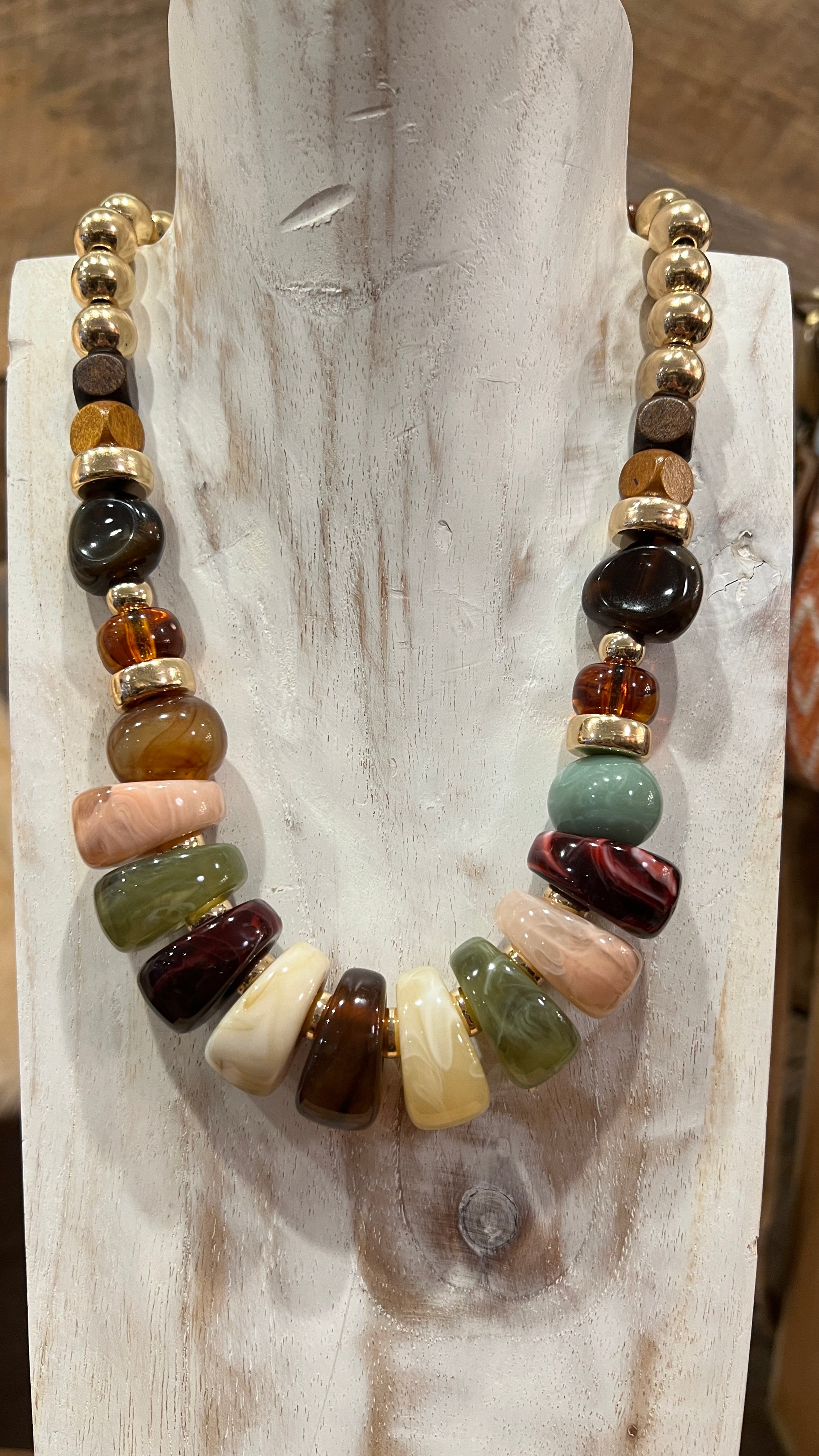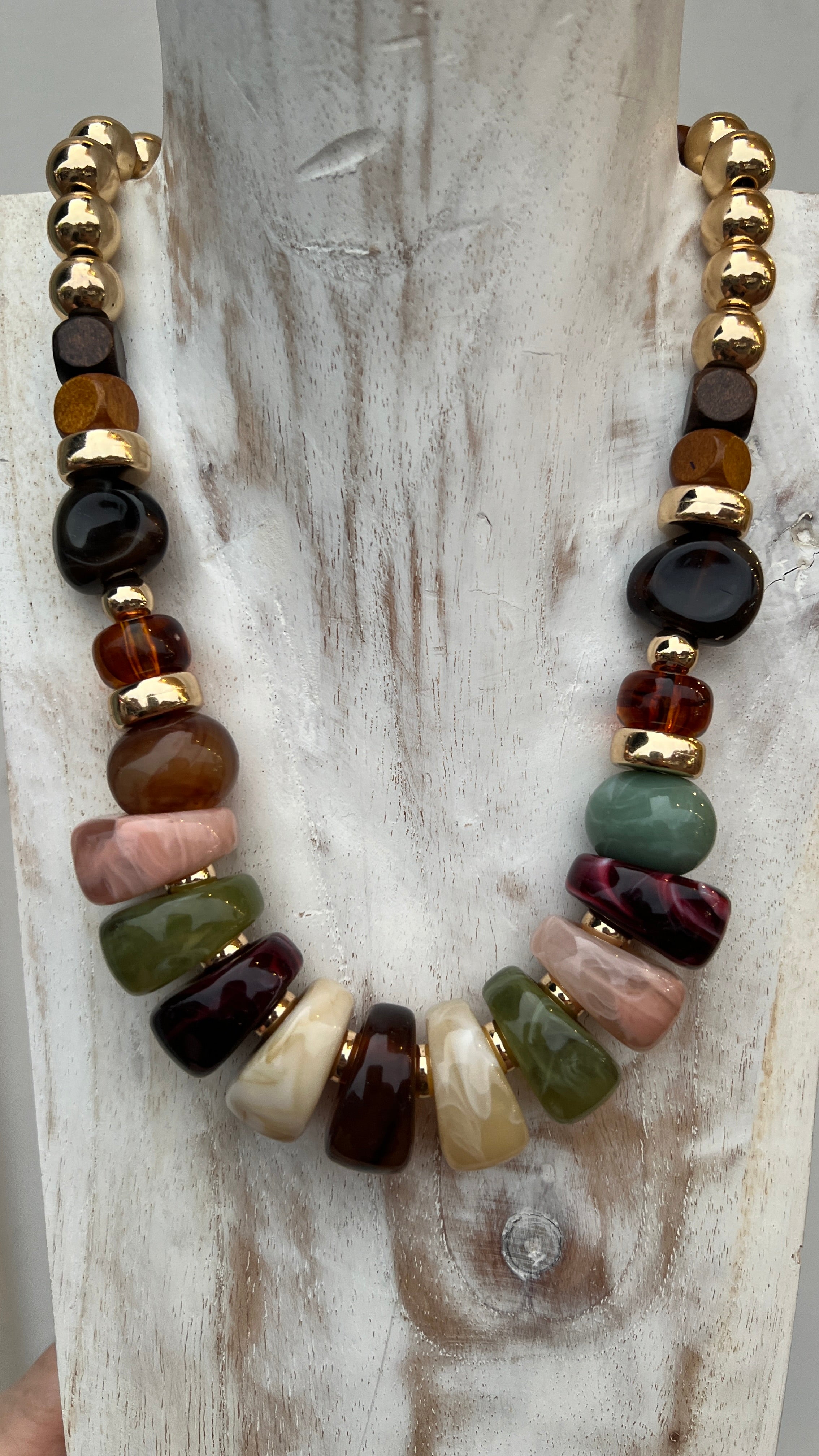 Chunky resin beads in pink, wine, green, gold & wood tones