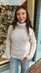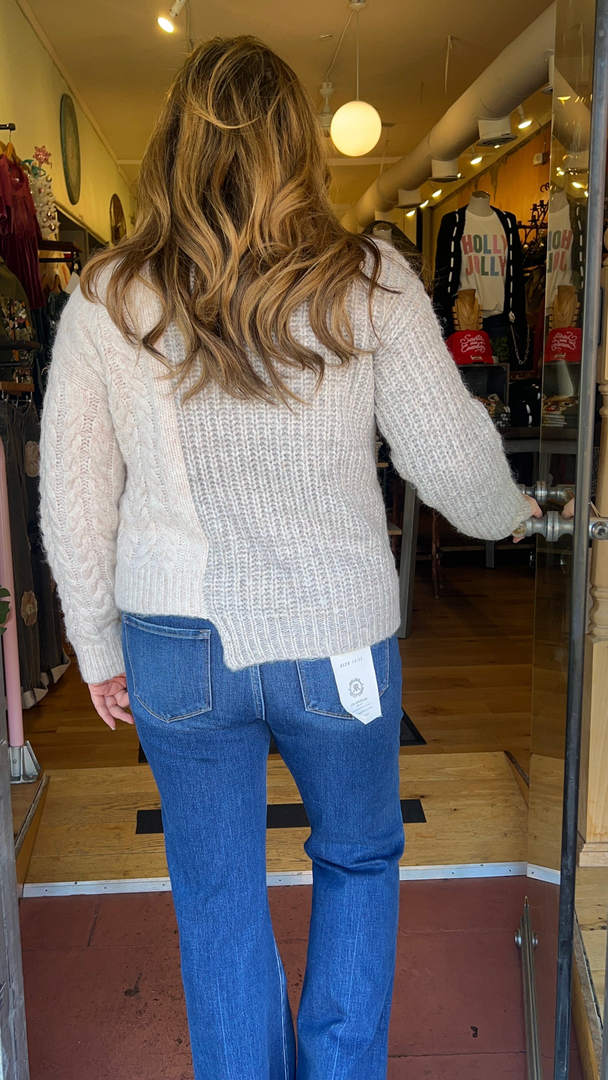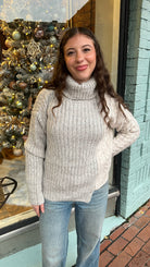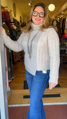 Cozy meets modern design in the Two Tone Chunky Turtleneck Sweater — the perfect neutral layer for fall and winter. This thick, soft knit blends a heathered grey on the left side with an oatme'al cable knit on the right, creating a beautifully unique two-tone look that feels both elevated and effortless.