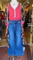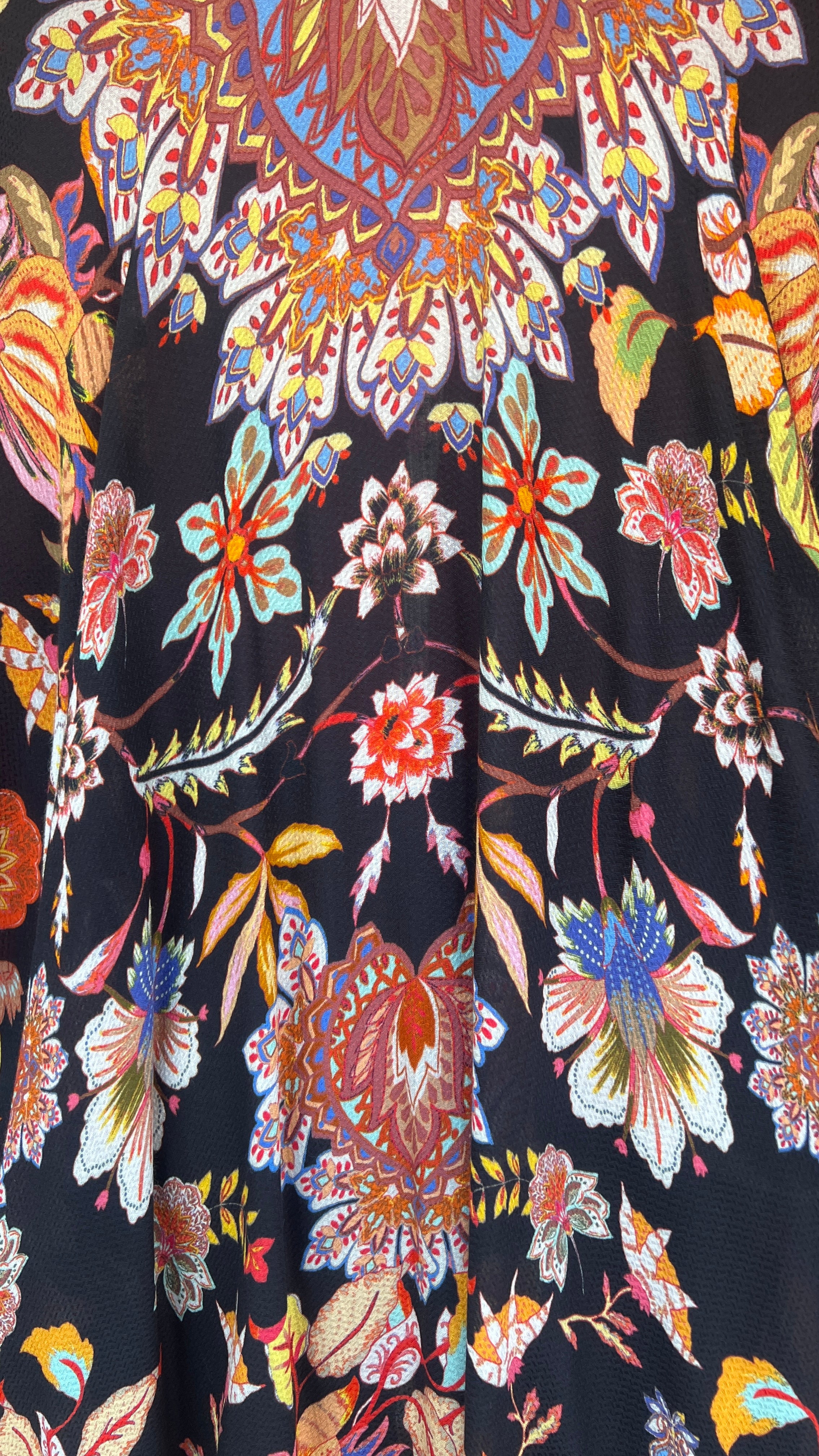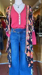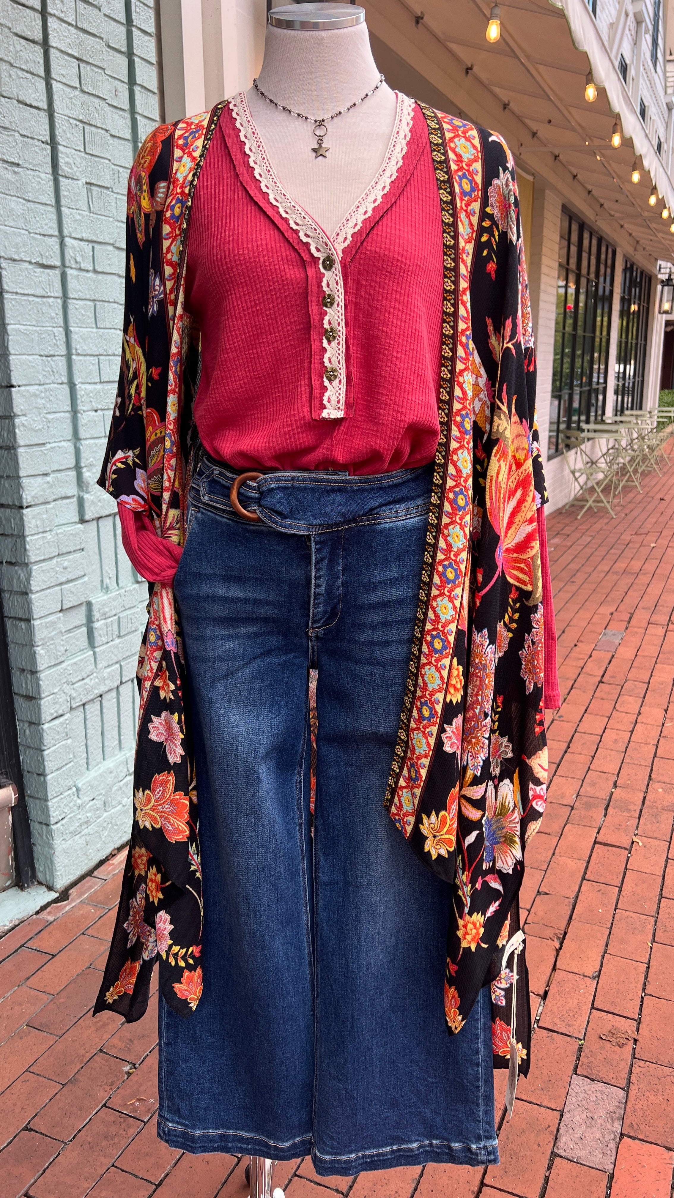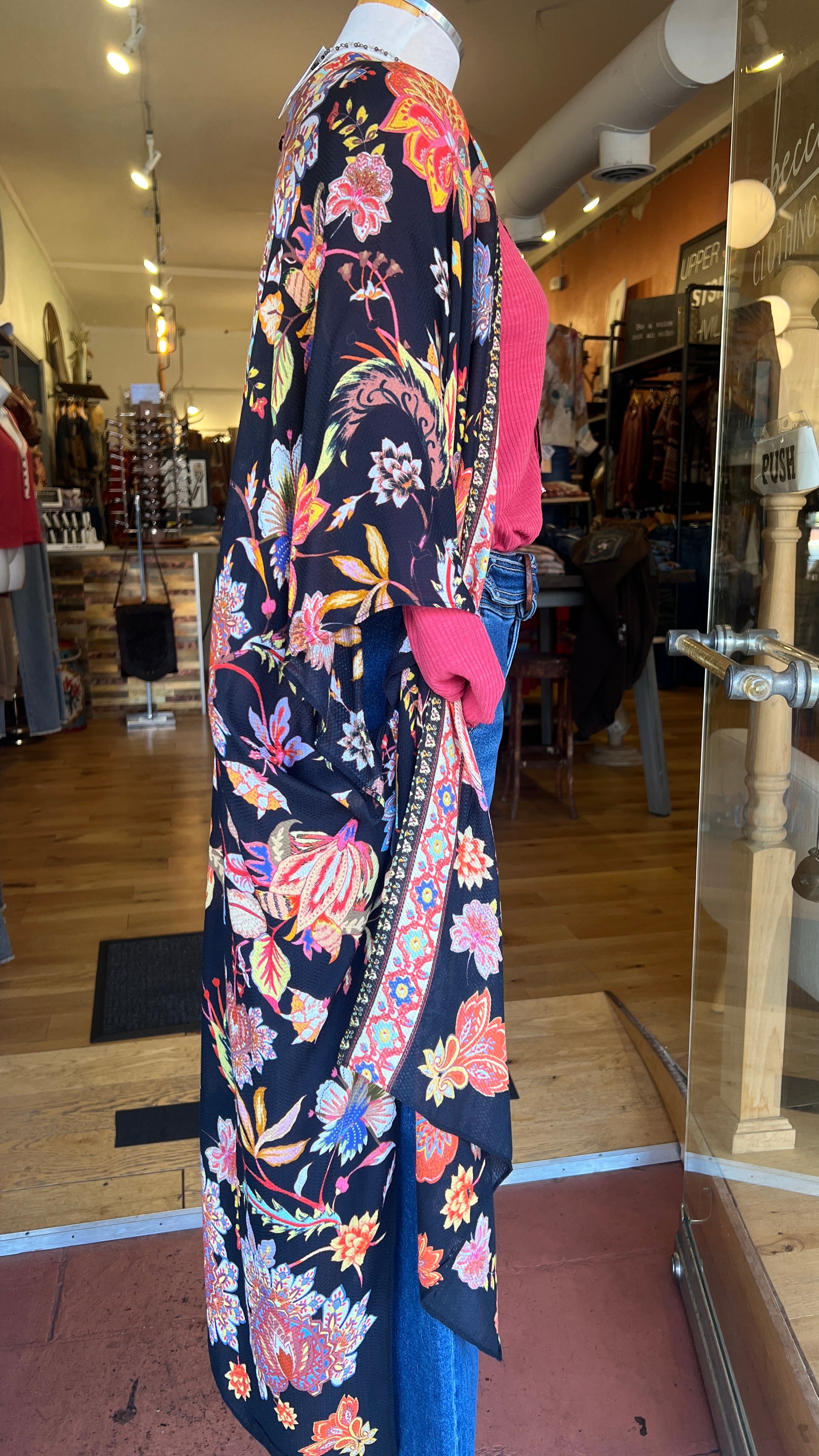 The Autumn Colors Black Floral Kimono is the perfect layering piece to take you from day to night in style. With its black base and vibrant fall-toned florals, it adds an instant pop of color to any outfit. Lightweight and flowy, this kimono is designed to drape beautifully and can be dressed up or down depending on the occasion. Pair it with jeans and our Cherry Rose Ribbed Knit Top for a casual fall look, or style it over a dress for a polished evening outfit. Versatile and effortless, it’s a one-size piece that flatters everyone.