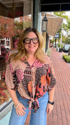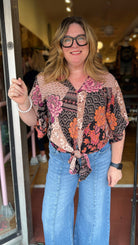 Flowy, effortless, and made for fall — the Black Fall Floral Tie Front Top makes getting dressed a breeze. This kimono-sleeve style blouse features a beautiful fall-inspired print in shades of black, tan, berry, and cream, giving it that easy, boho-chic feel you’ll love for the season.