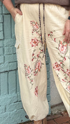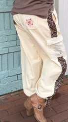 These will be your favorite pair of pants this Spring! Make a fearless style statement with these cream cotton cargo joggers featuring intricate floral embroidery and bold leopard-print side panels. The oversized, elastic-waist design offers ultimate comfort and transitions seamlessly from a relaxed straight leg to a cinched jogger silhouette. It is the perfect blend of bohemian charm and edgy utility for the modern trendsetter.