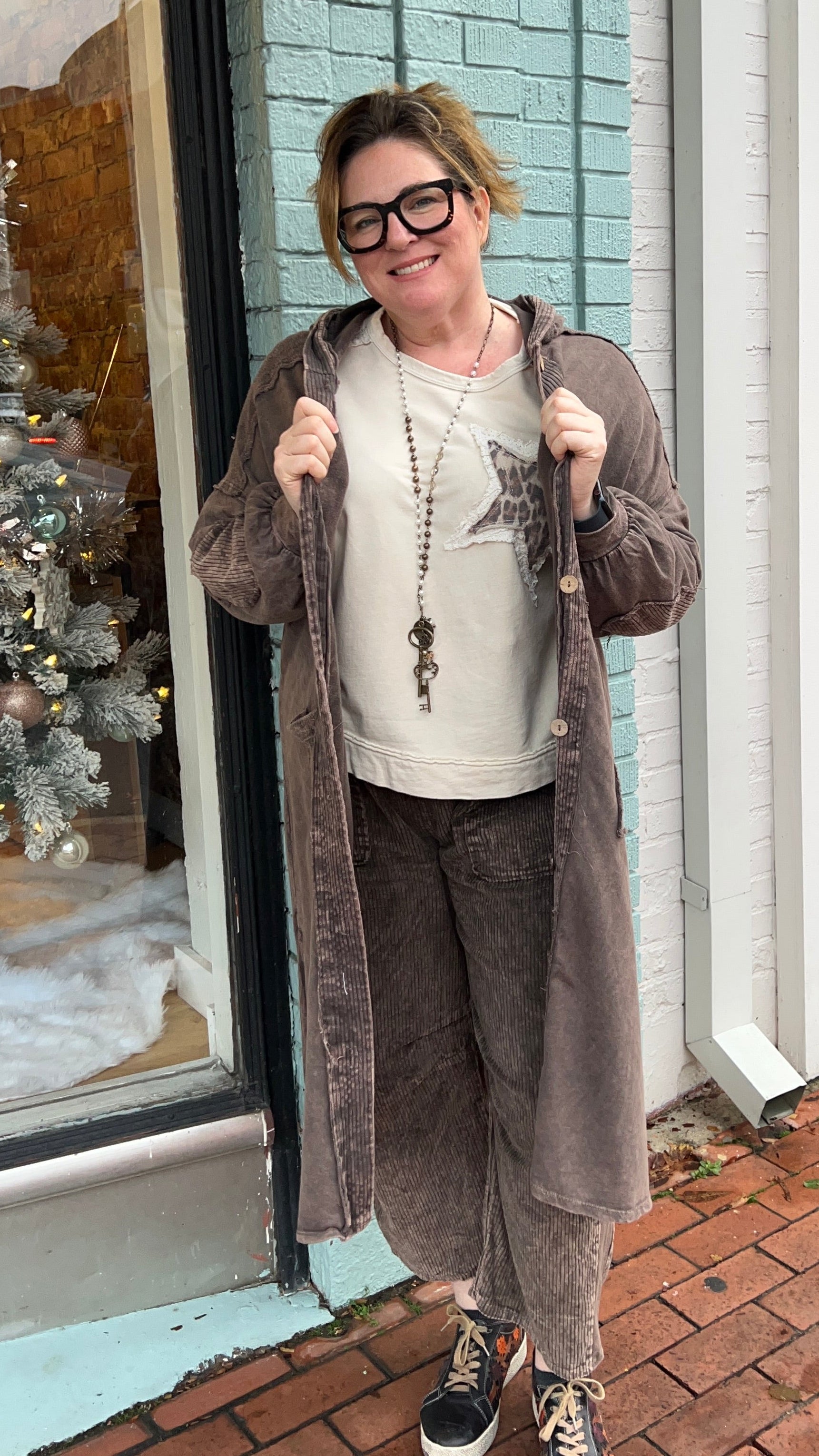 The corduroy trim adds beautiful texture, while the hooded design makes it extra practical for travel days, errands, or lounging at home. Style it with our Cream Leopard Star Patch Top or the Wild & Free Graphic Tee for easy outfit options that feel intentional without any effort.