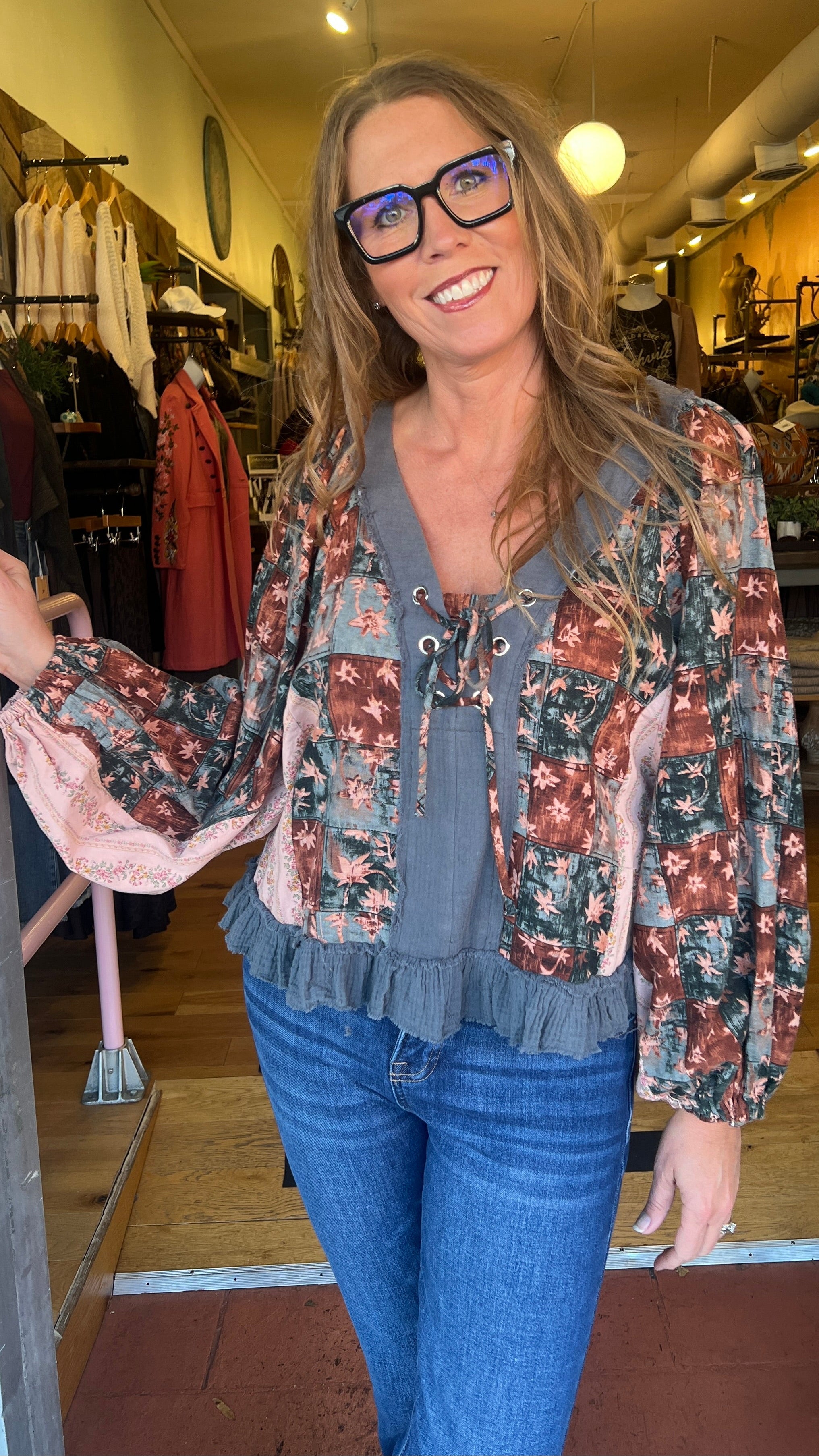 The dramatic puff sleeves and slightly cropped, oversized fit give it a playful silhouette that’s flattering and easy to wear. Pair it with high-waisted jeans, cords, or skirts for a look that’s equal parts vintage-inspired and modern boho. It’s already been a customer favorite in-store, and once you try it on, you’ll see why.