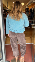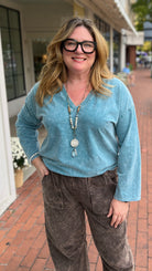 With its slightly oversized fit, flattering V-neckline, and easy drape, this top is perfect for everything from Saturday mornings at home to flights out of town or evening walks. The rich teal tone pairs beautifully with our Corduroy Pants or Paperlace Magic Bunny Pants for a look that’s equal parts cozy and pulled-together.