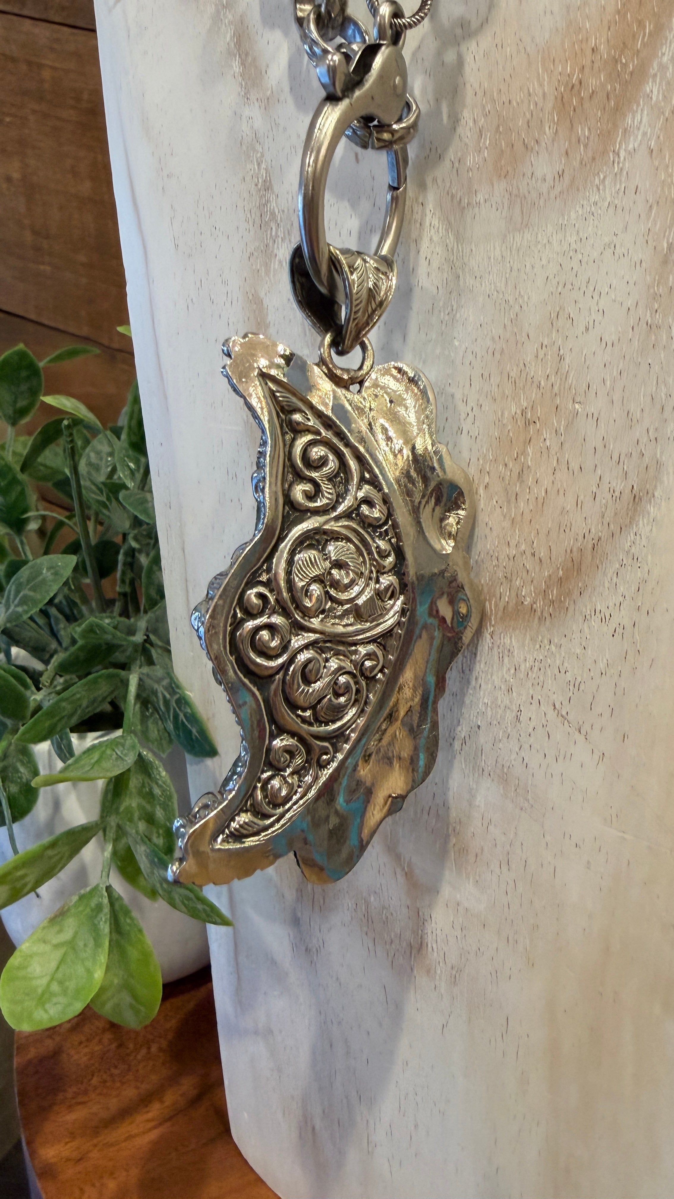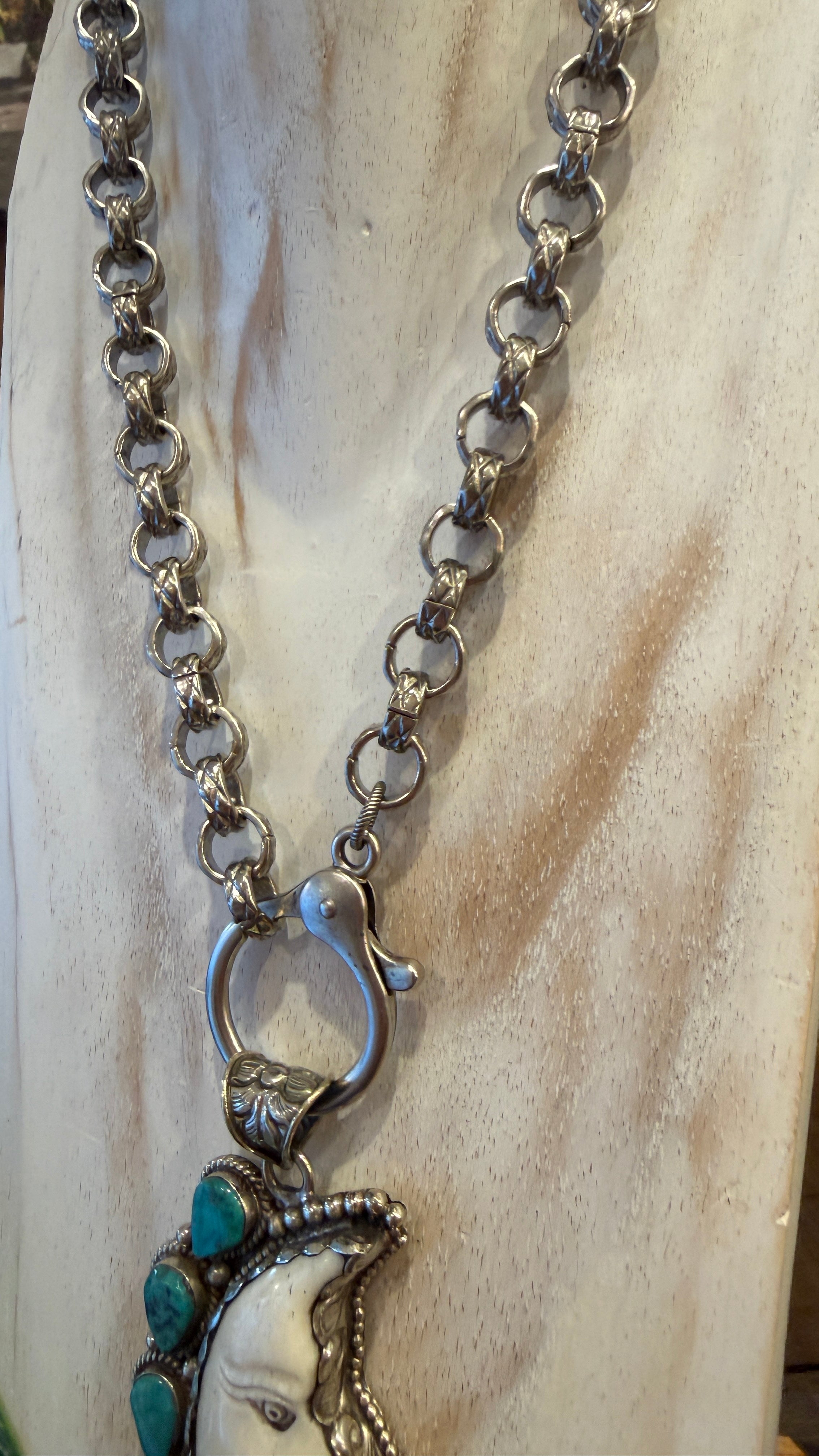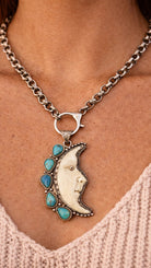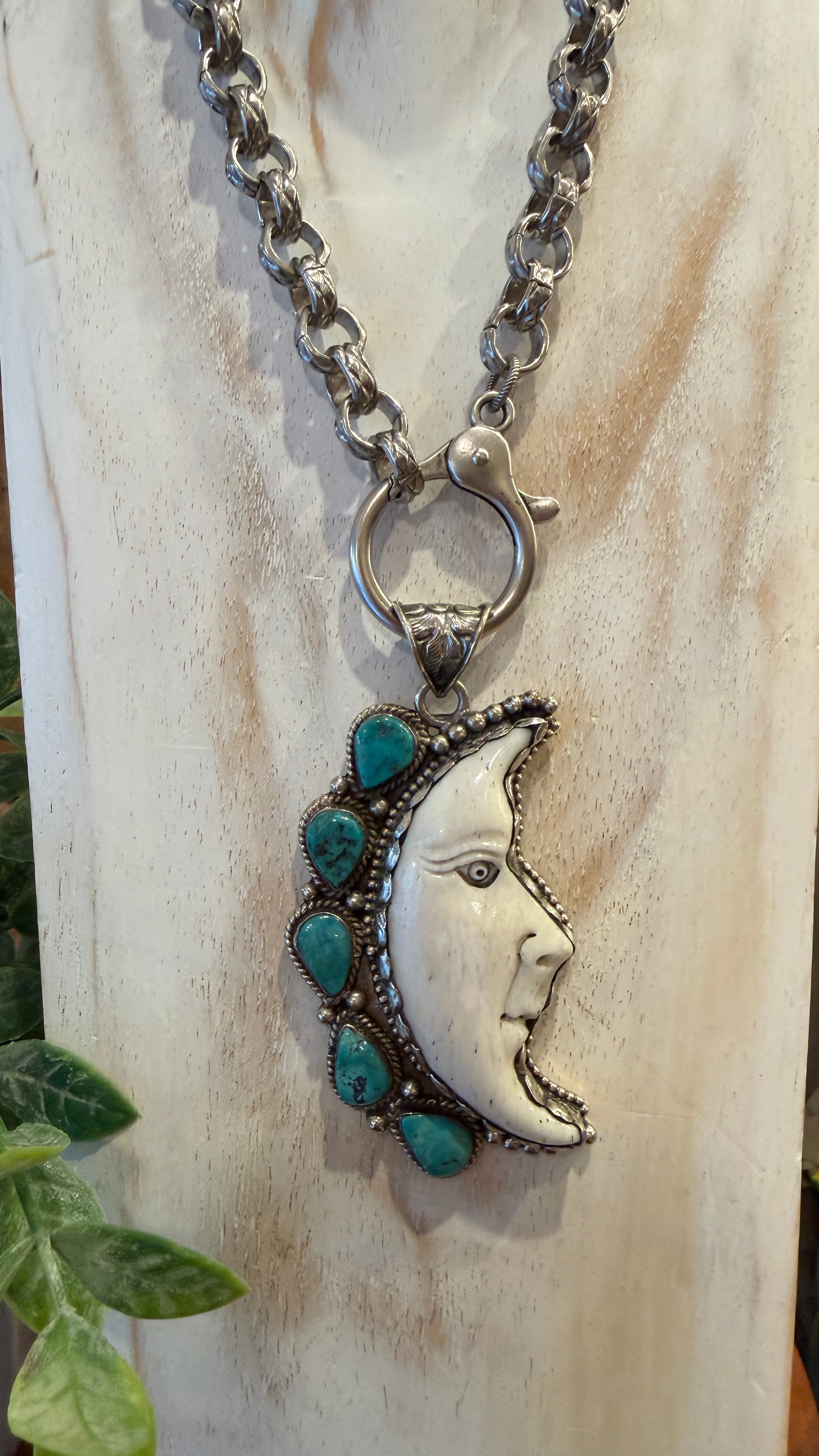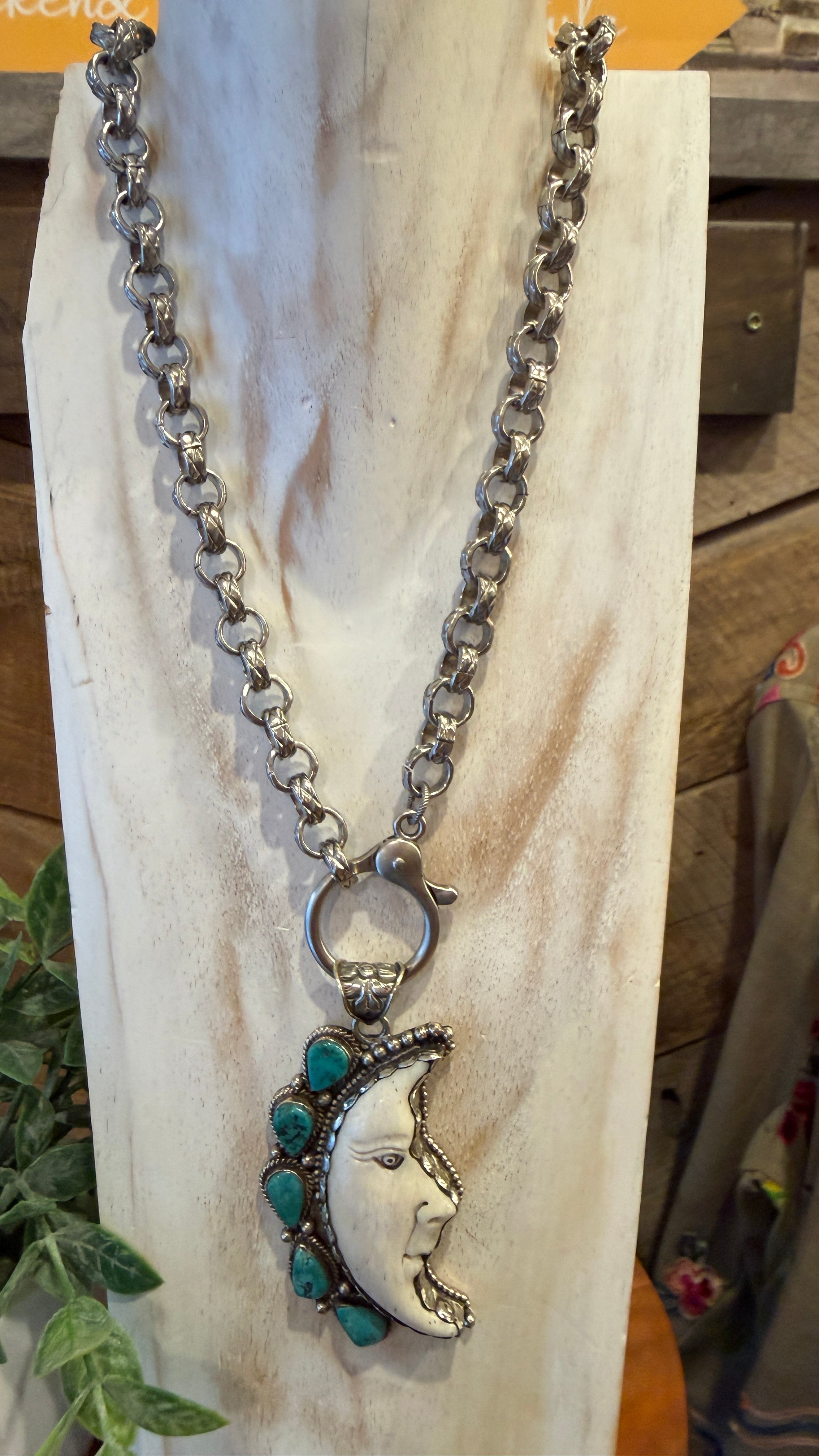 This one-of-a-kind statement necklace features a bold Tibetan-inspired moon pendant crafted from genuine turquoise and carved bone, suspended from an antique silver–tone chain with a unique front lobster clasp closure. The mix of natural turquoise stone, bone detailing, and German silver creates rich texture and a beautiful artisan feel that pairs perfectly with bohemian-style outfits.