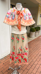 The finishing touch is Aratta’s signature flair: a floral print tie adorned with sparkling crystal tassels, adding just the right amount of festive shimmer. Whether draped over a dress for a holiday event or layered with velvet and denim for a chic winter look, this cape transforms any outfit into something extraordinary.