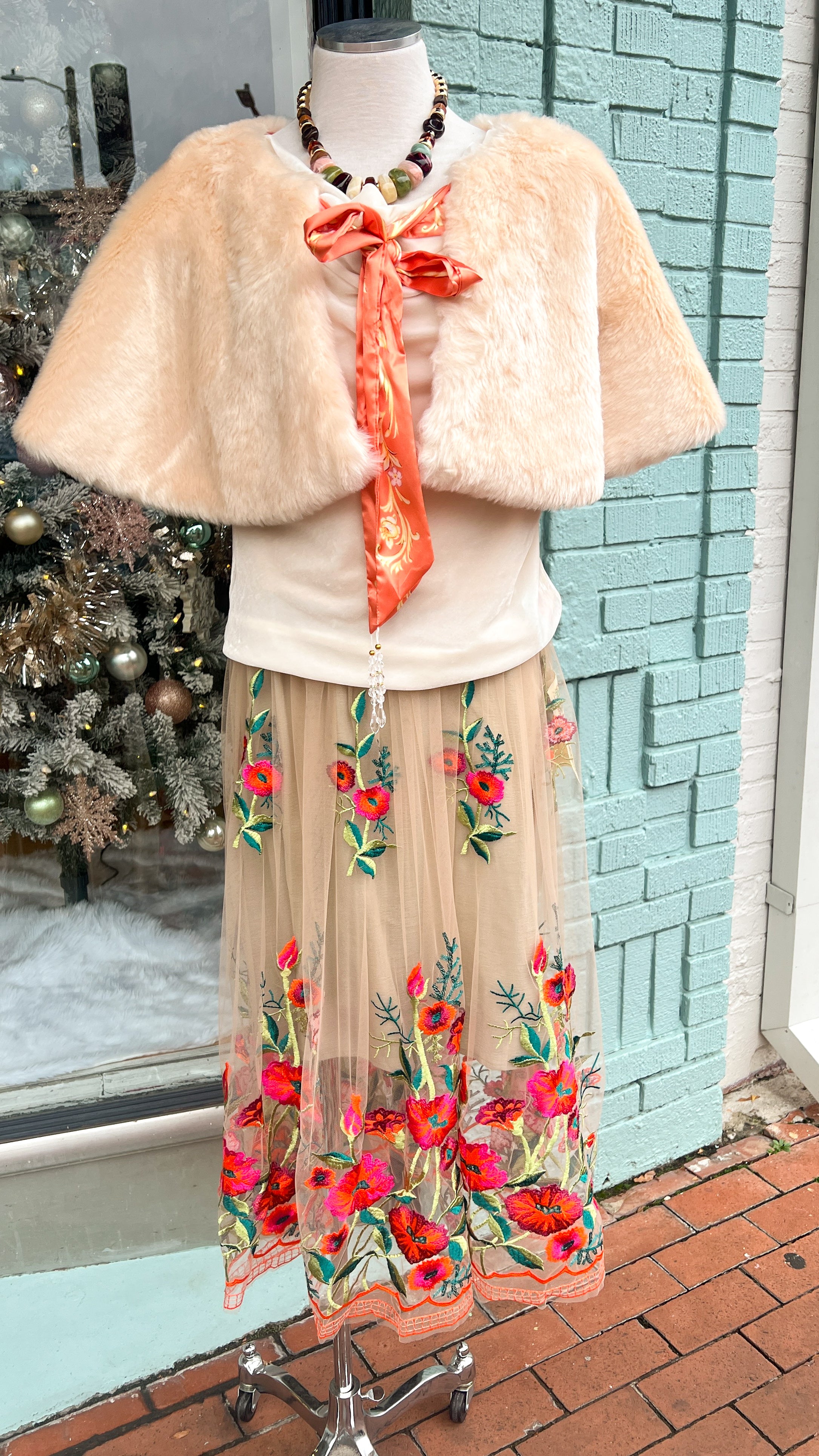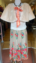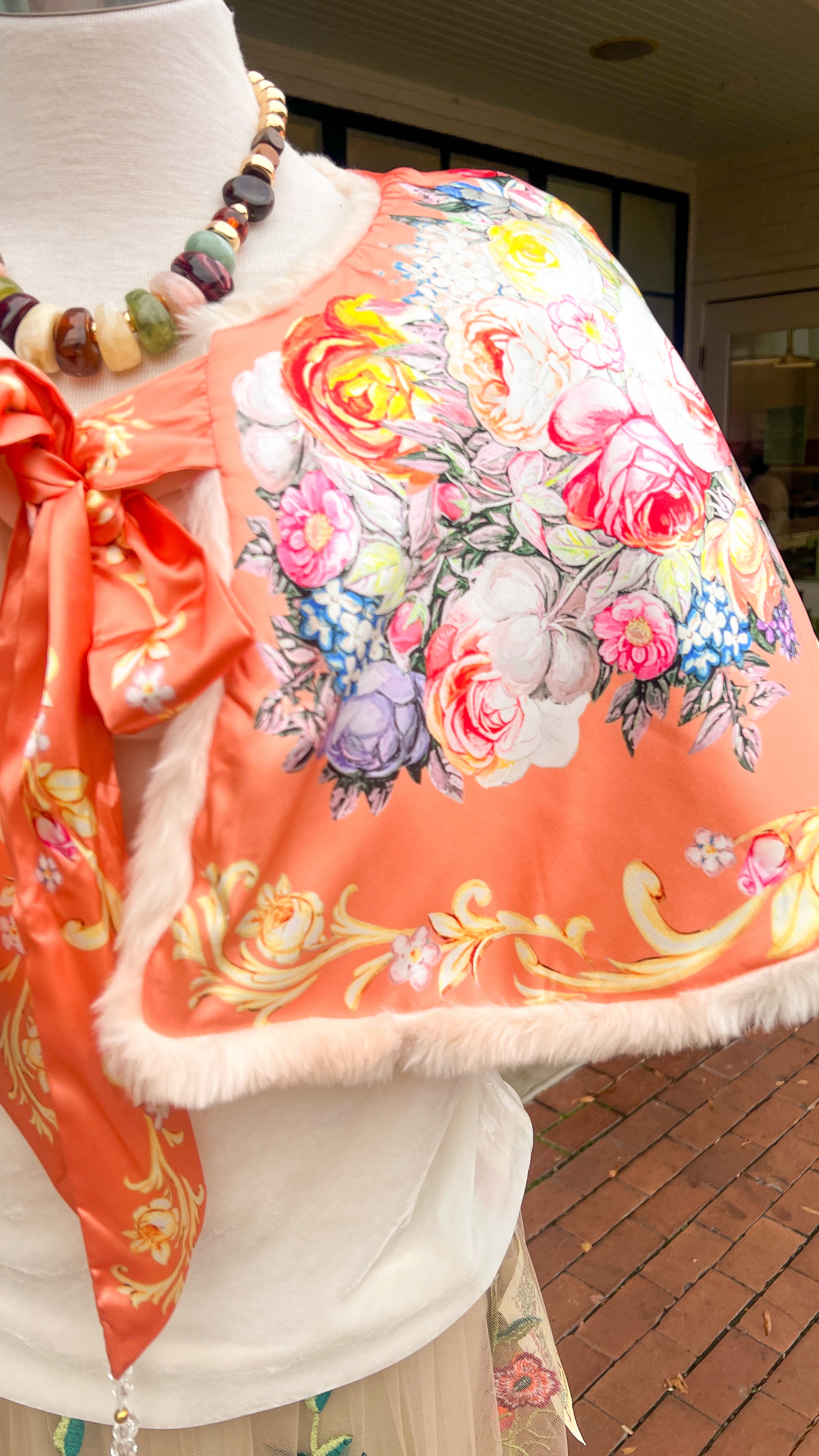 Indulge in timeless glamour with the Grace Kelly Reversible Fur Cape by Aratta — a stunning statement piece that brings elegance, warmth, and artistry to every winter outfit. Crafted from luxurious cream faux fur with a beautifully detailed floral satin lining, this cape is fully reversible, giving you two exquisite looks in one.