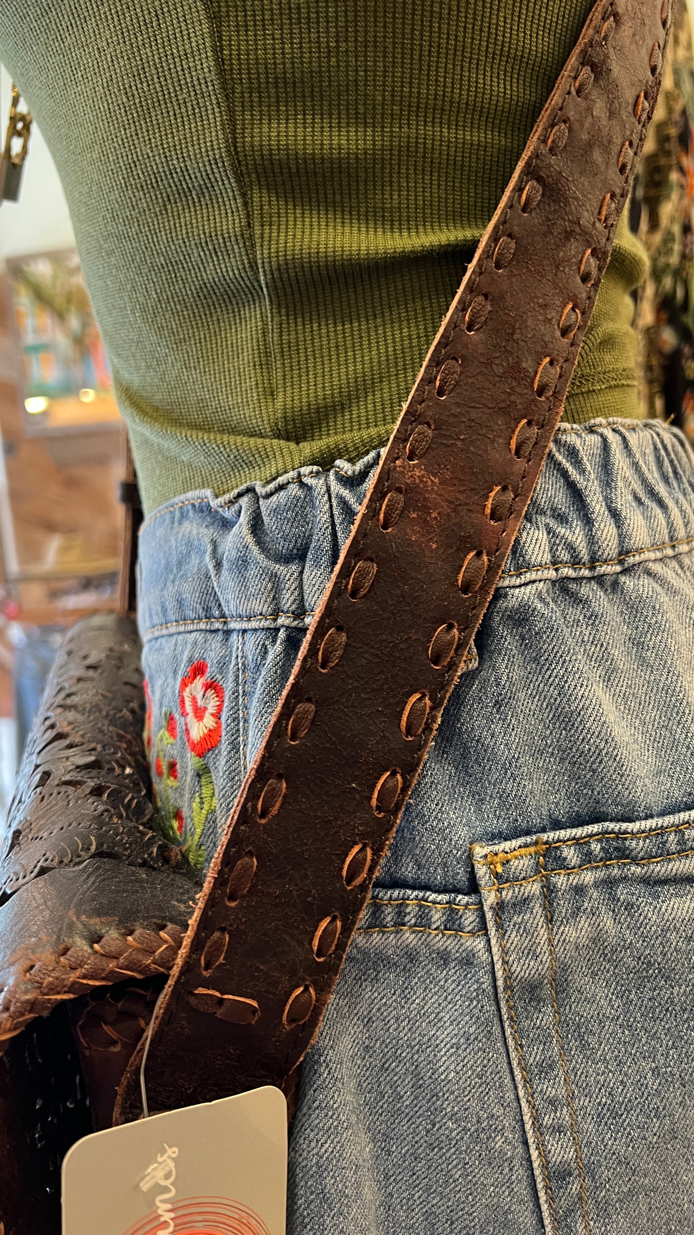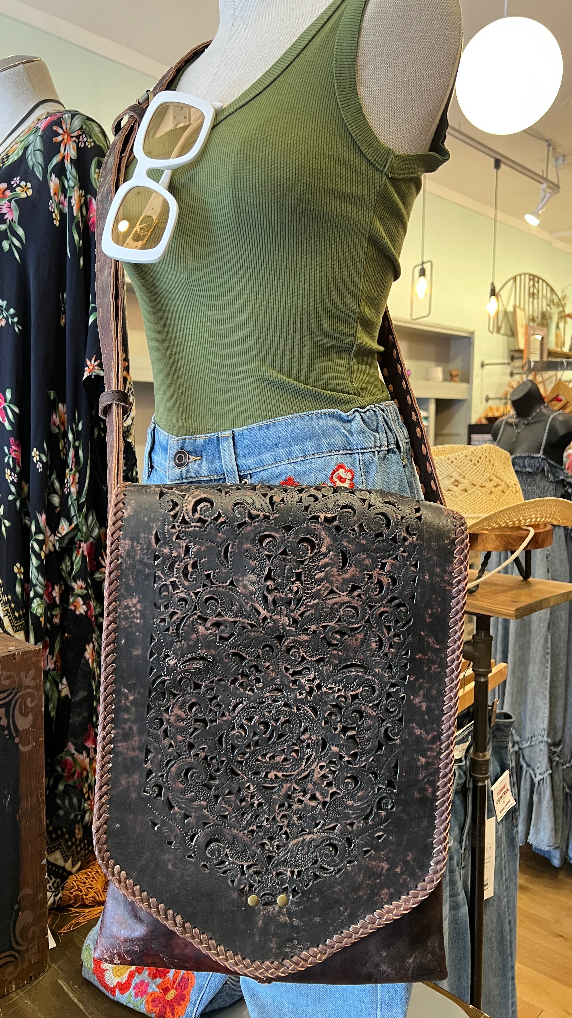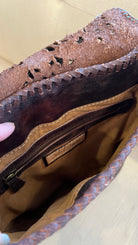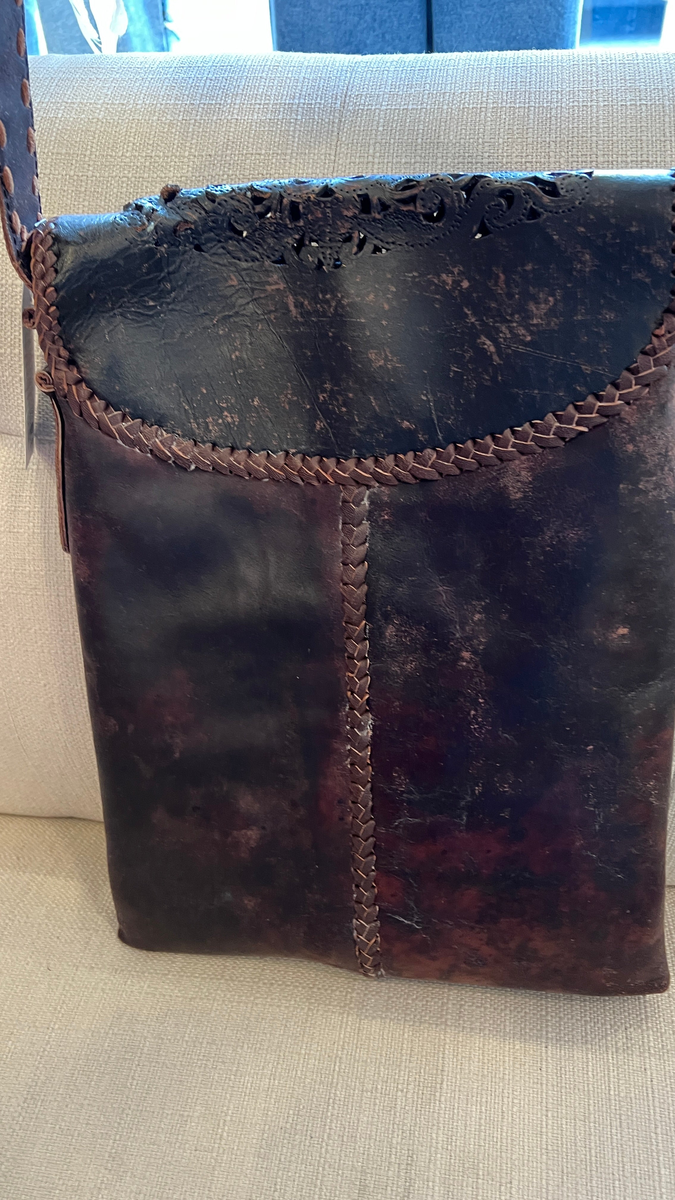 Made from thick, heavy-duty leather with meticulous hand stitching on the body and strap, this bag is built to last for years to come. The intricate hand-tooled leather flap adds a unique, one-of-a-kind detail, secured with a magnetic snap closure for easy access.