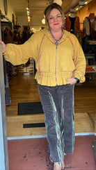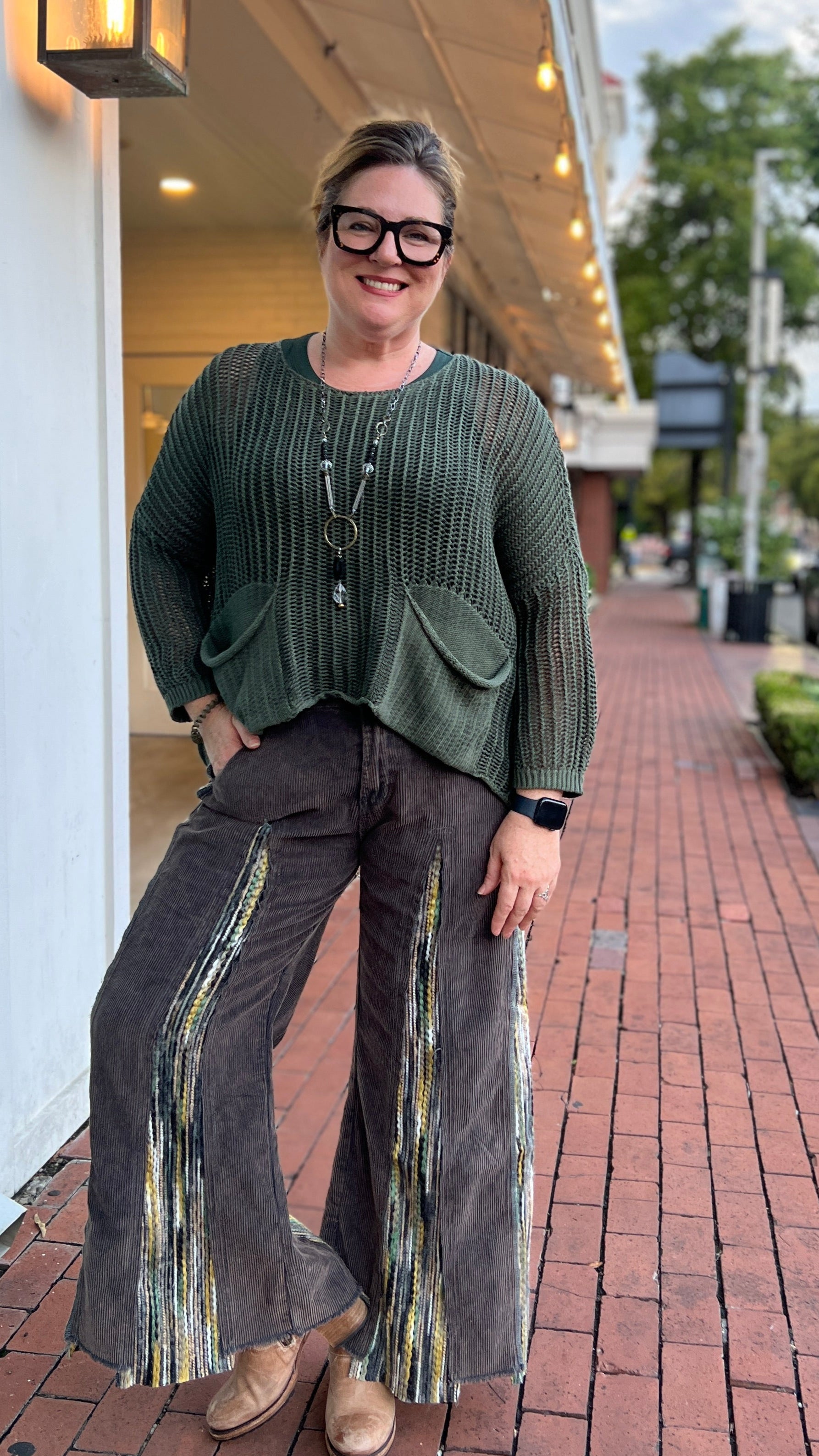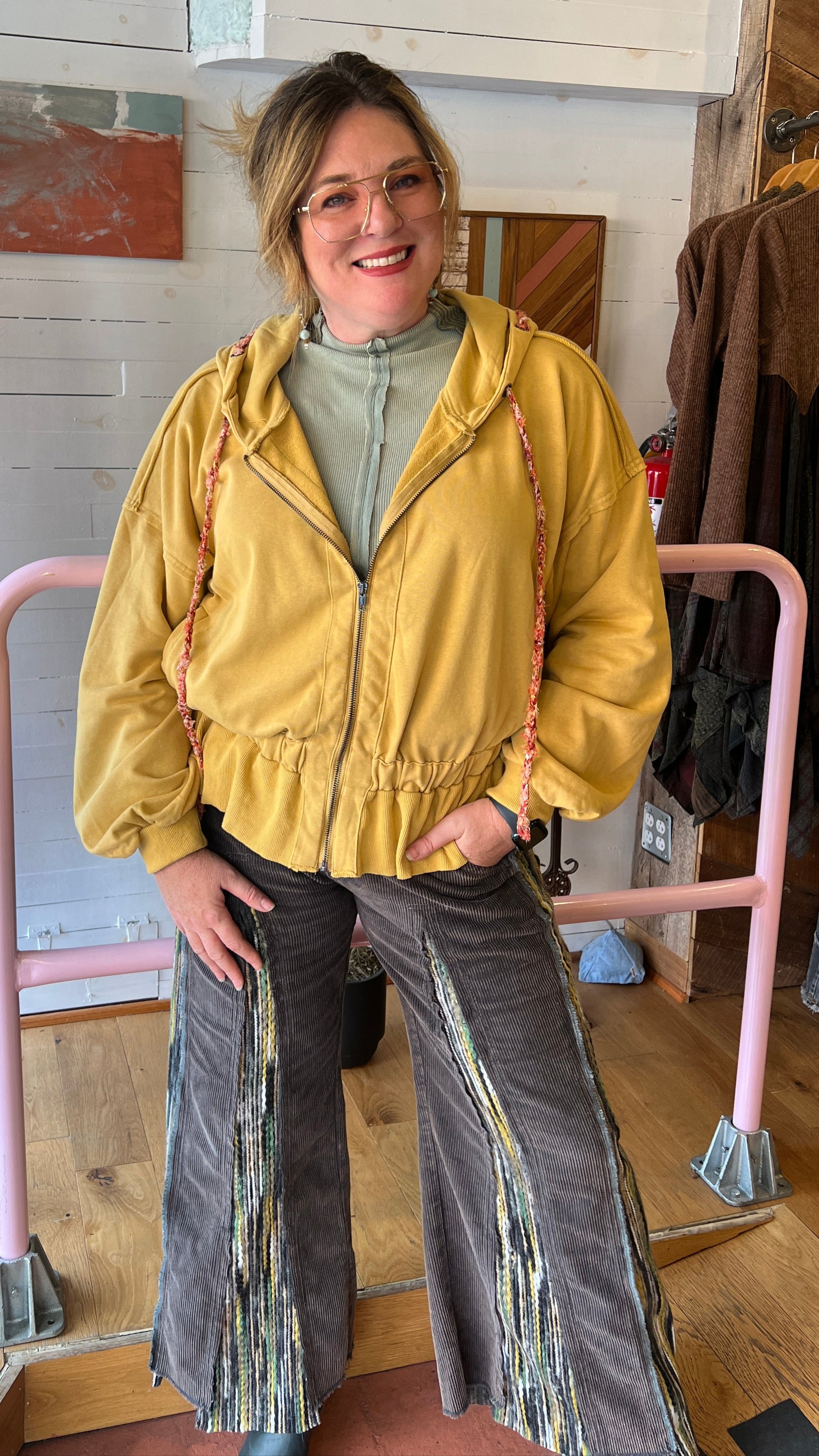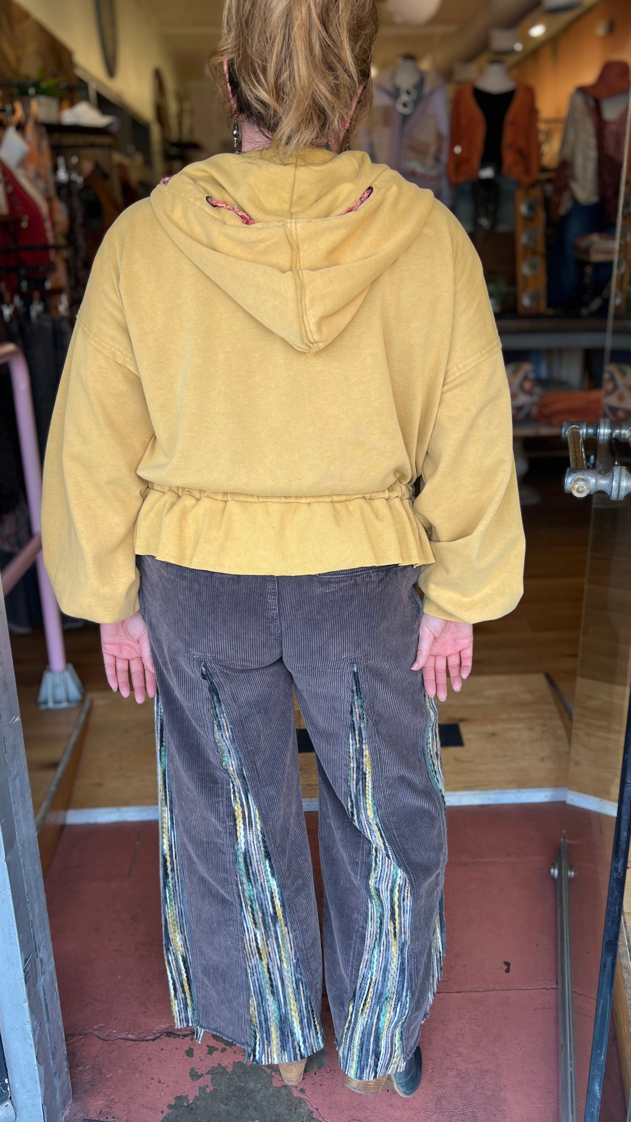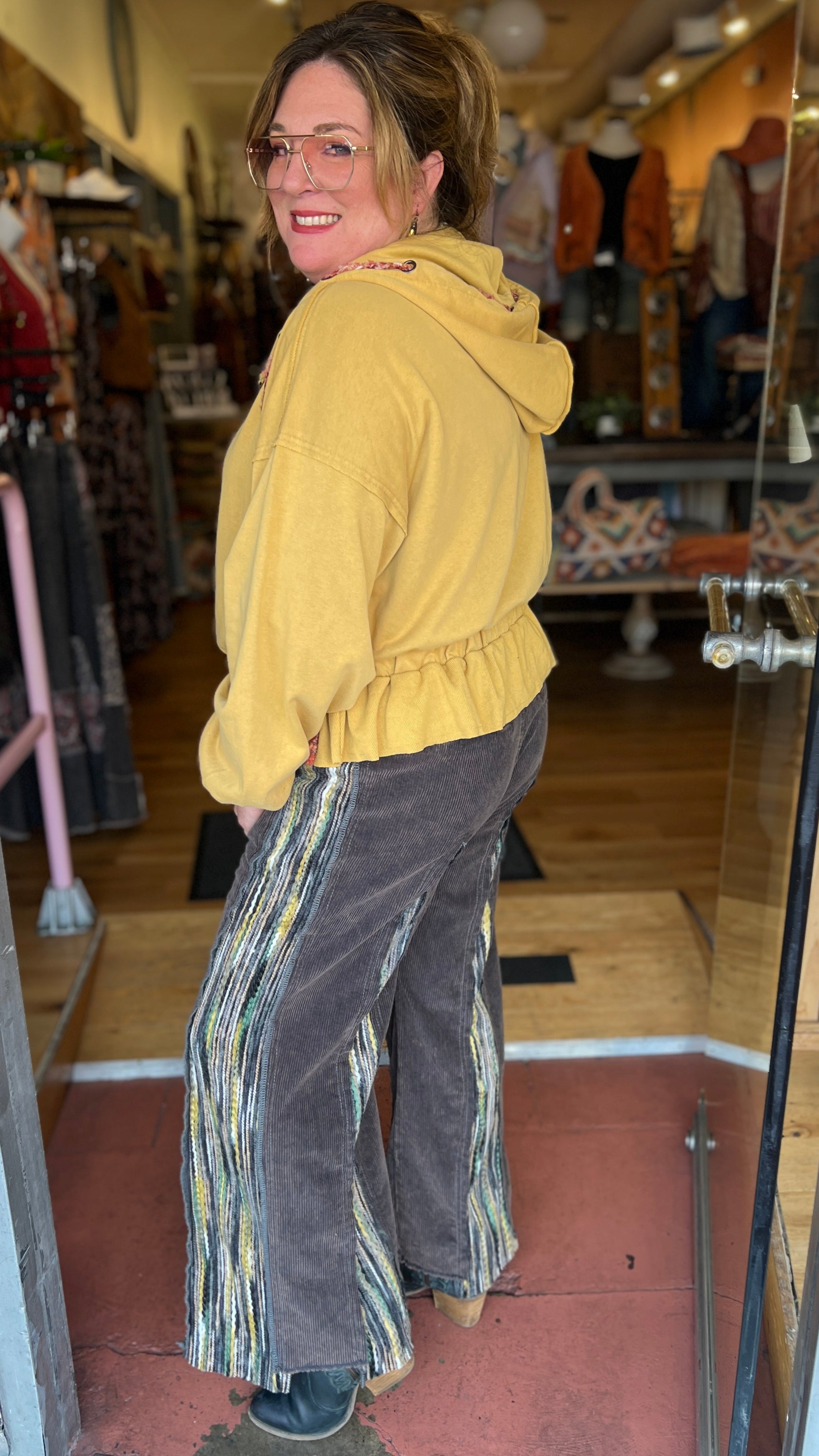 Add a little boho flair to your fall and winter wardrobe with these one-of-a-kind wide leg pants. Made from soft charcoal corduroy with colorful fabric panels, they’re bold, comfortable, and designed to stand out. Stretchy side panels and an elastic back waistband ensure all-day comfort, while the wide leg silhouette gives them an easy, flowy fit. Perfect for concerts, travel days, or casual weekends with boots and our mustard hoodie.