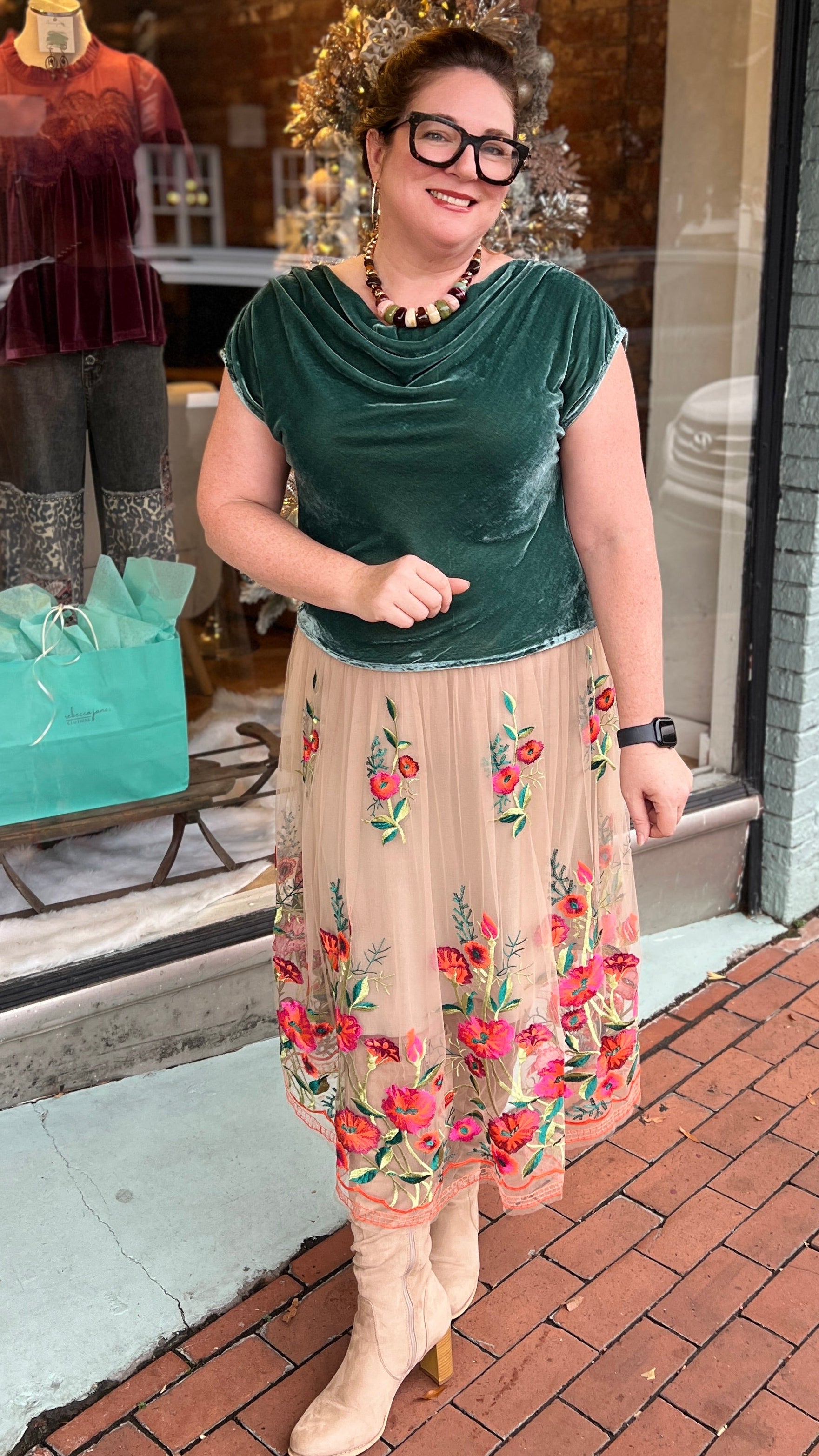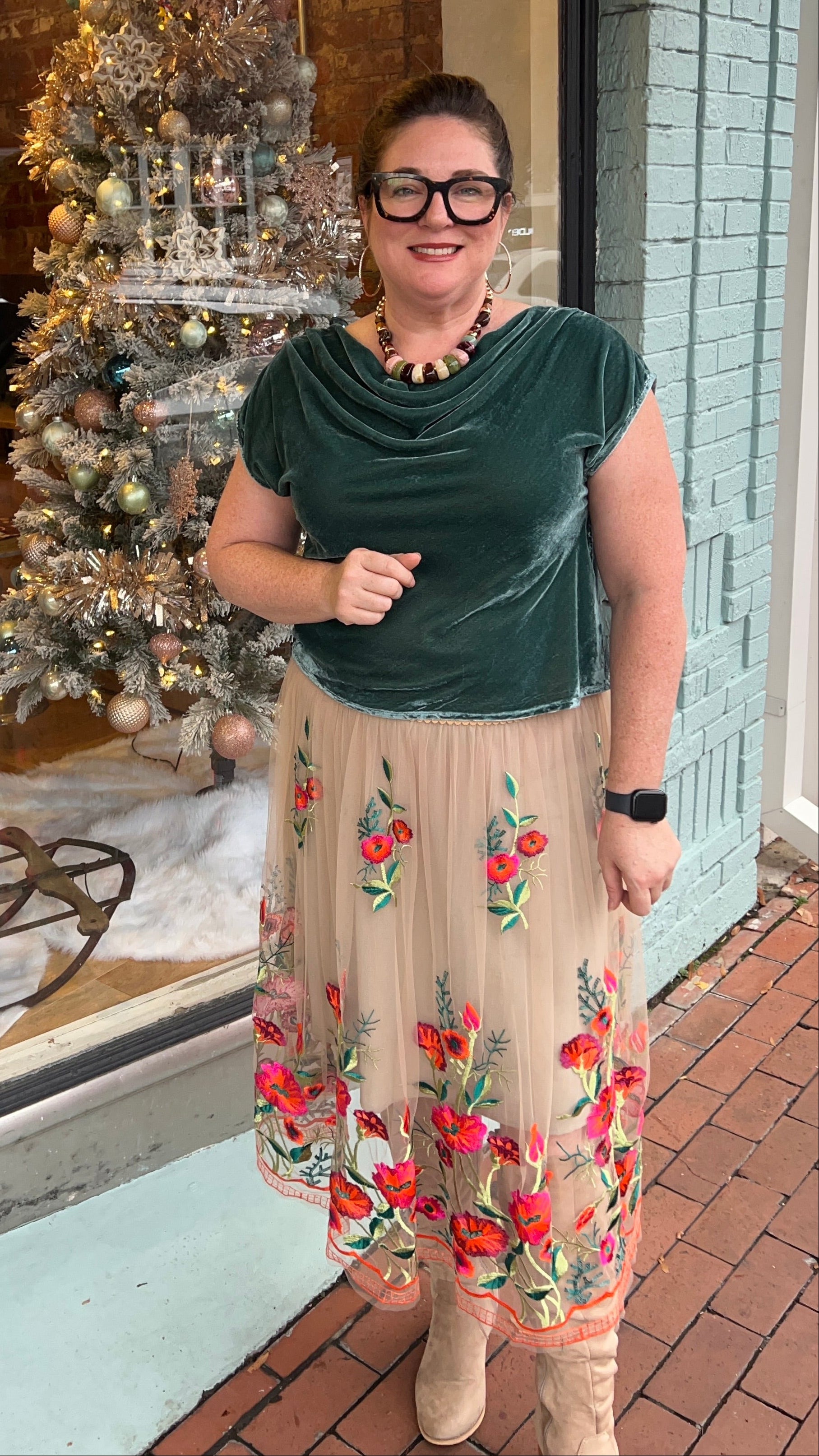 Perfect for the holiday season, it pairs beautifully with our Teal Velvet Top and the Aratta Cape for a stunning, head-to-toe festive outfit. And because the floral embroidery is timeless rather than overtly seasonal, this skirt transitions effortlessly into year-round styling — think weddings, date nights, parties, and special events.