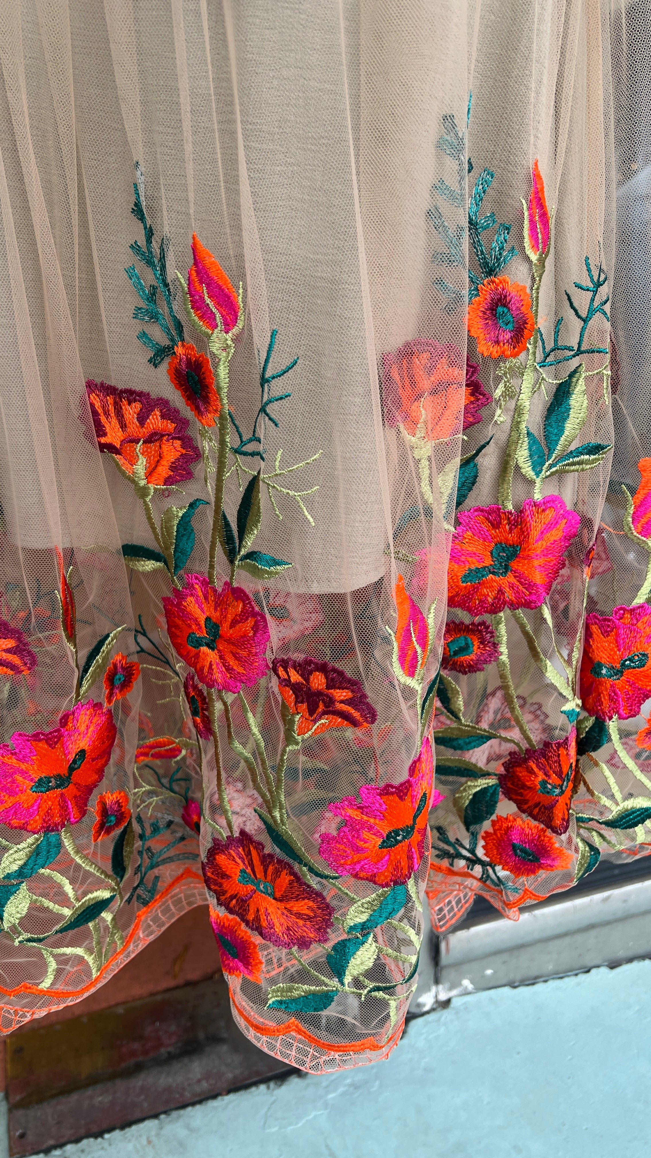 The Holiday Floral Embroidered Skirt by Aratta is a true statement piece — romantic, feminine, and beautifully crafted. This beige tulip–toned A-line skirt features delicate floral embroidery over soft mesh, creating a dimensional, ethereal look that feels instantly special. The elastic waistband and full lining make it comfortable and easy to wear, while the A-line silhouette flatters every shape.