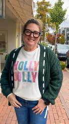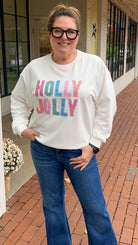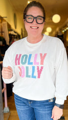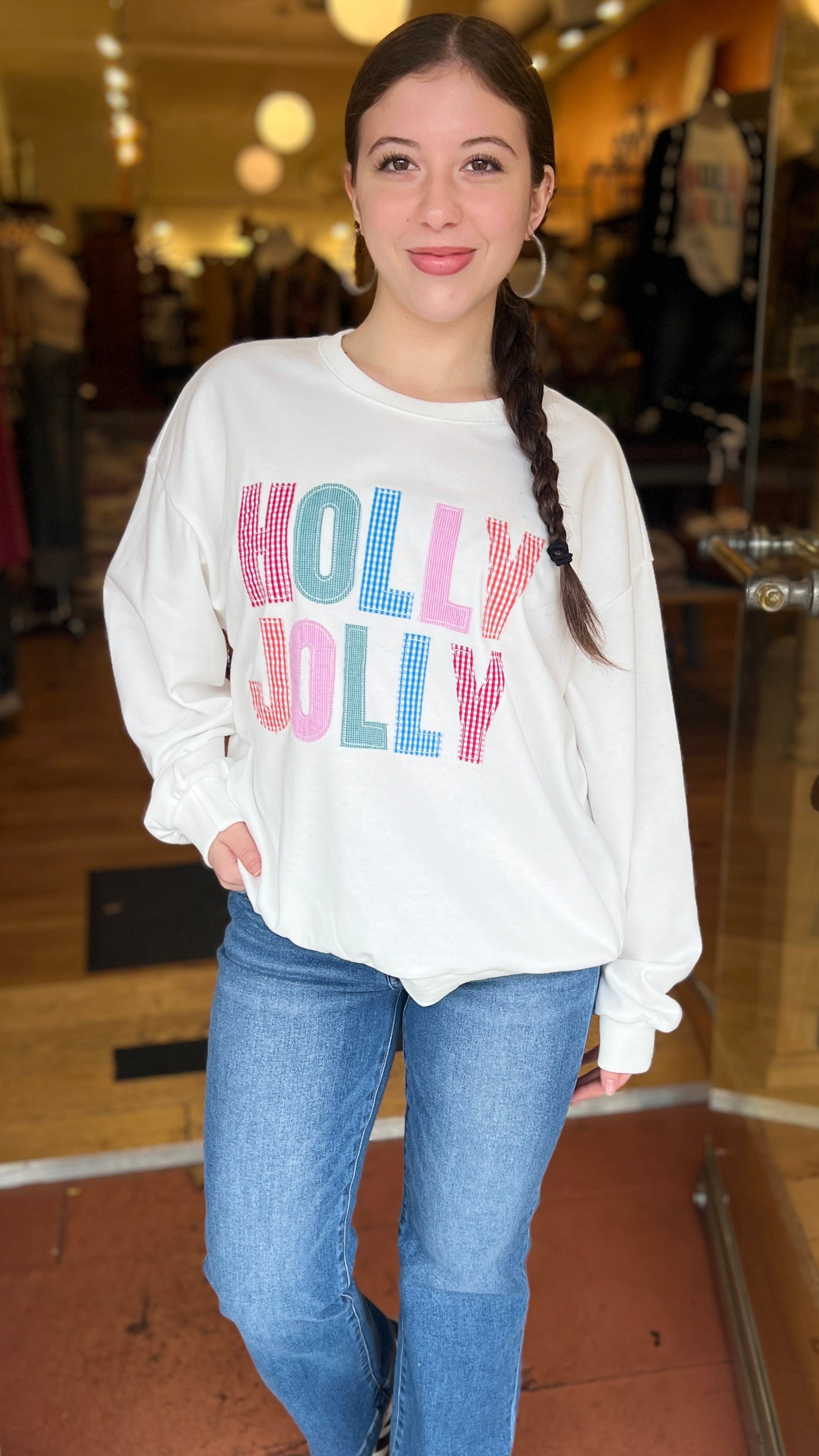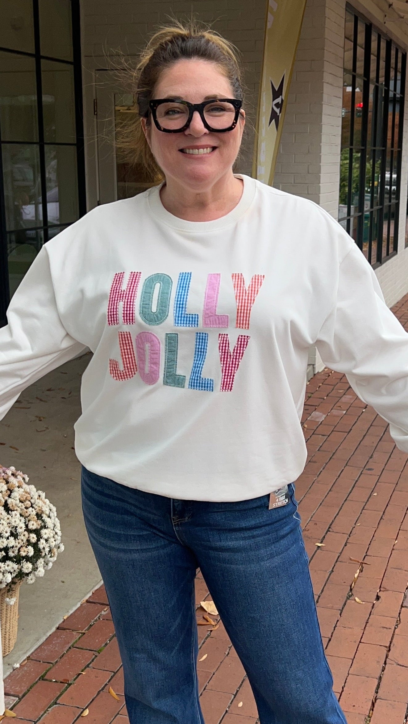 Bring on the cheer — the Holly Jolly Patchwork Pullover Top is the cutest way to step into the holiday season. This soft white pullover features gingham fabric letters spelling out HOLLY JOLLY in a charming patchwork style that’s festive without being over the top.