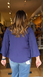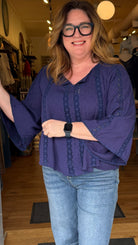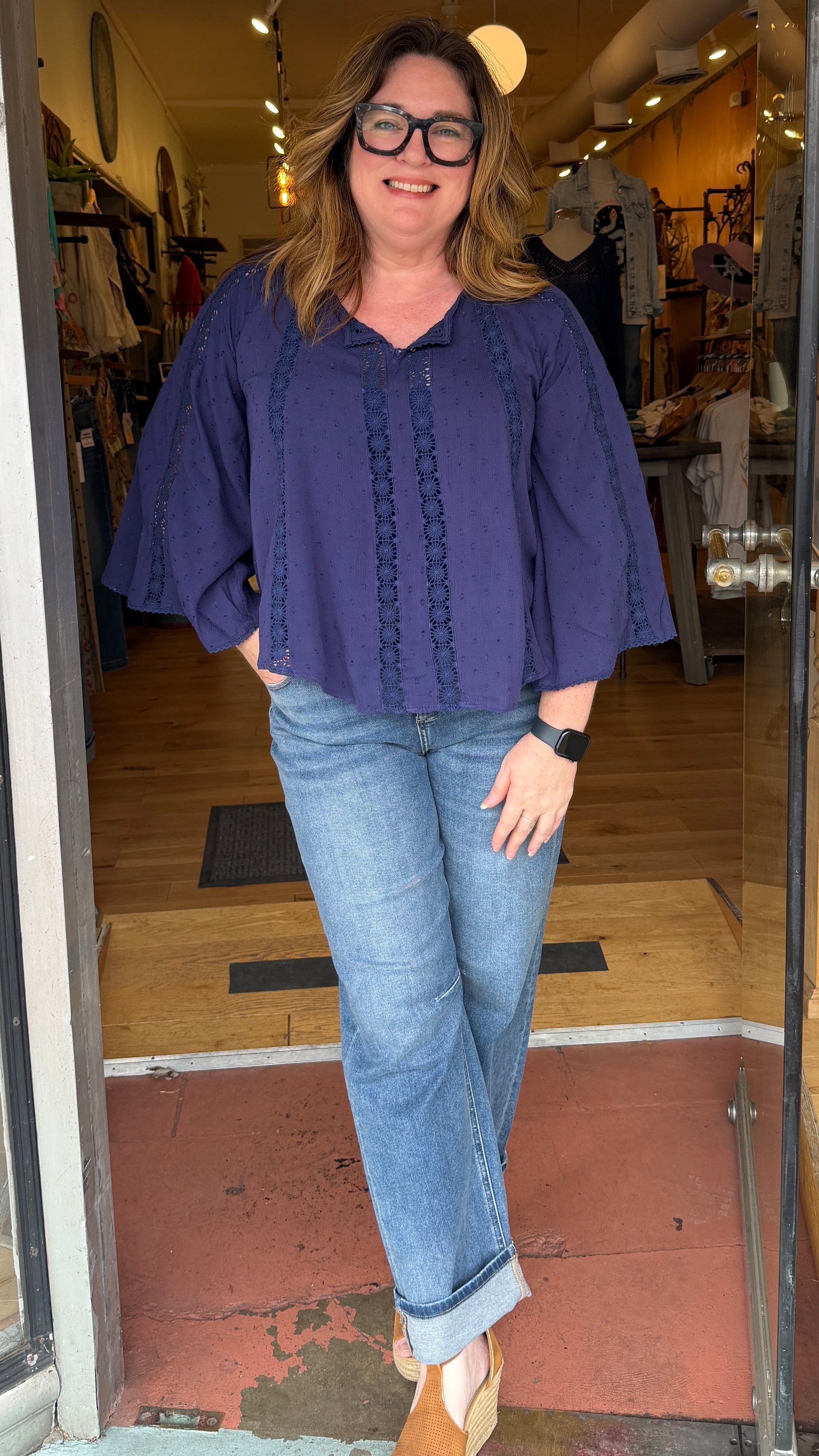 Elevate your everyday style with this romantic navy blouse featuring delicate lace insets and a dreamy Swiss dot texture. Its breezy, oversized silhouette offers an effortless, flattering flow that transitions perfectly from casual denim to elegant skirts.