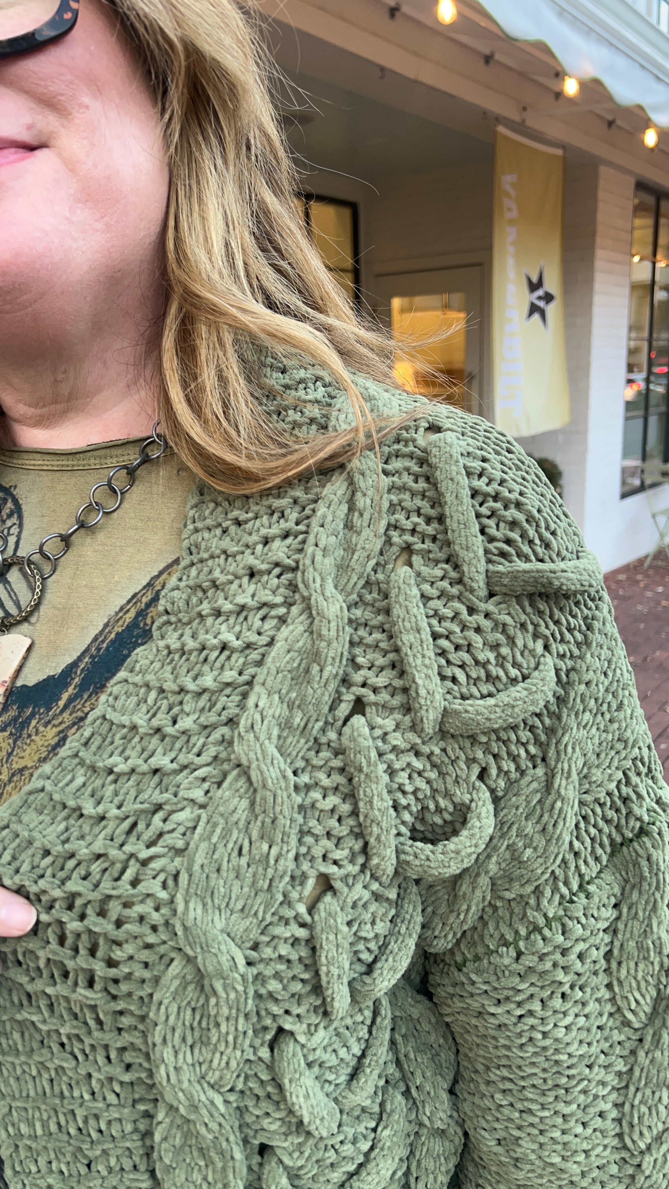 Cozy, textured, and effortlessly stylish — the Olive Herringbone Cable Knit Cardigan is the layer you’ll want to live in all season. Made from a thick, plush chenille-like yarn, it blends a classic herringbone and cable knit pattern with an oversized, easygoing silhouette that feels as good as it looks.