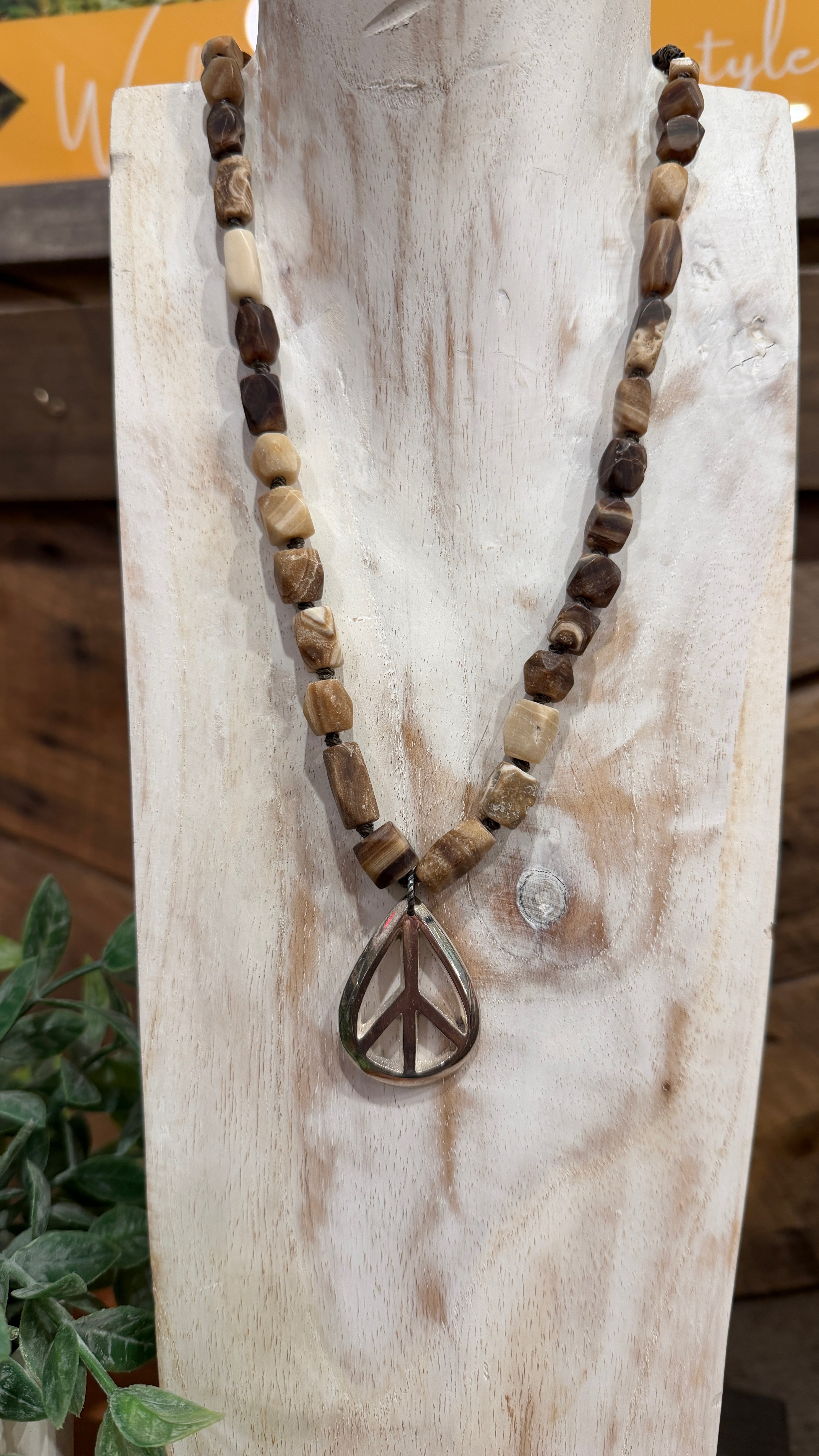 Peace Sign Pendant Brown Calcite Beaded Necklace