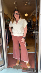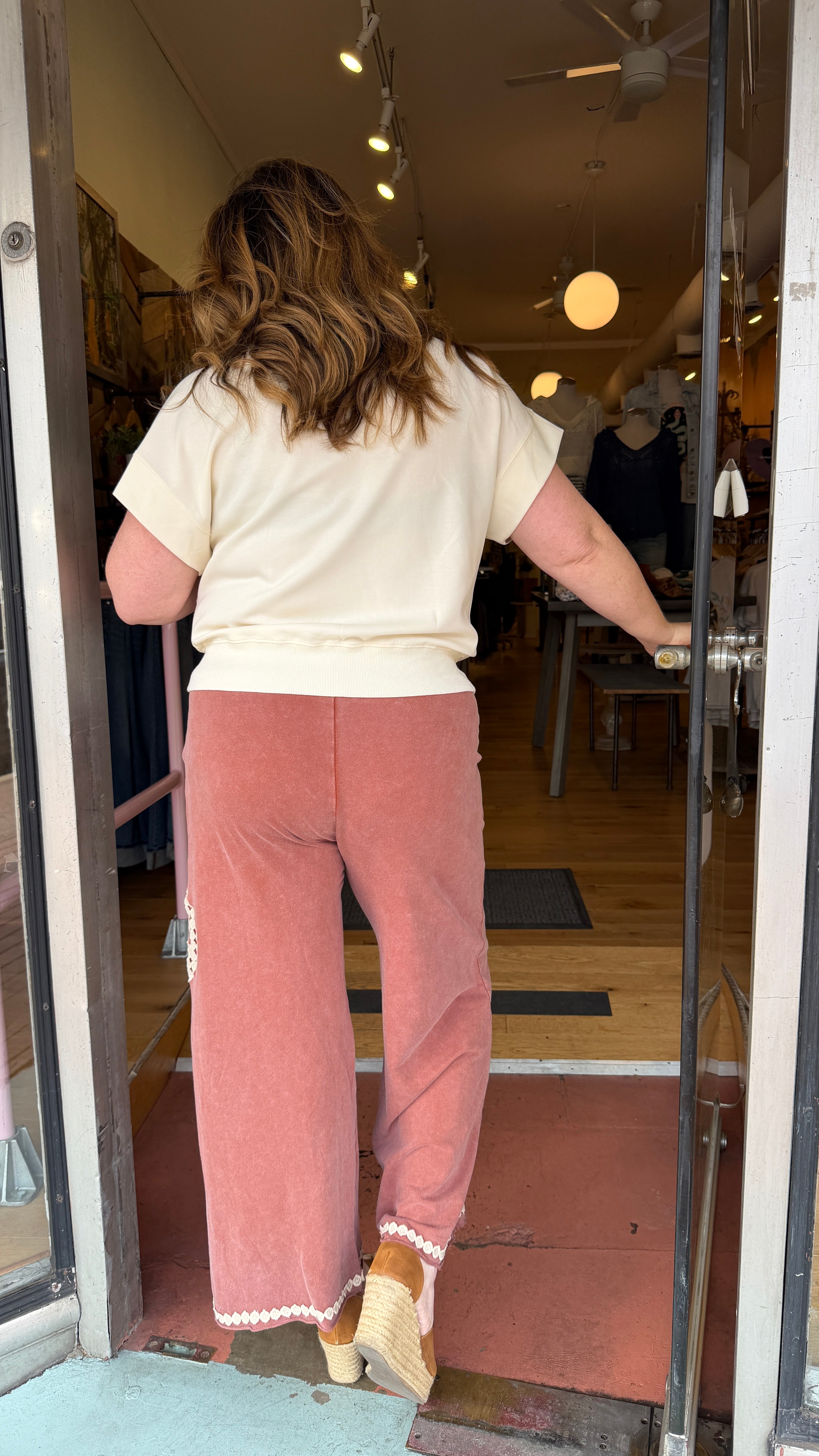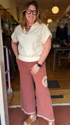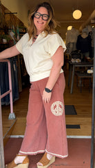 Experience ultimate serenity in these ultra-soft, wide-leg lounge pants featuring a vintage-inspired crochet peace sign and delicate hem trim. Designed for effortless boho style, these breathable pants transition perfectly from a coastal escape to your favorite cozy corner at home. Raw Edge Hem