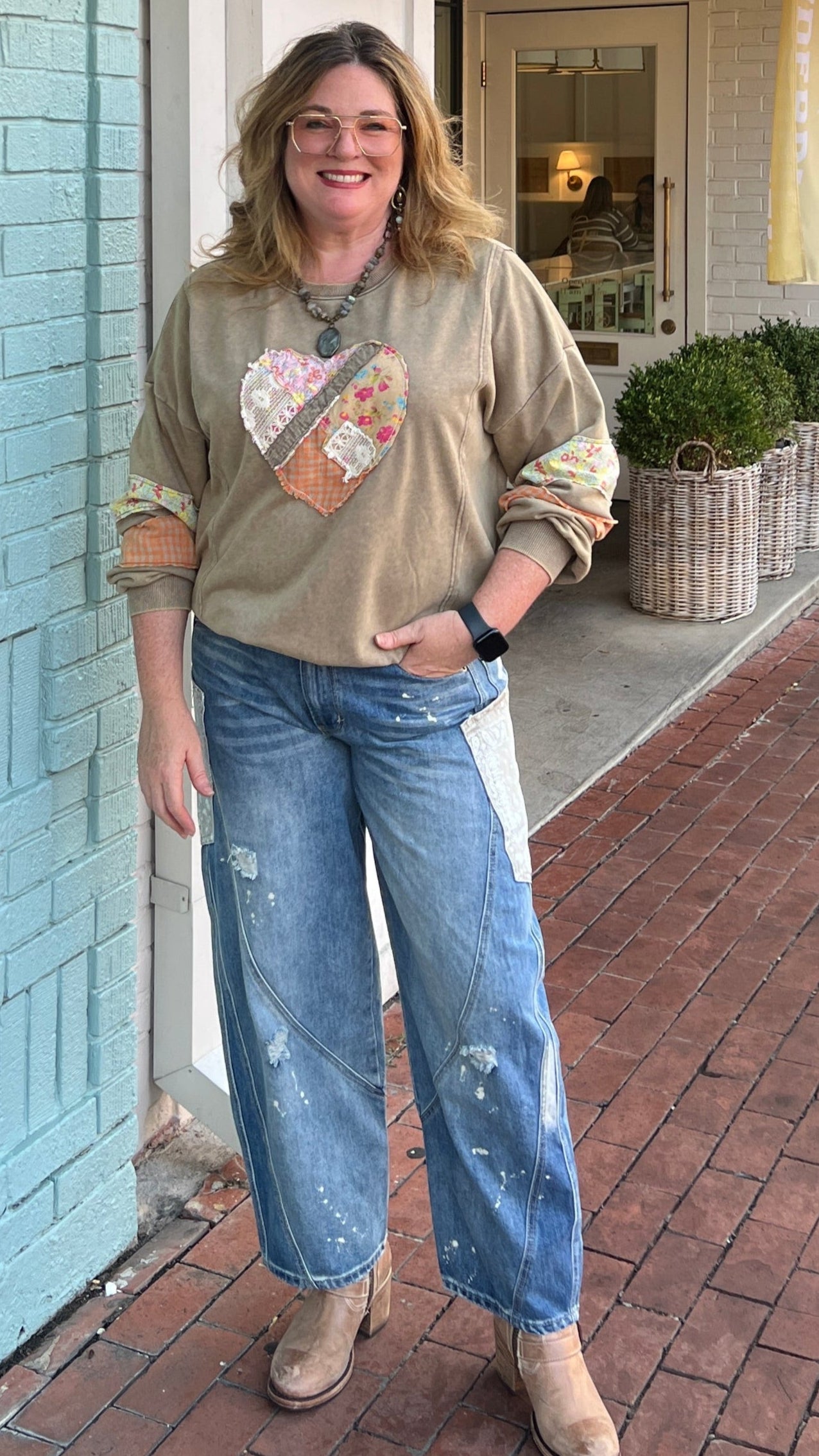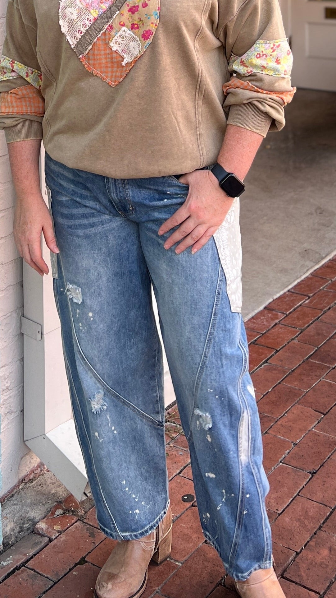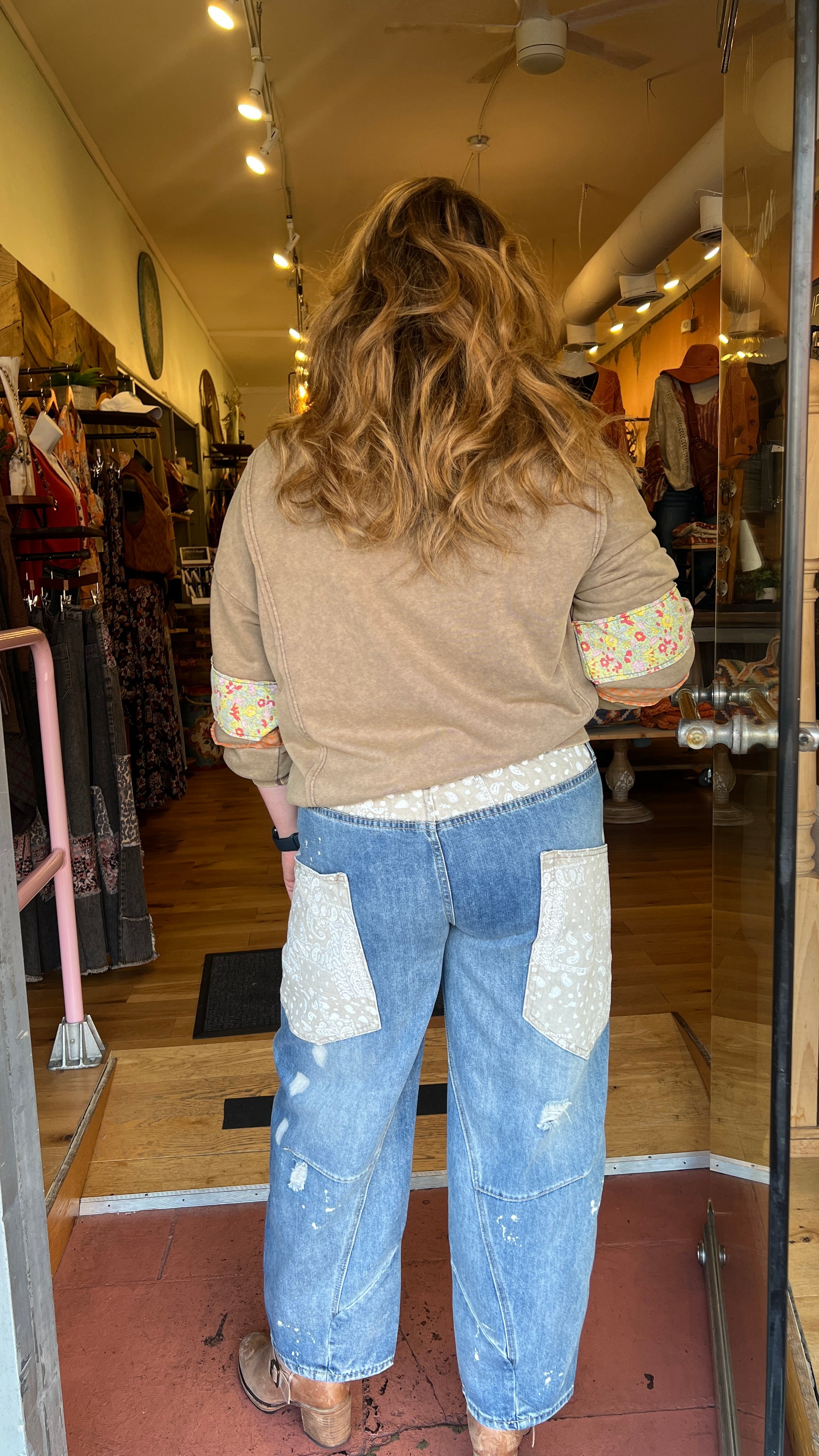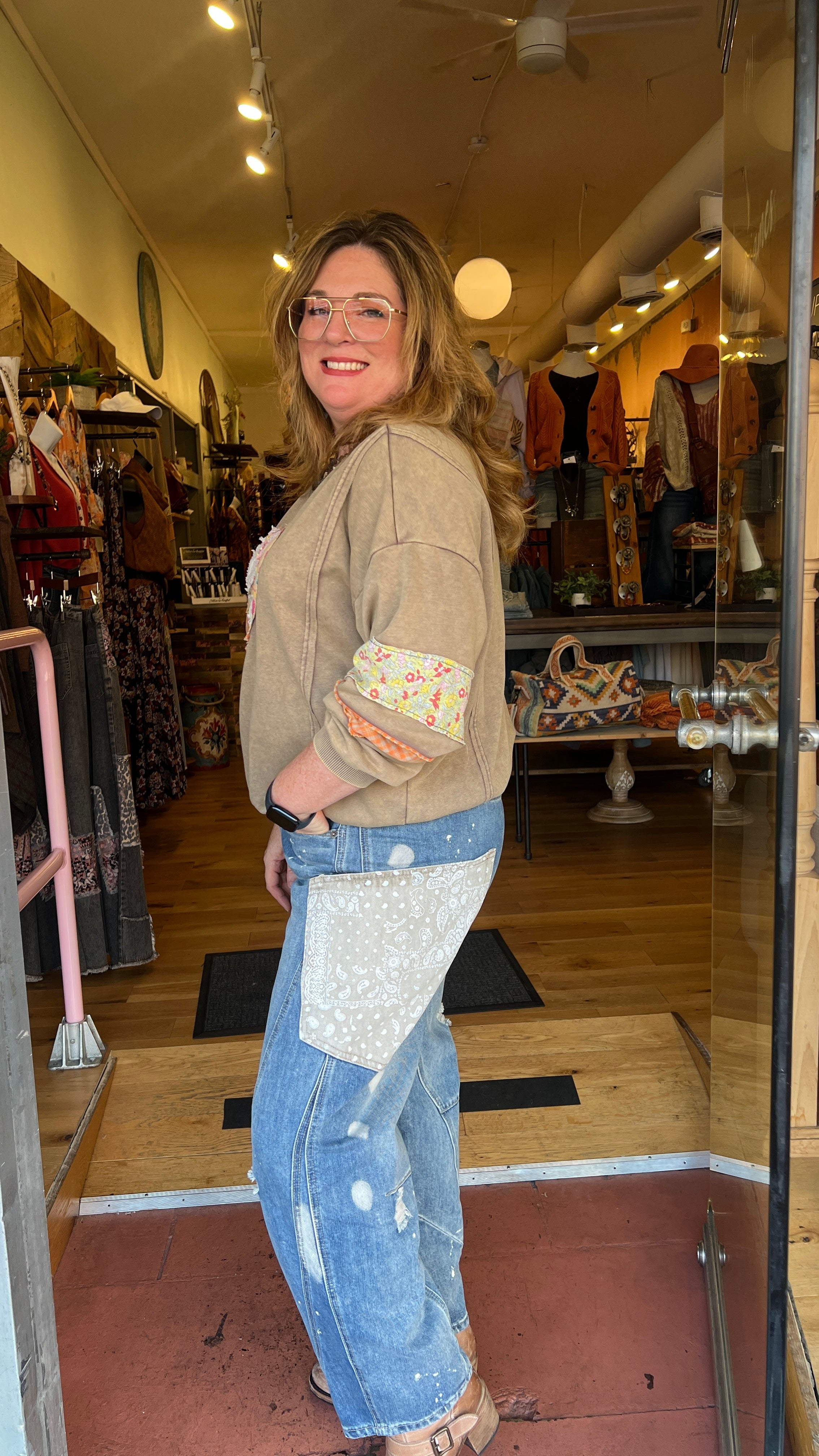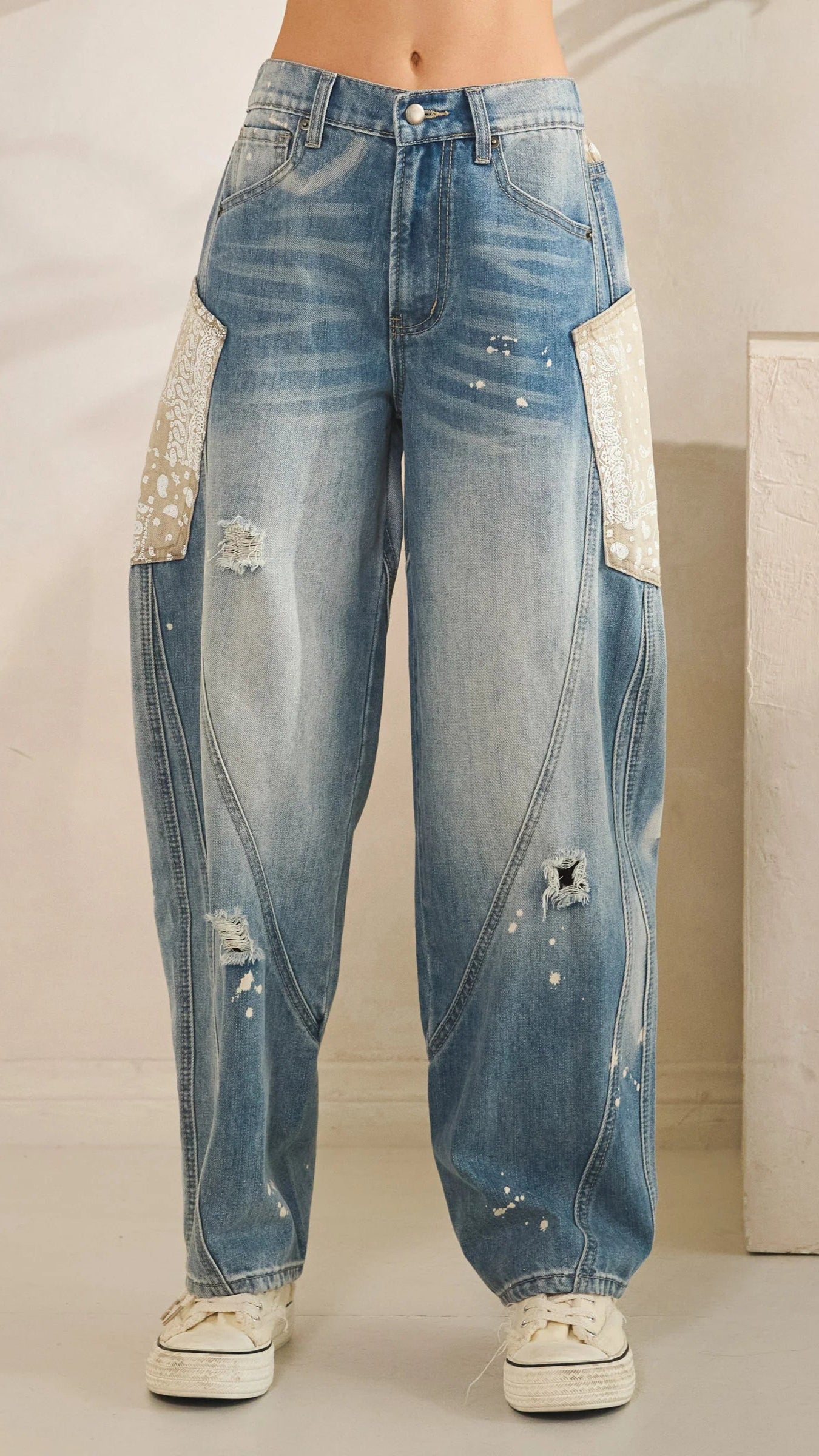 A fresh take on boho denim—these relaxed barrel jeans feature standout oversized bandana print pockets, subtle distressing, and bleach-spot details for a lived-in vibe. Designed with unique seaming for a flattering fit, they balance comfort and style with an elastic back waistband. Perfect for weekend outings, concerts, or travel days when you want denim that stands out from the rest.