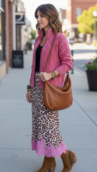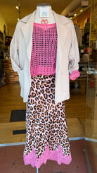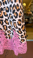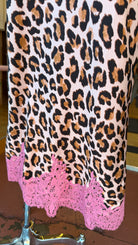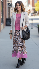 Elevate your wardrobe with the perfect blend of fierce and feminine. This neutral-toned pink leopard maxi skirt is crafted from high-shine, buttery-soft satin that drapes elegantly over your curves. Featuring a romantic intricate lace-trimmed hem and a flattering fit & flare silhouette, this statement piece transitions effortlessly from a chic daytime look with boots to a high-glamour evening ensemble.