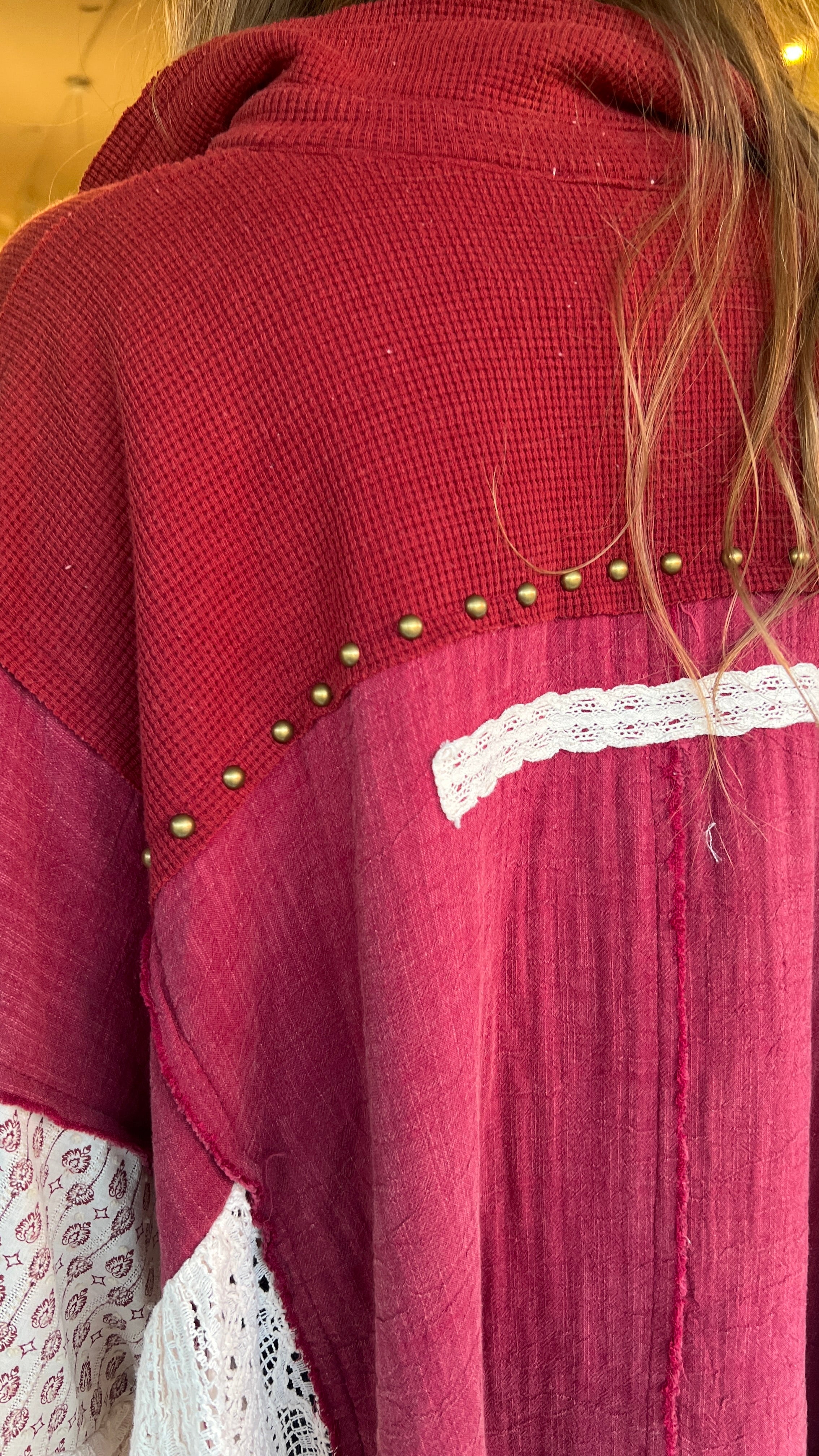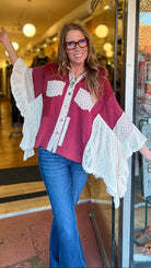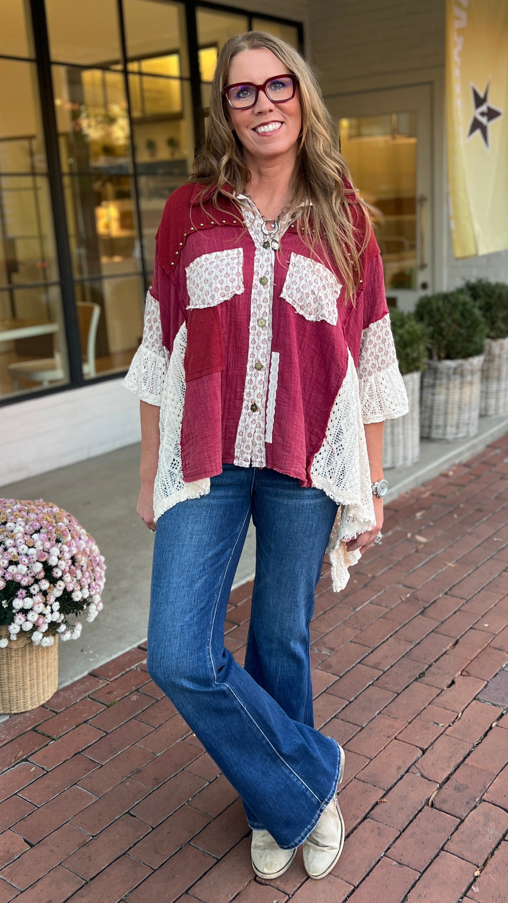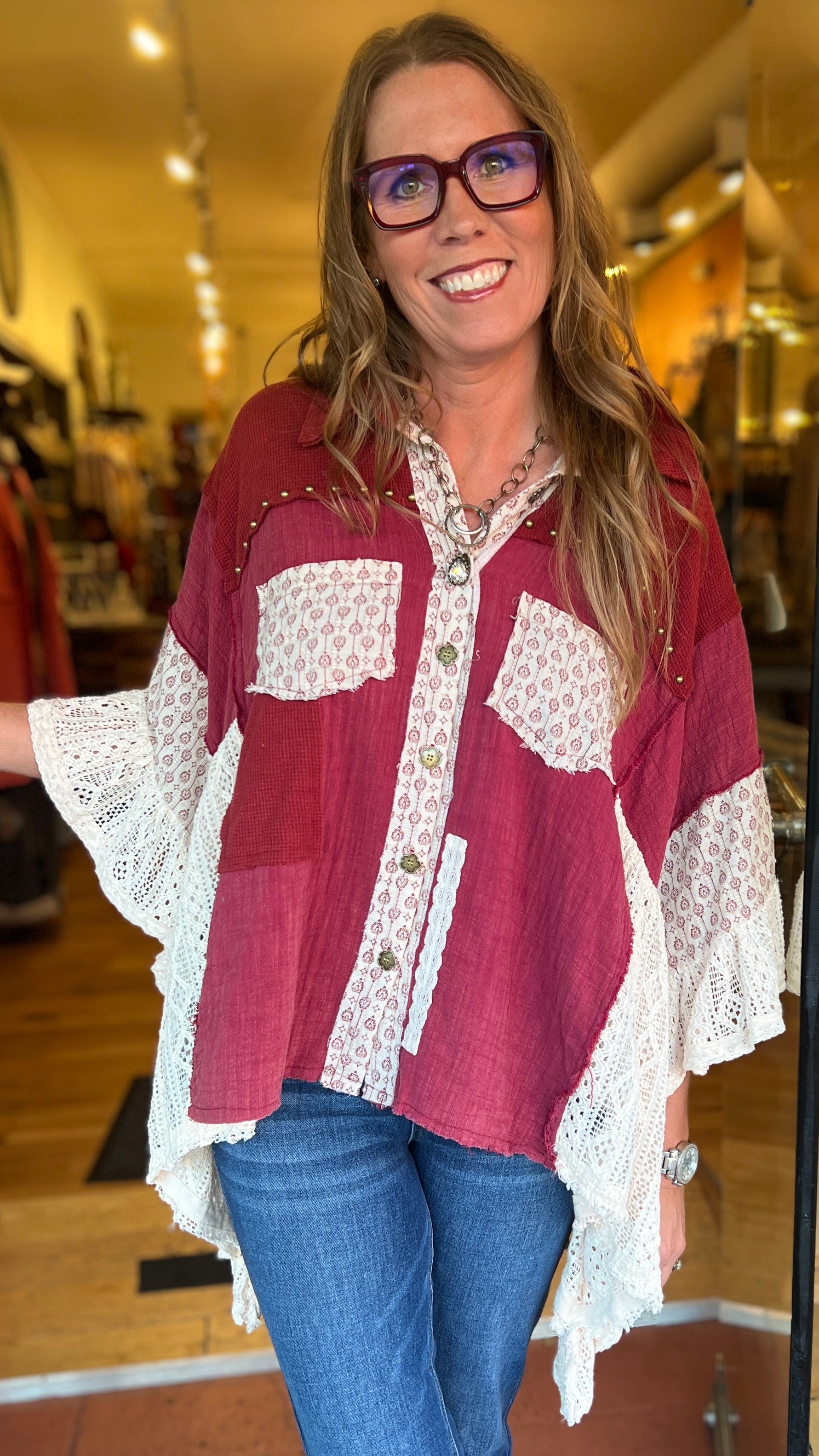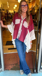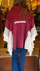 The Ruby Red Boho Poncho Top is made for the holiday season — bold, beautiful, and effortlessly bohemian. Crafted from 100% double gauze cotton, this festive top features lace and crochet patch details, ruffled sleeve openings, and front pockets for a touch of casual charm.