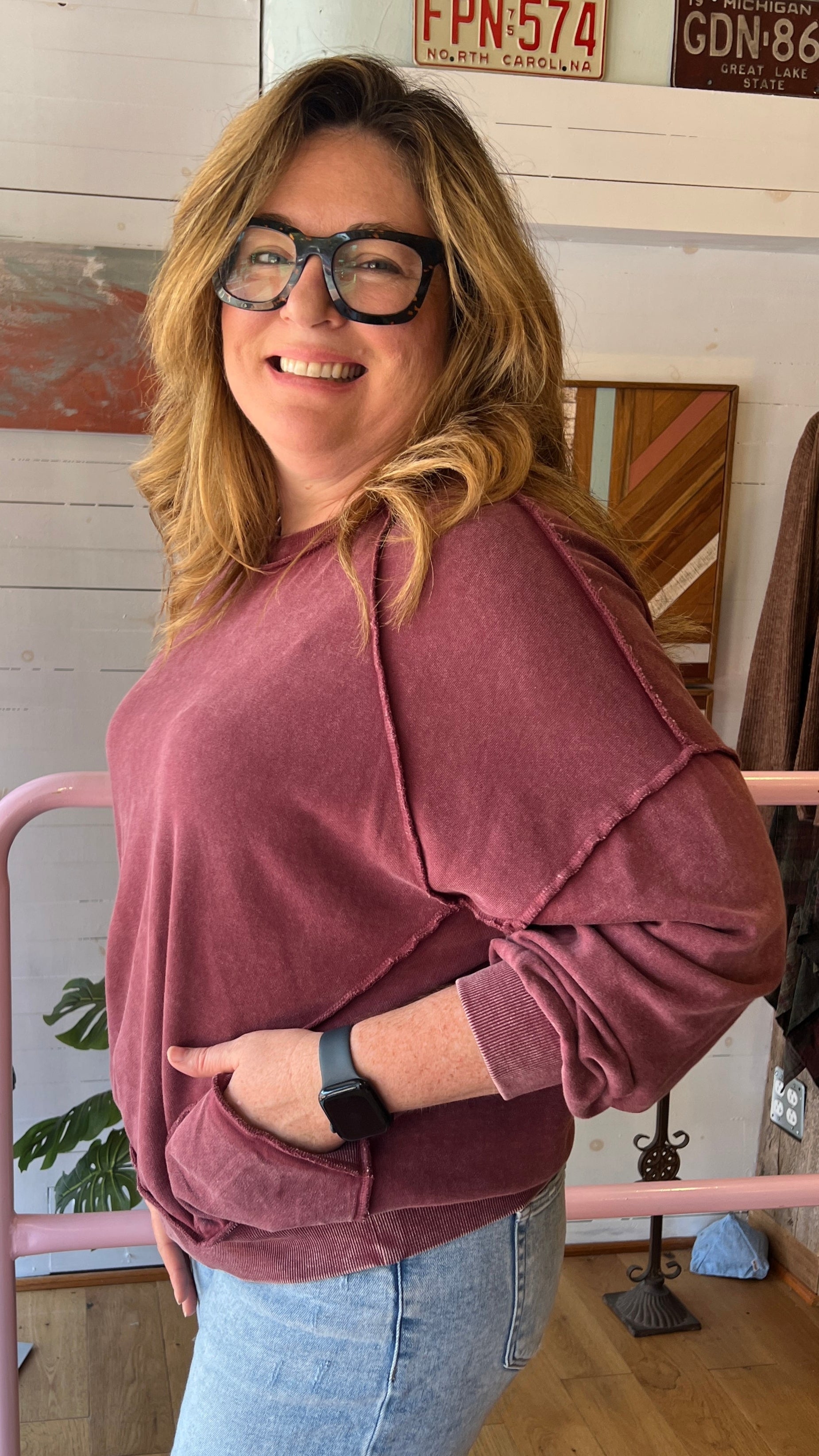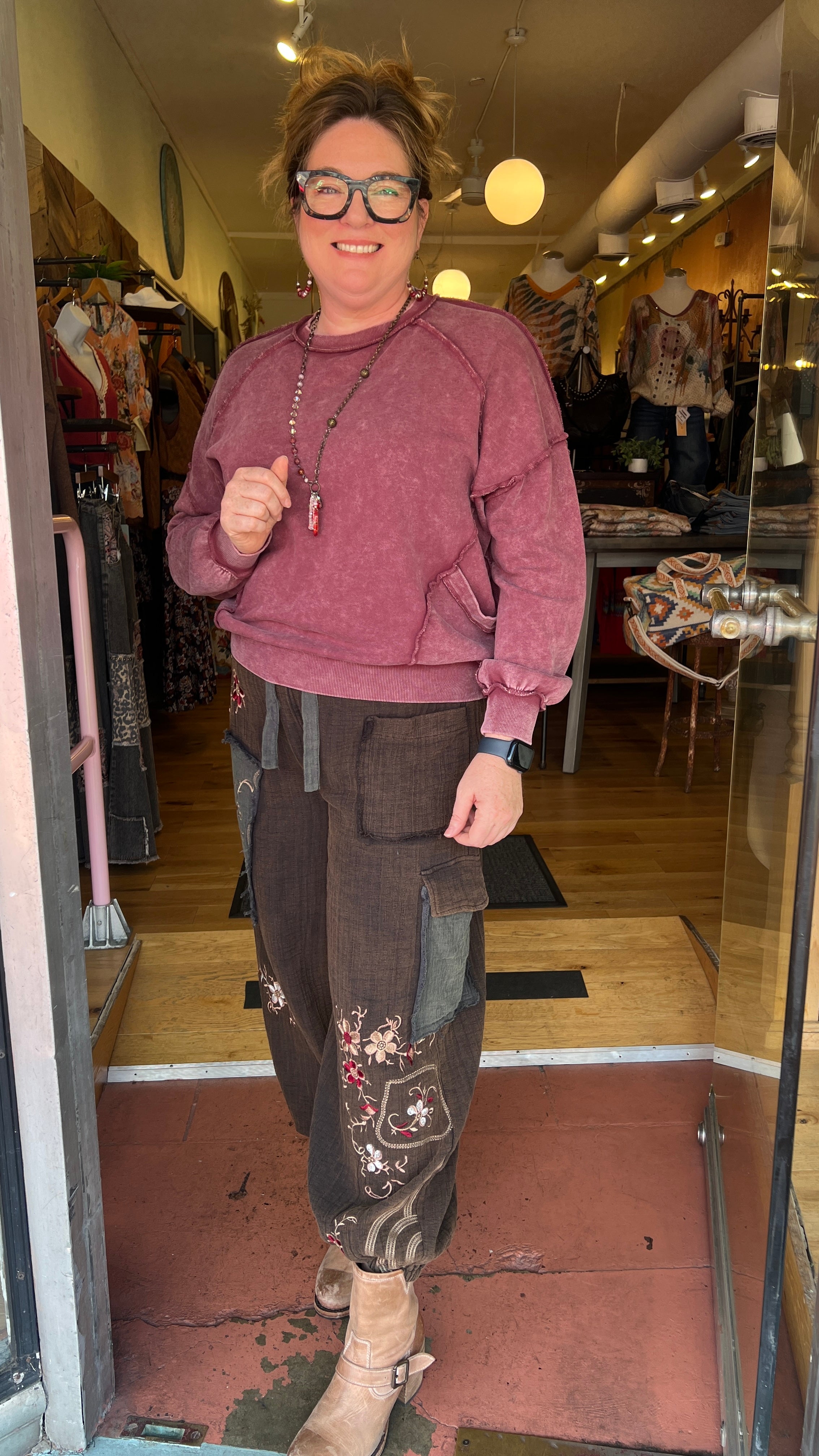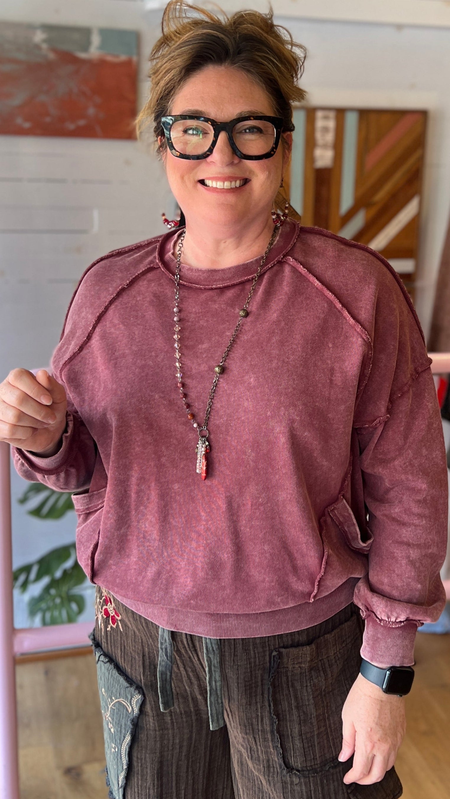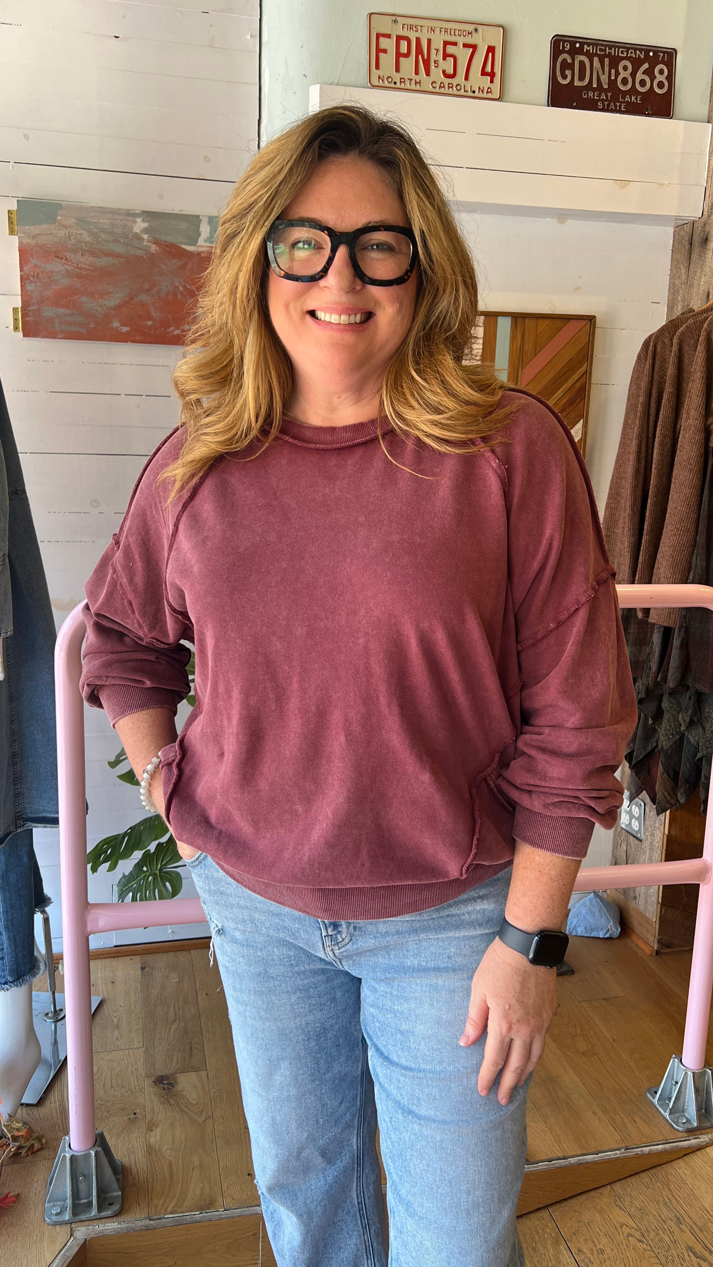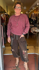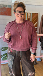 This mineral-washed wine pullover is your go-to for cozy, effortless style. With its oversized fit, dropped shoulders, and front pockets, it blends comfort and casual chic in a way you’ll love to wear on repeat. The exposed seam detailing and ribbed cuffs add just the right amount of edge, while the soft 100% cotton knit keeps it breathable and easy to layer. Perfect for tailgating, running errands, or pairing with our Enchanted Forest pants or your favorite skirts this fall, this pullover is made for relaxed days and laid-back nights.