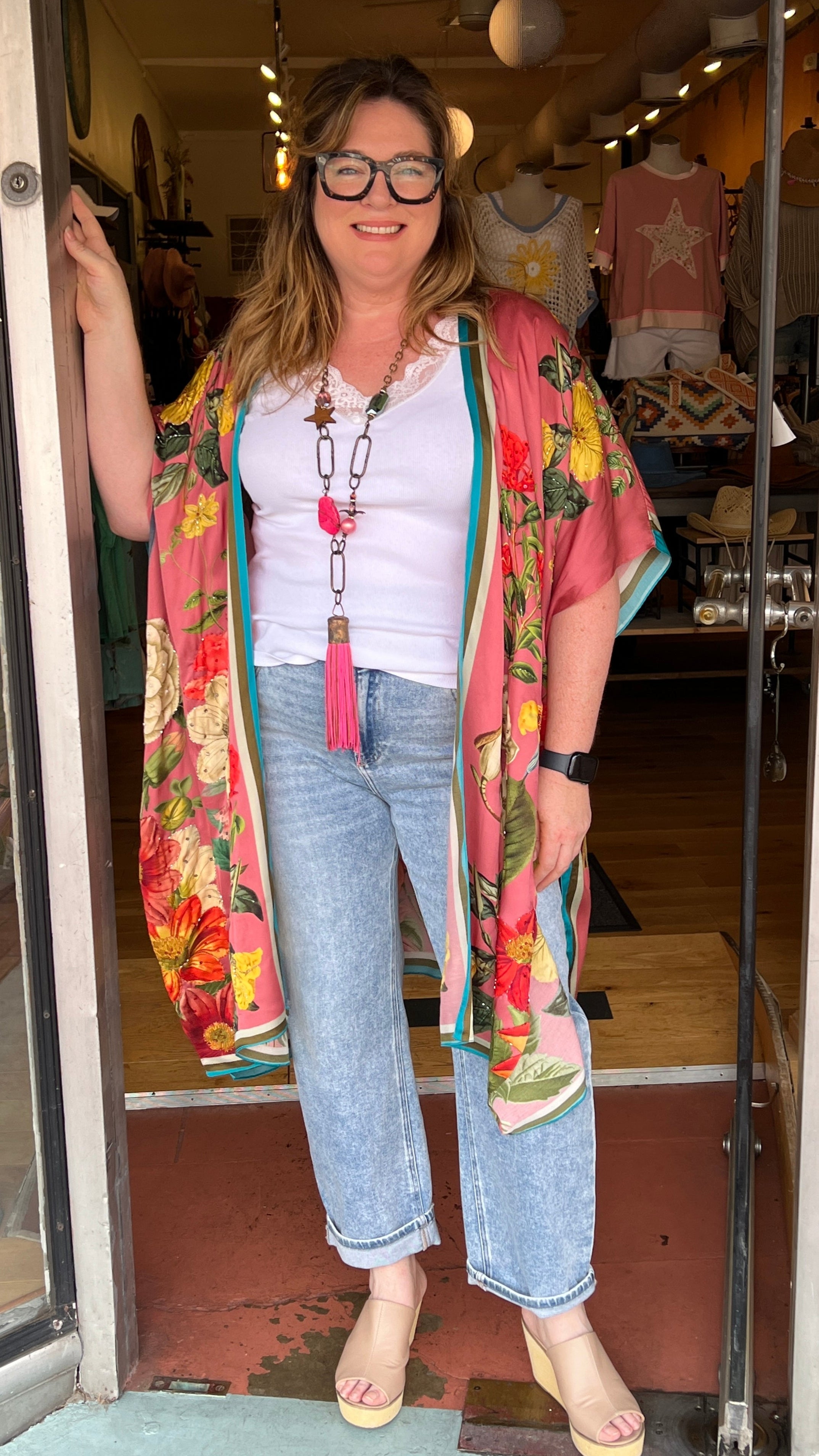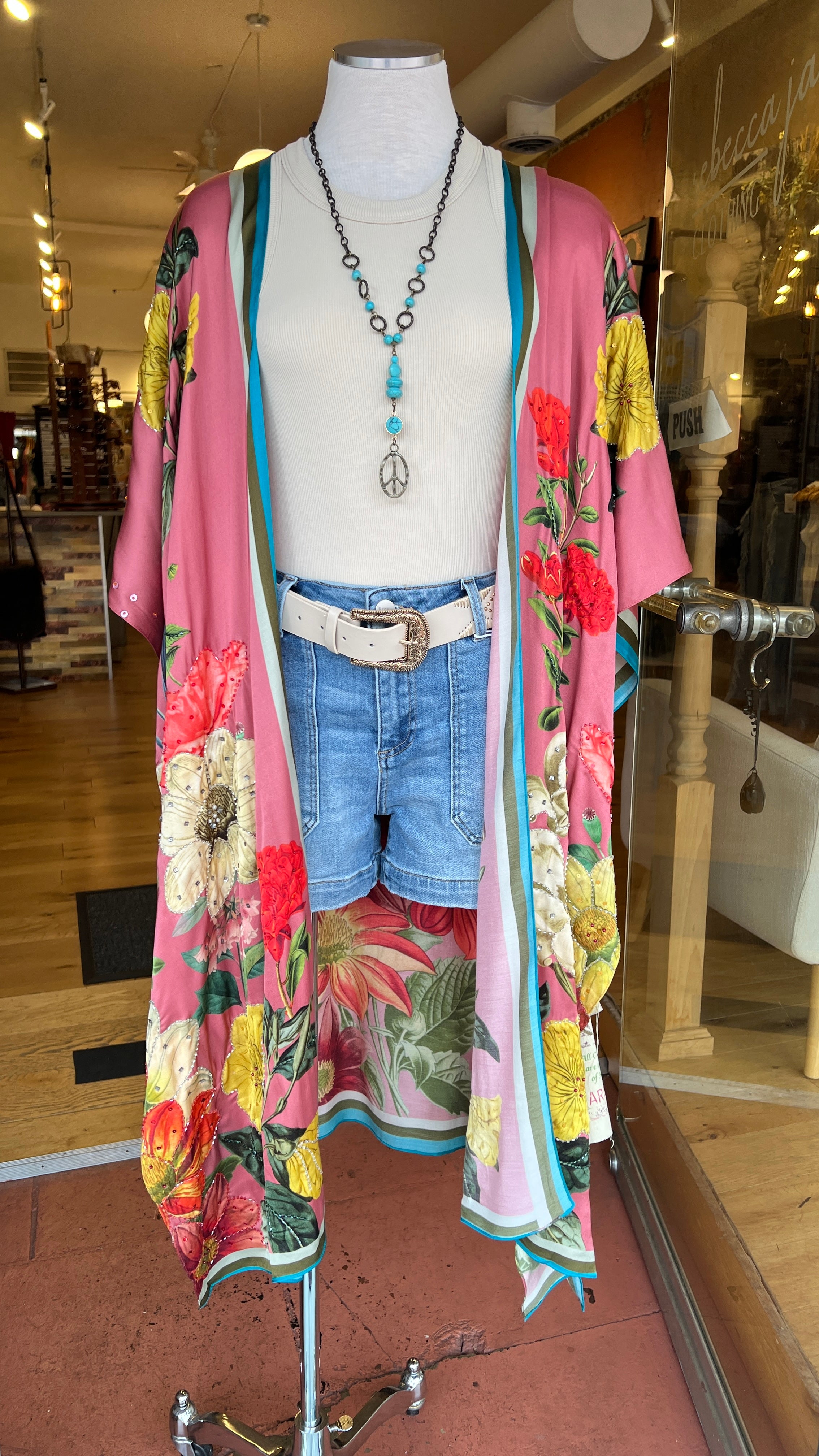 The Tropical Love Beaded Floral Kimono by Aratta is a true statement piece, blending elegance, artistry, and effortless boho luxury. Made from soft, breathable 100% modal, this dusty rose floral and striped border print kimono is elevated with intricate hand beading that adds shimmer and depth to every movement.