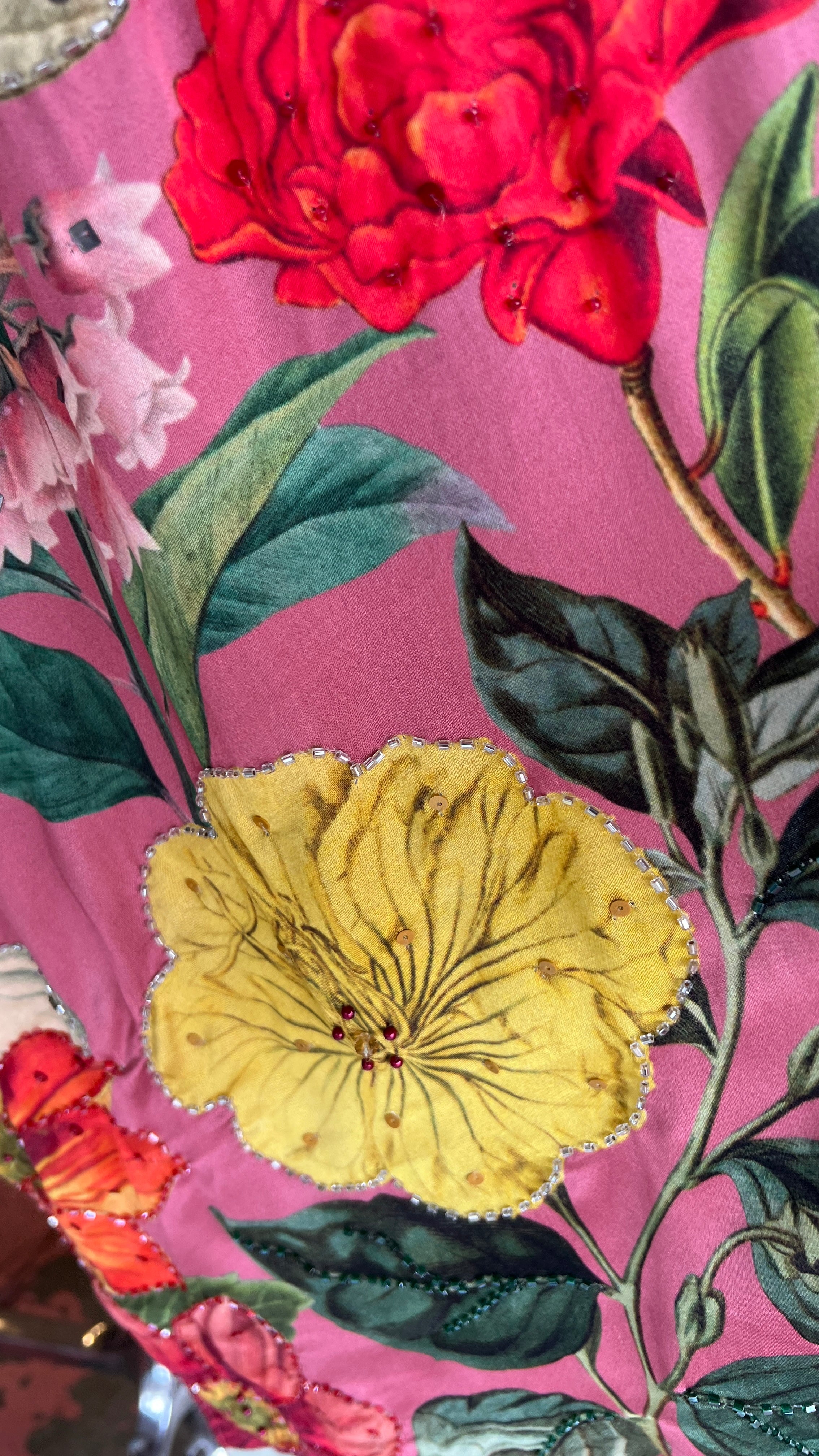 What truly sets it apart? The pops of yellow that shine against the dusty mauve background, creating a beautifully balanced palette that’s both bold and romantic. With side slits for easy layering, it’s the kind of piece that makes any outfit feel instantly special.