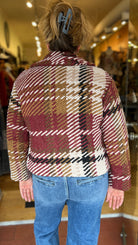 Soft bouclé coat in wine, black, cream, and camel plaid