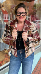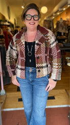 The Autumn Gold Abstract Plaid Bouclé Coat is a chic layering piece that brings cozy texture and modern style to your fall and winter wardrobe. Crafted from soft bouclé fabric in shades of wine, black, cream, and camel, this coat has a double button closure and lapel that give it a tailored finish. Its abstract plaid design makes it a standout piece, while the mid-weight fabric keeps you warm without bulk. Style it with a black top and jeans for a polished everyday look or layer it over our Camel Open Weave Sweater for added boho charm. Designed to fit slightly oversized, it delivers that relaxed, effortless vibe, but you can size down for a more tailored, blazer-style look.