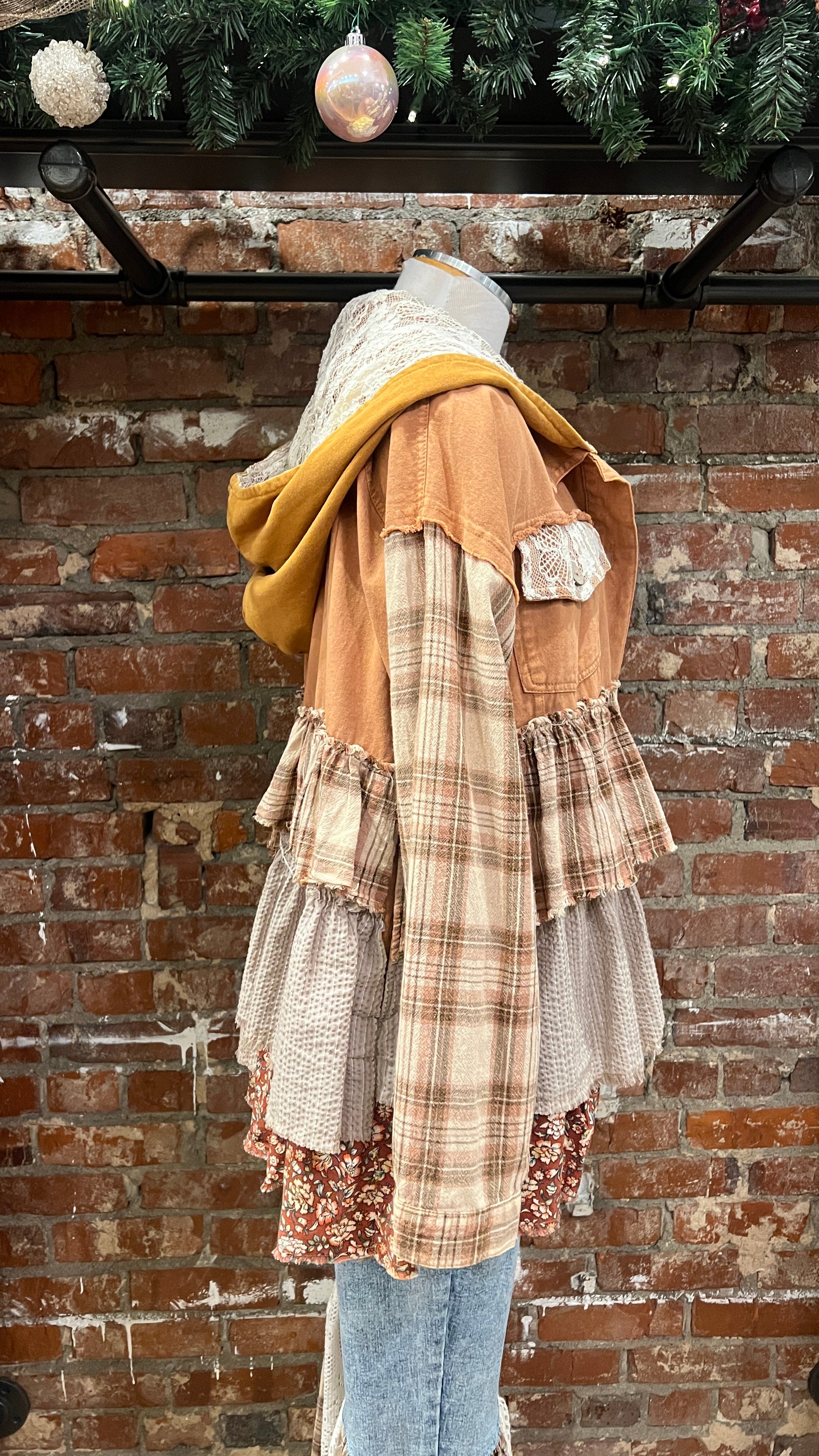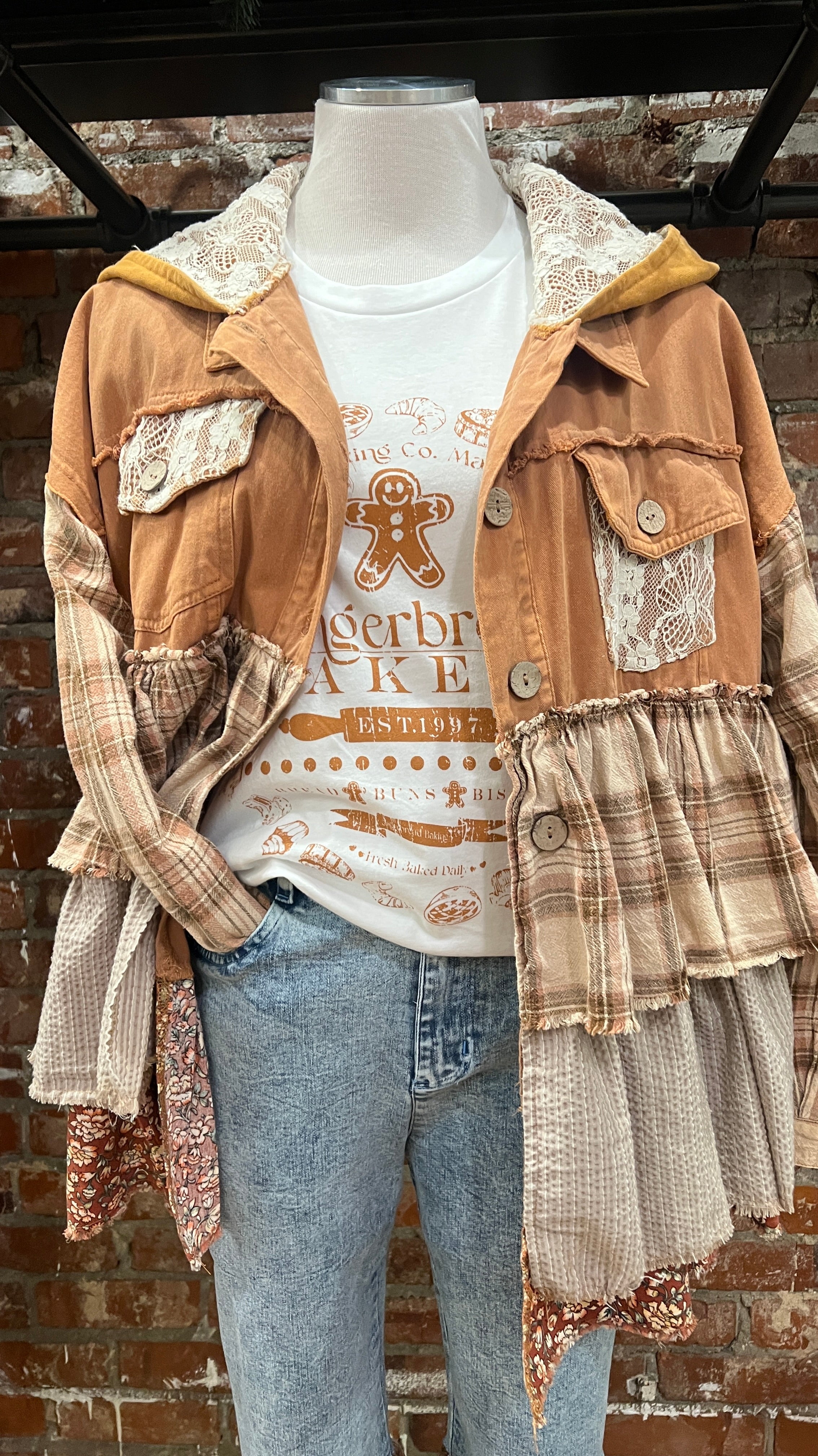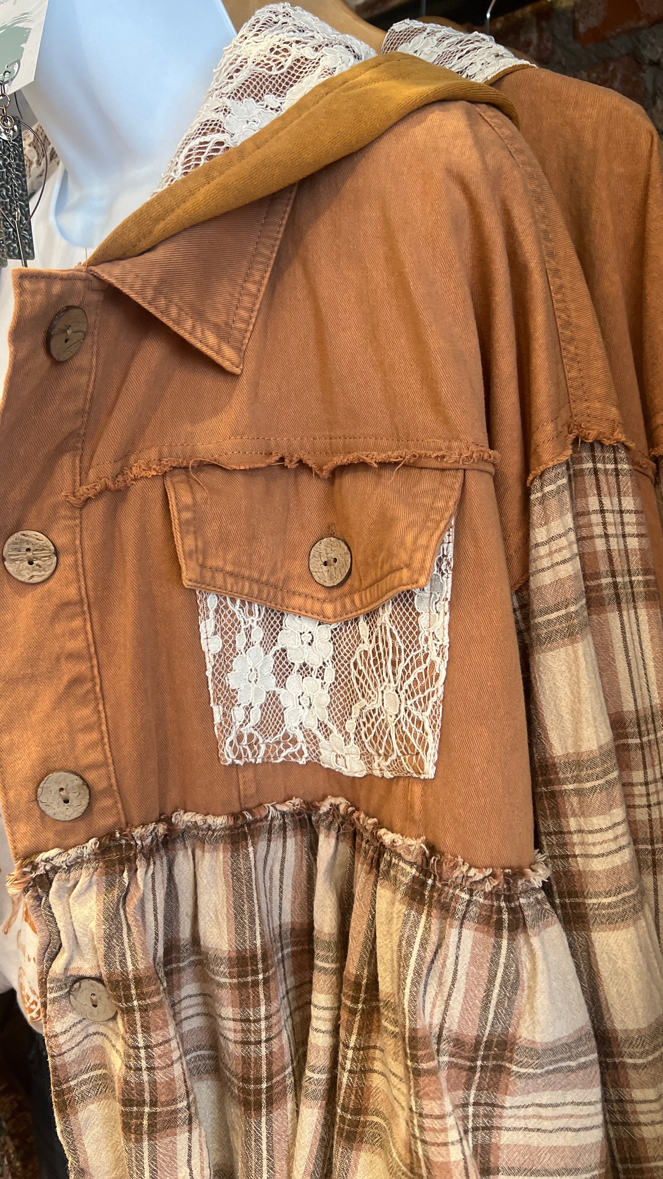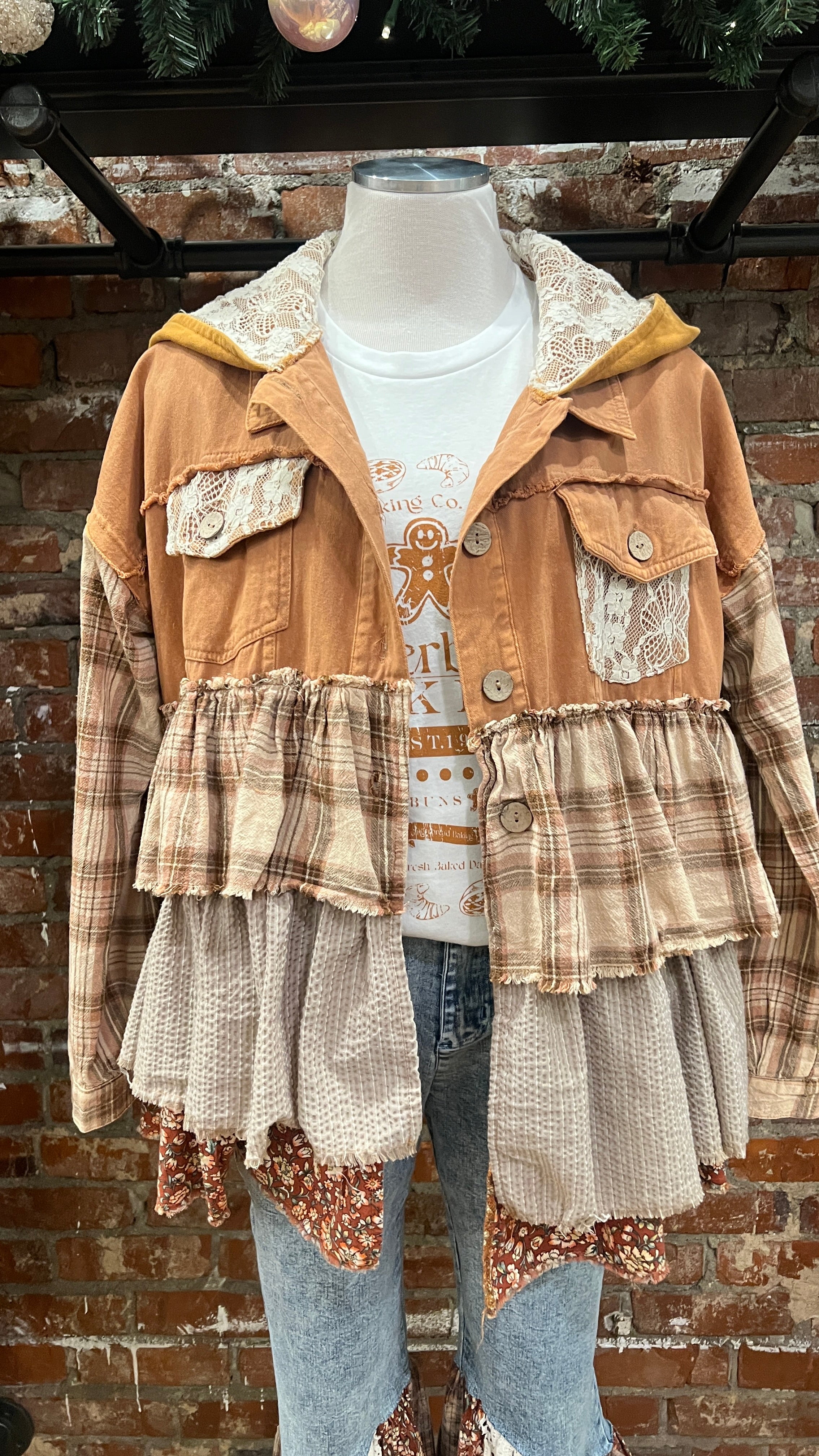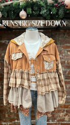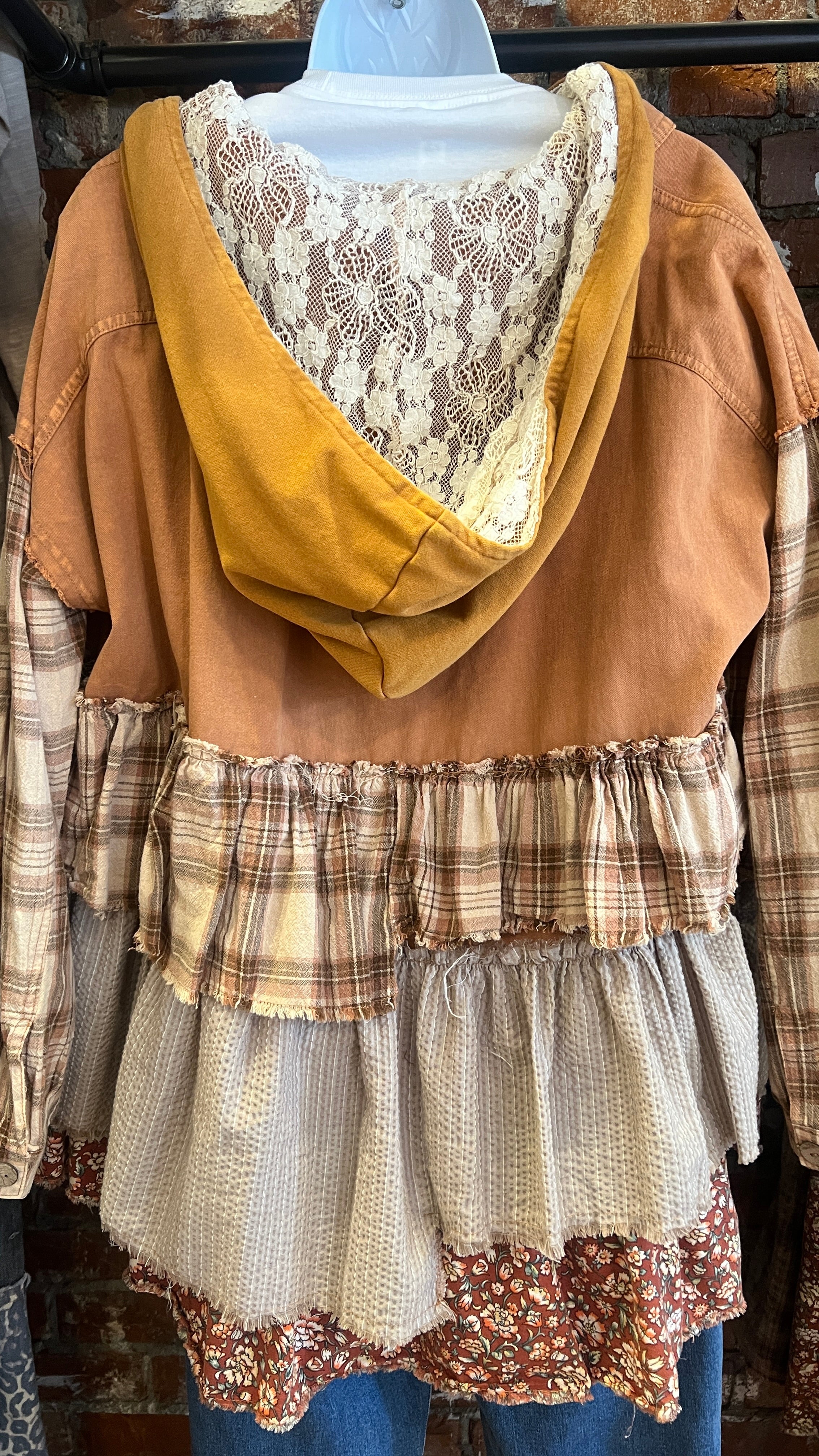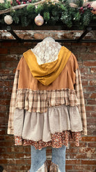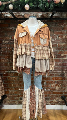 The Camel Mixed Fabric Ruffled Hoodie is the cozy, oversized layer your holiday wardrobe has been waiting for. Designed in a warm camel tone with a soft mixed-fabric feel, this hoodie brings the perfect blend of comfort and boho charm. The hood is lined with cream lace, adding a sweet, feminine touch that makes it feel extra special.