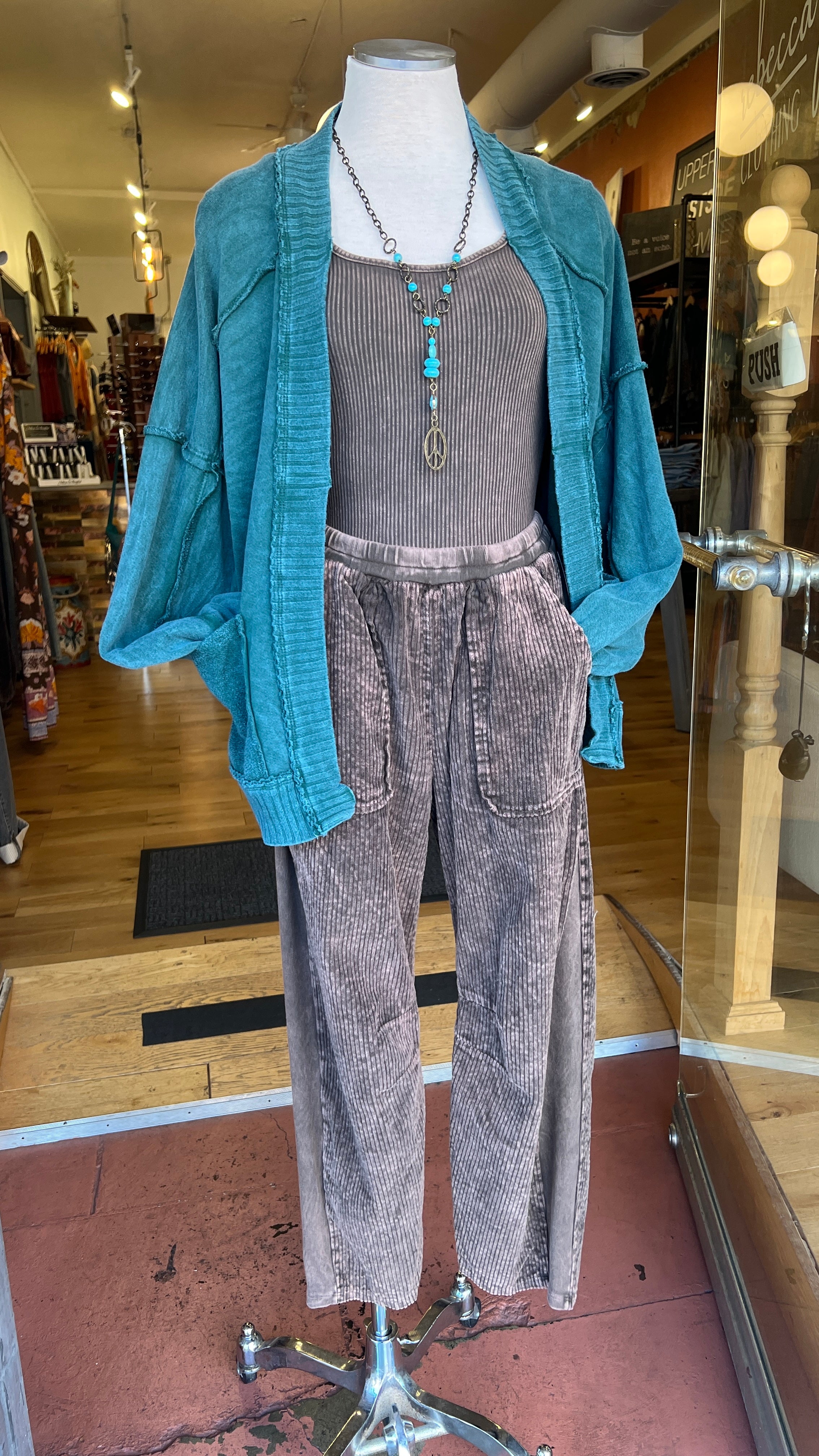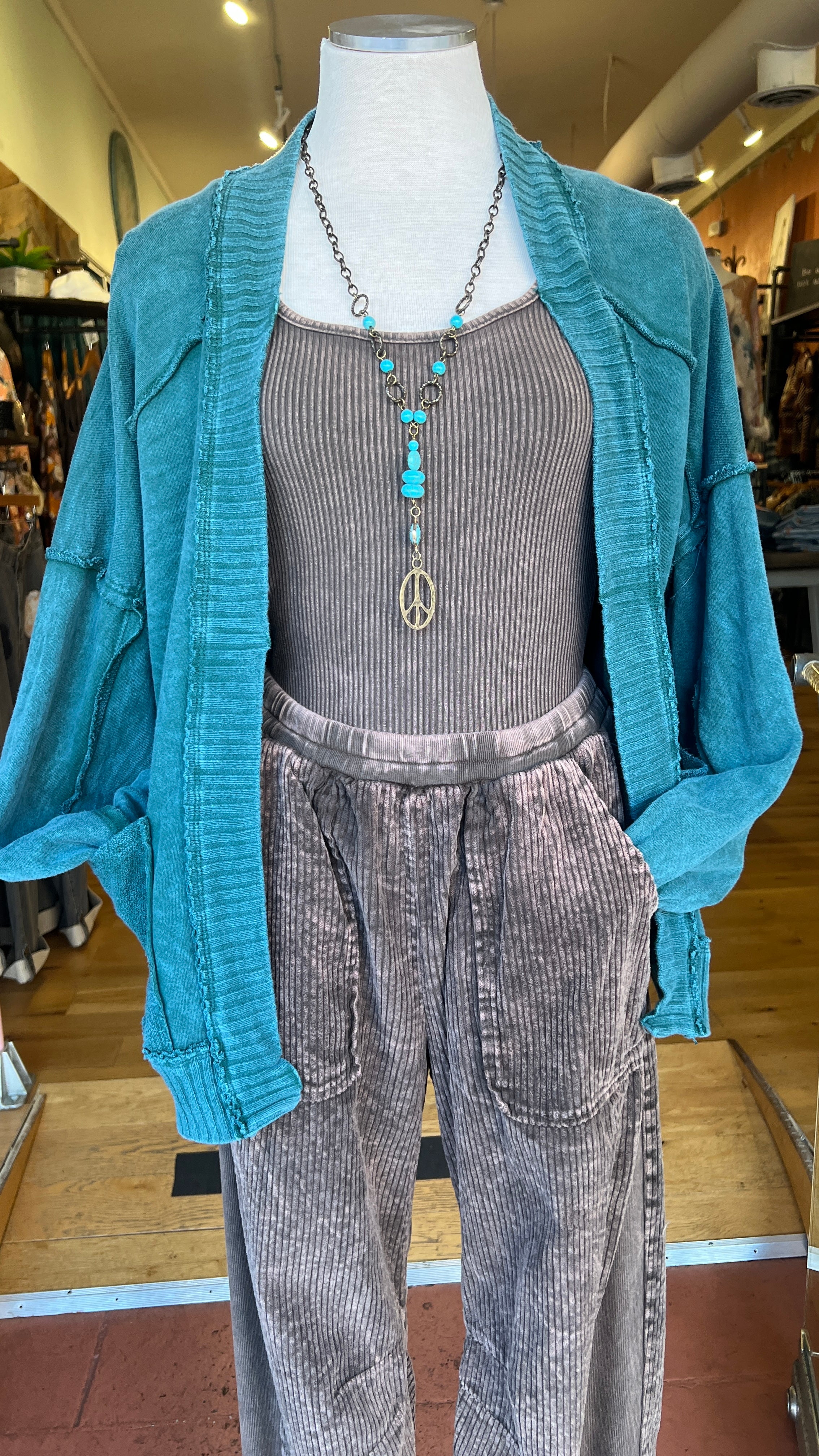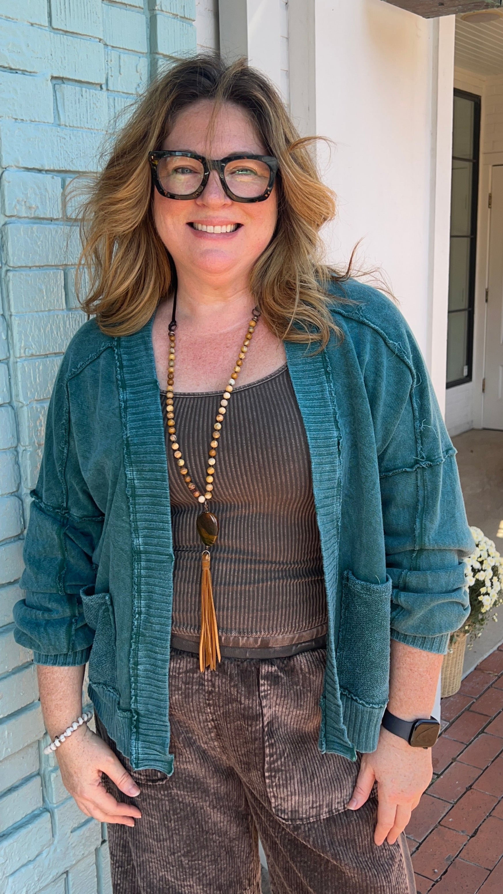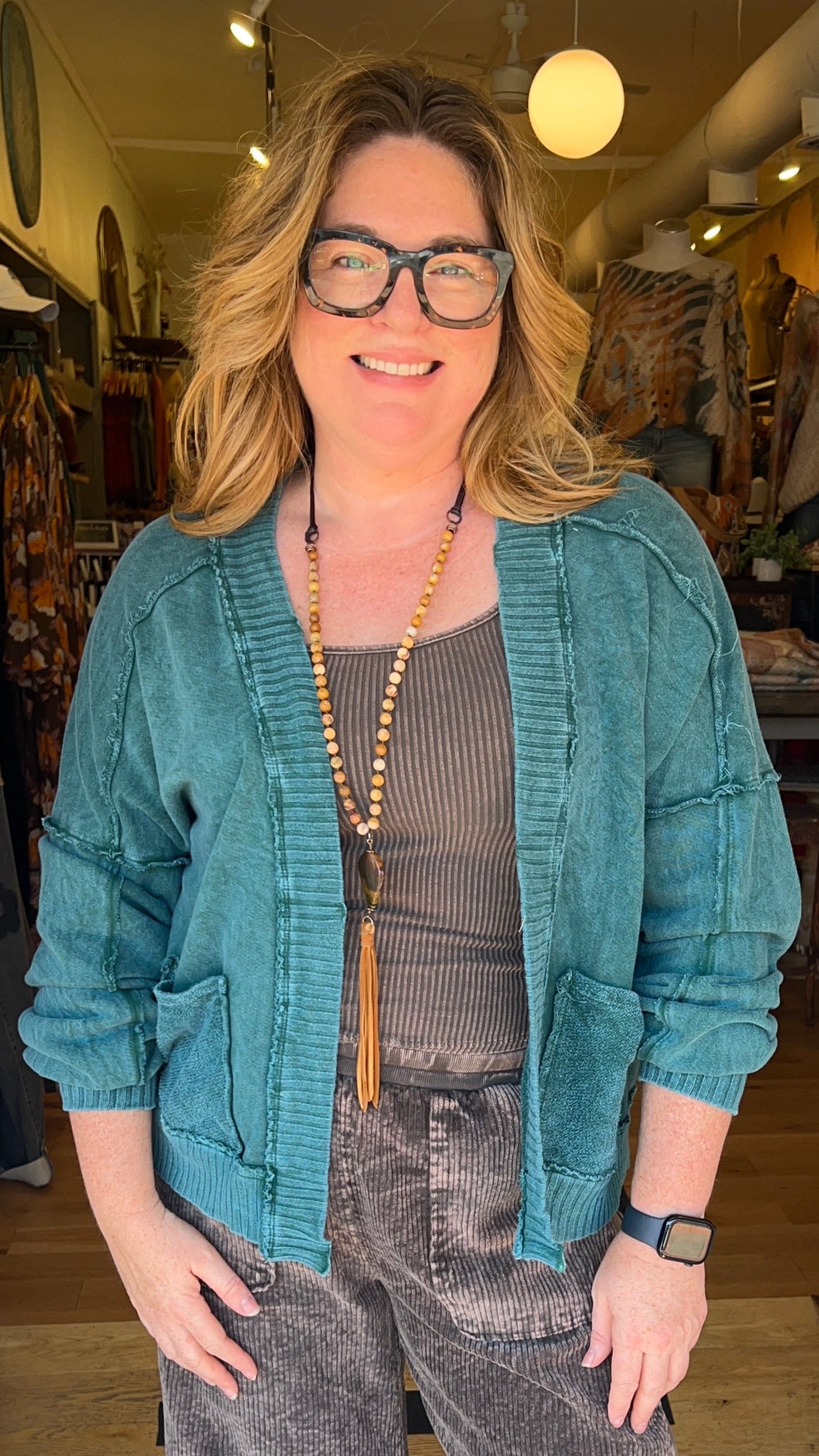 Wrap yourself in cozy fall comfort with the Midnight Green Cotton Terry Knit Cardigan. This oversized, slouchy cardigan is made from soft cotton terry knit fabric and finished with ribbed trim and raw-edge seams for that effortless boho appeal.