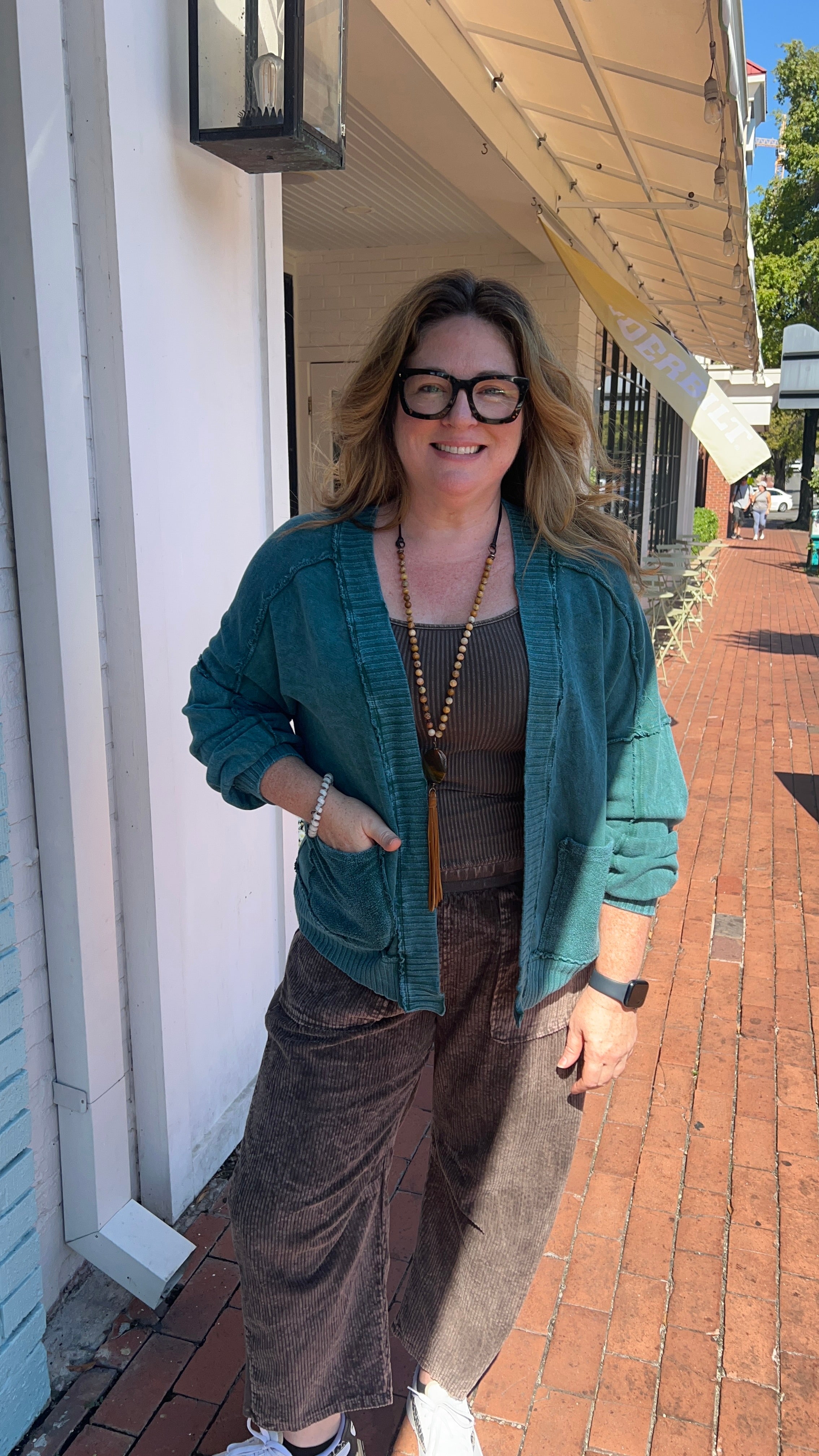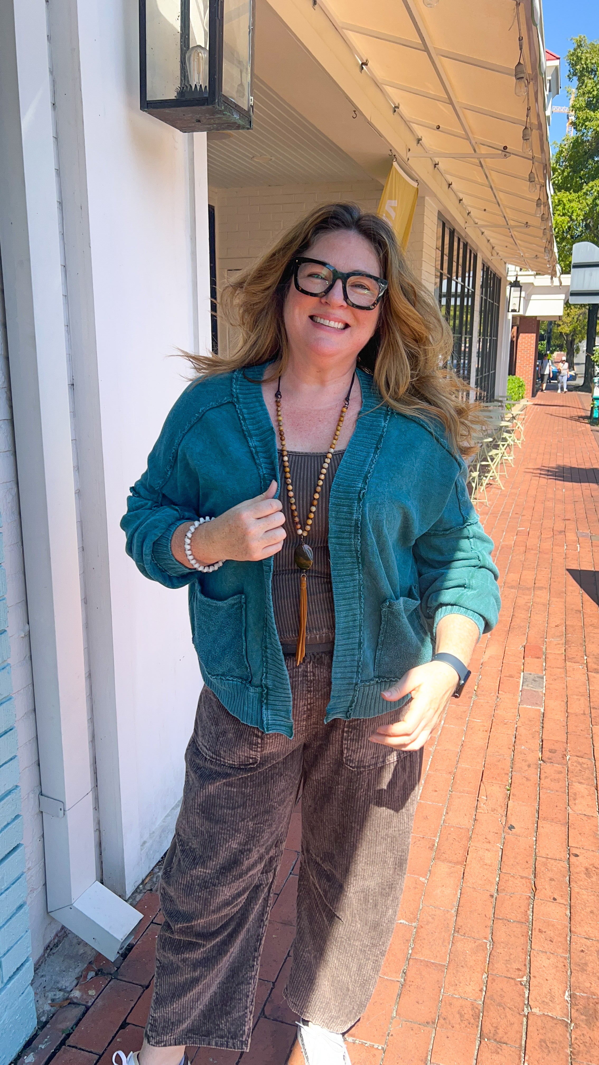 With deep pockets and a relaxed fit, it’s the perfect throw-on-and-go layer for cooler days. The rich midnight green hue adds a beautiful pop of color to your fall wardrobe — especially when paired with our Brown Corduroy Barrel Pants and a simple tank or graphic tee.